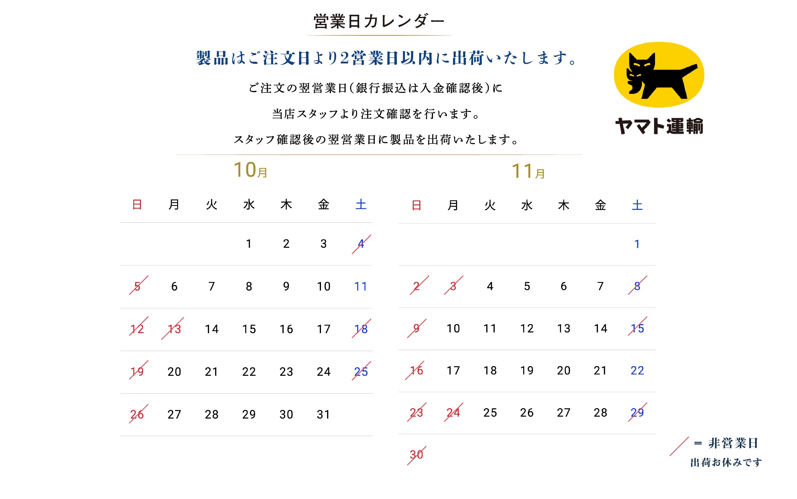 ※土日祝の稼働日はお手数ですが「出荷日・配送」欄の営業日カレンダーをご確認ください。