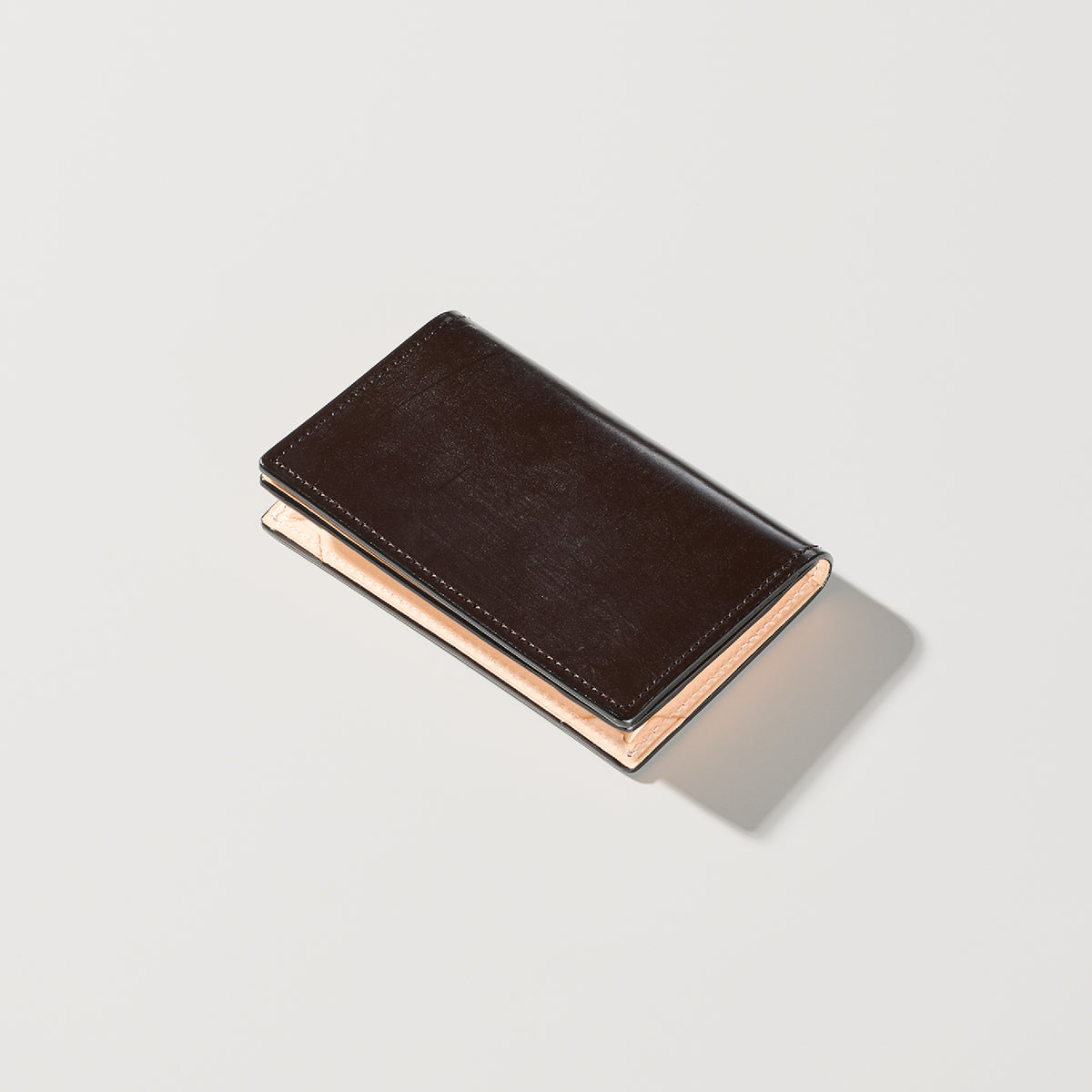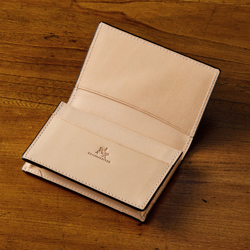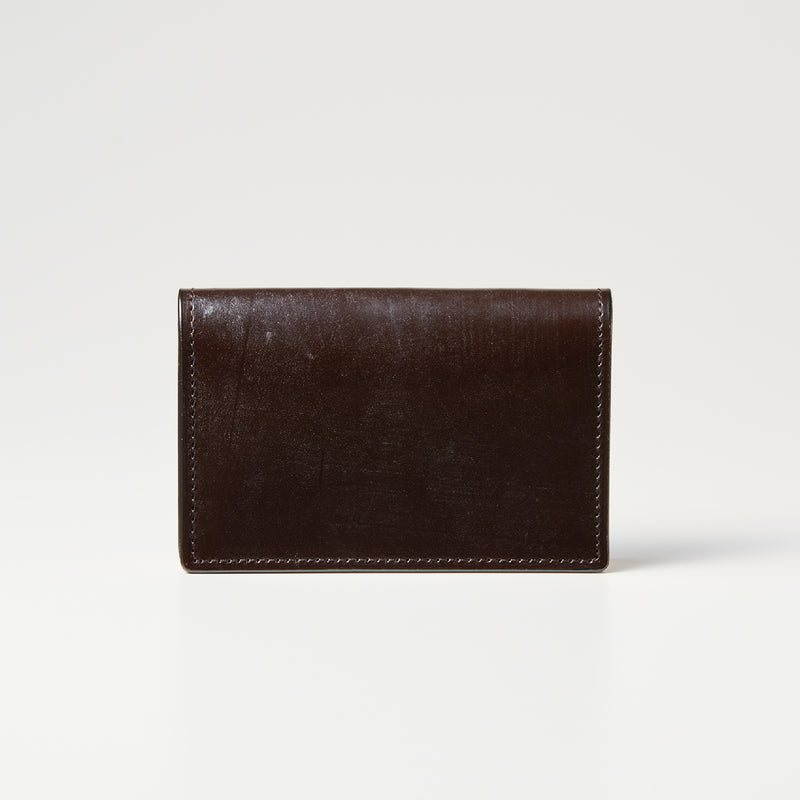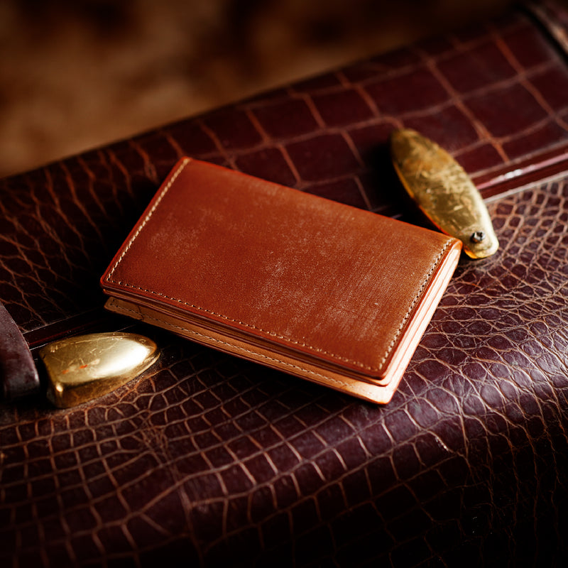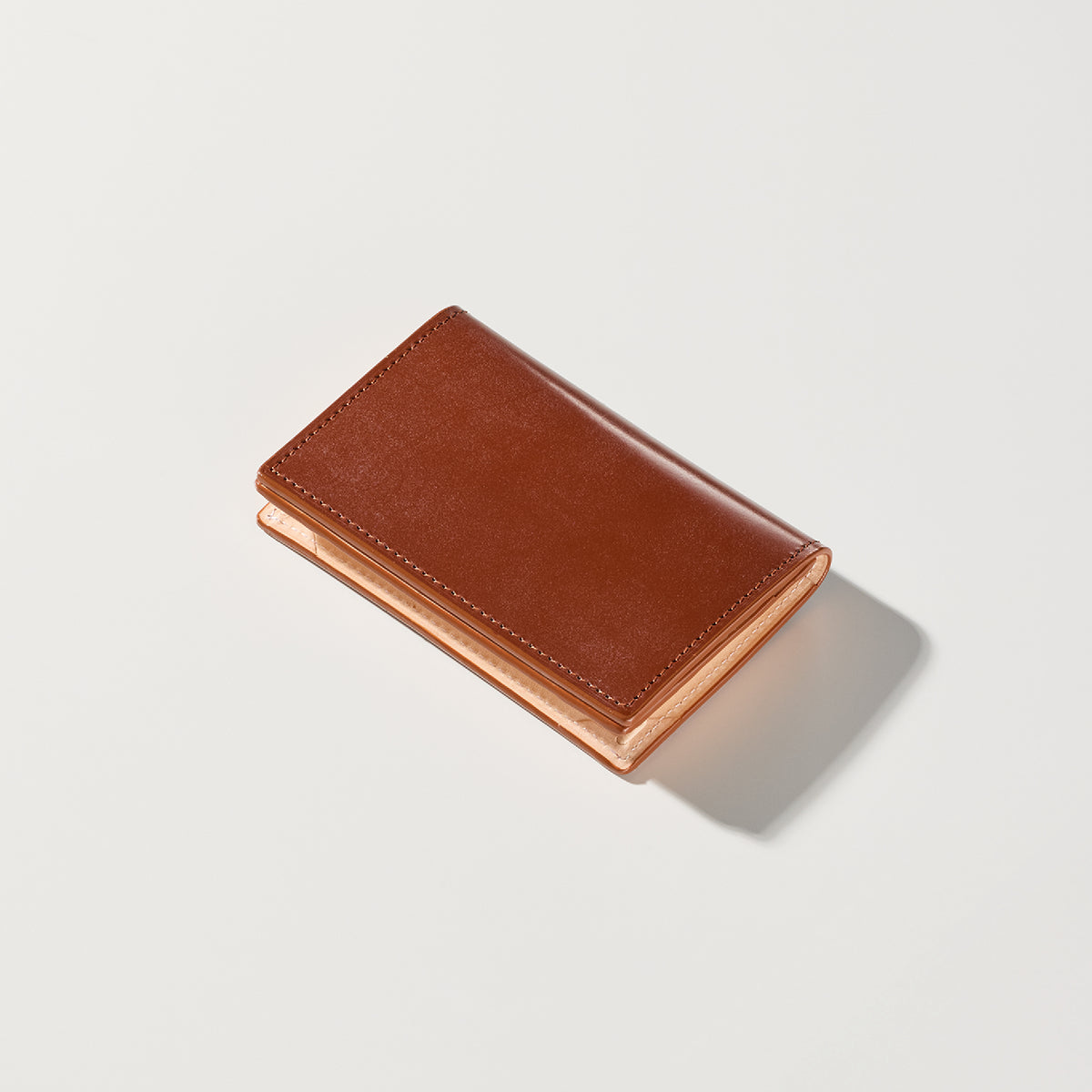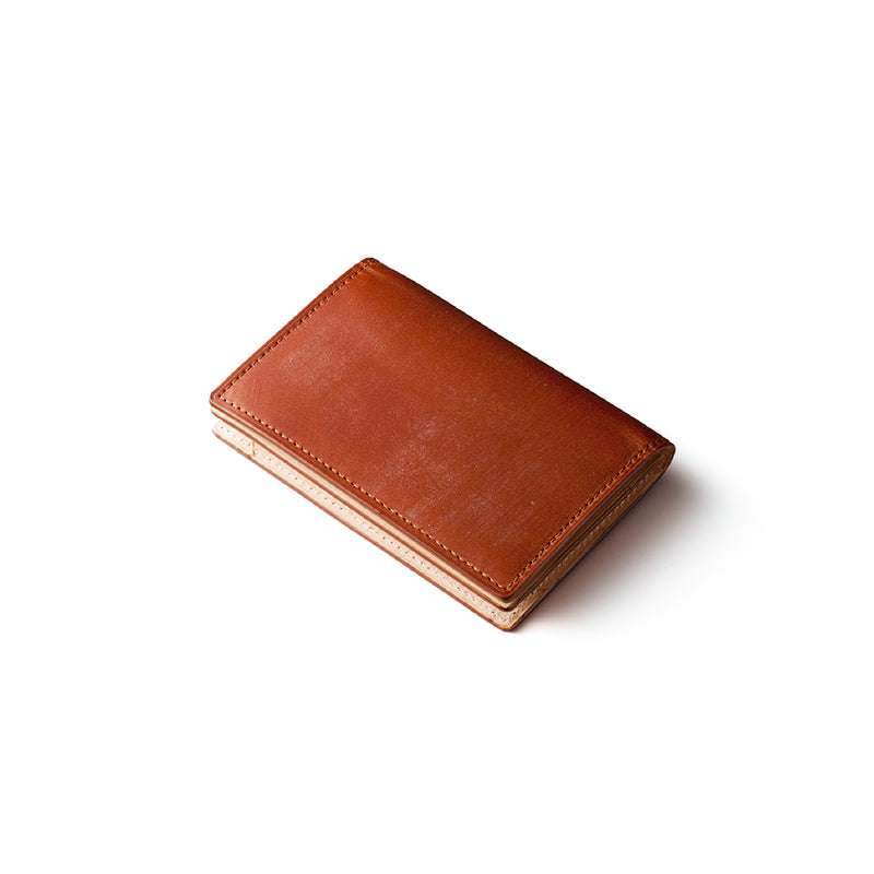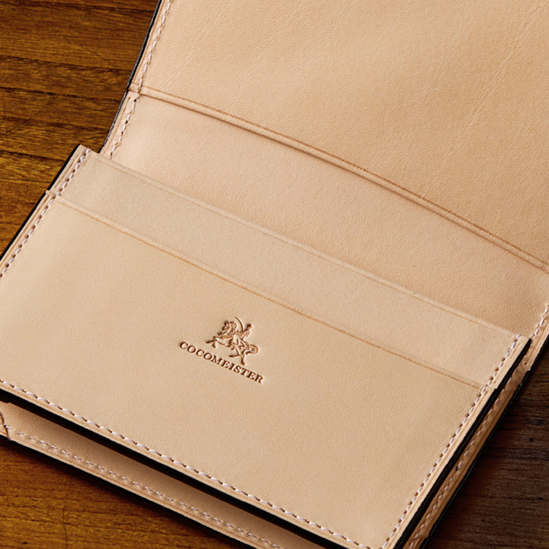 ココマイスターで一番売れ続けている「ブライドル&ヌメ革」シリーズ。英国馬具革ブライドルレザーと欧州ヌメ革のコンビネーションは、高級感溢れるブライドルの良さと、素朴で温かみあるヌメ革の魅力を同時に味わえます。シンプルでクラシカルな名刺入れです。通しマチと呼ばれる製法により製作、革を重ねた様なデザインがクラシカルで人気です。| 外寸 | 縦7.5cm×横11cm×厚さ1.5cm |