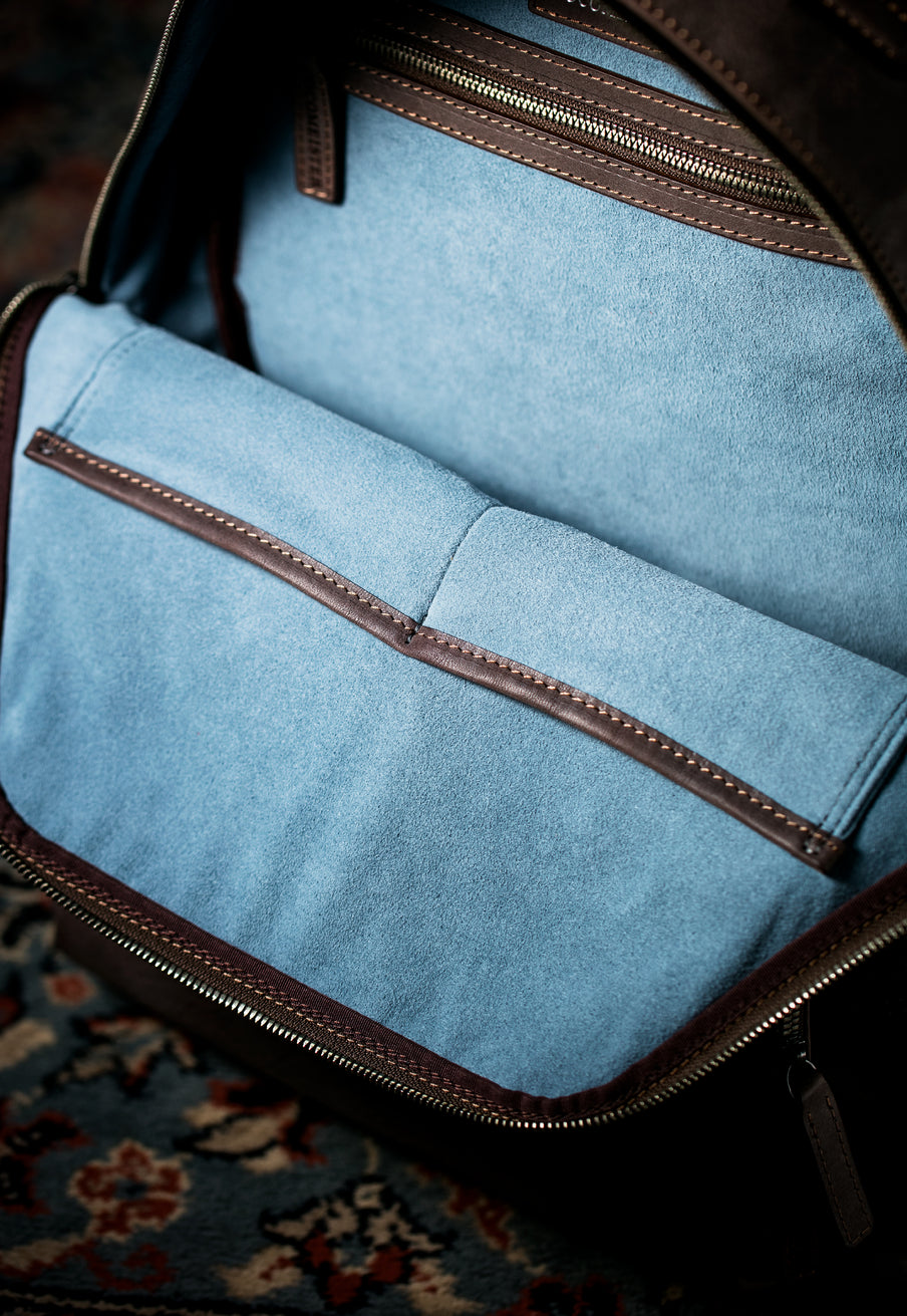 内装はスエードレザーを使用しており、肌触りよく取り出すことが出来ます。メインポケットの内装にはファスナーポケットと手前にはフリーポケットが装備されています。