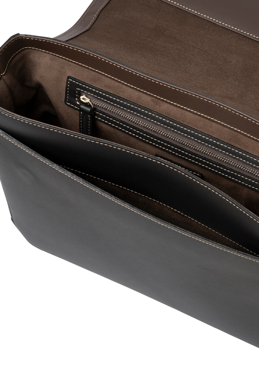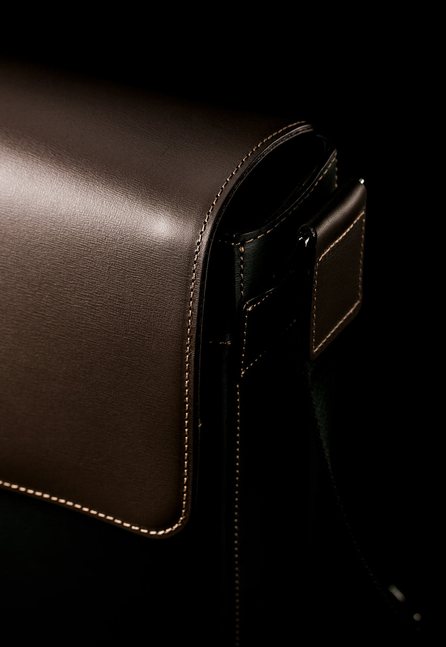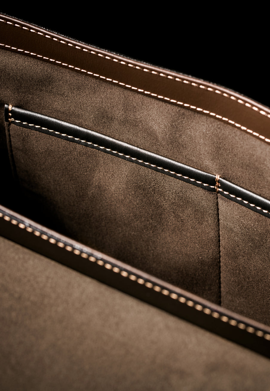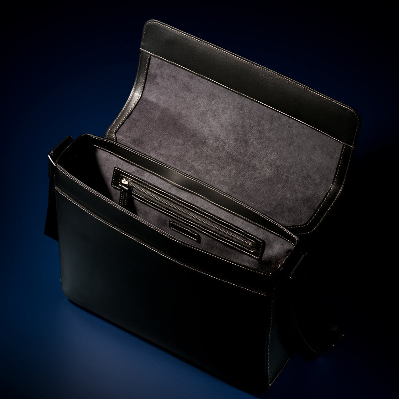 フランス産ボックスカーフを使用した、ハリと耐久性を備えたバッグ構造。