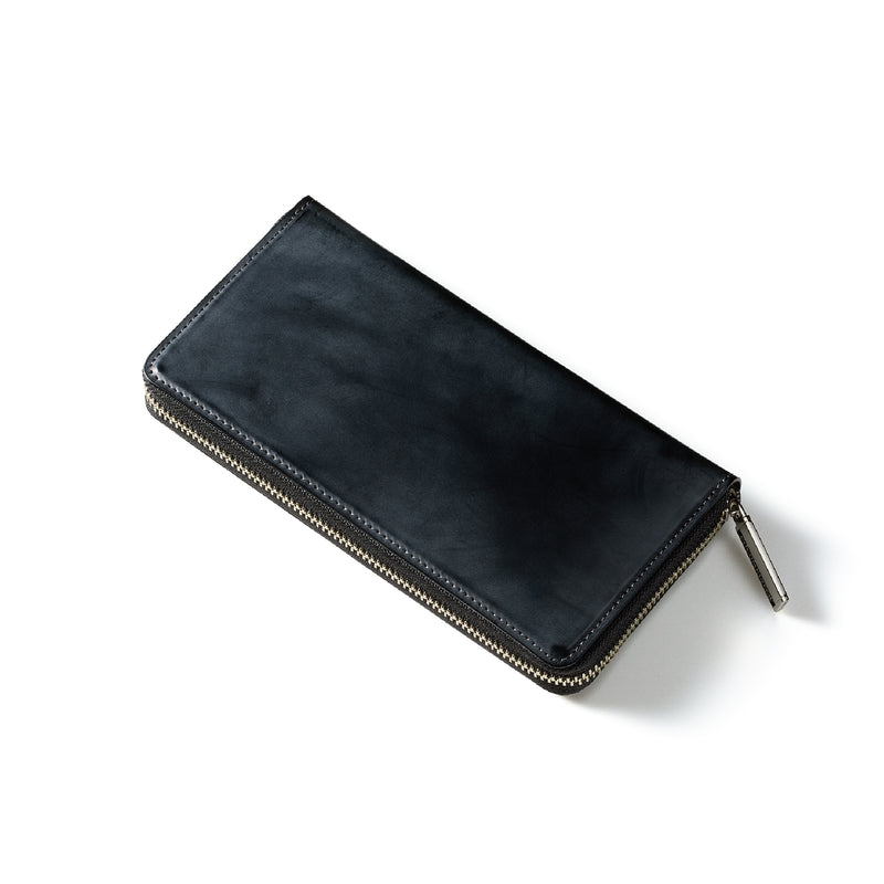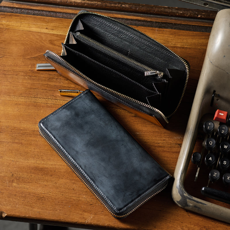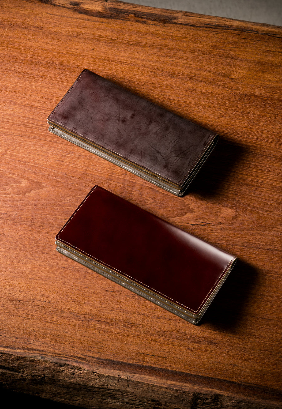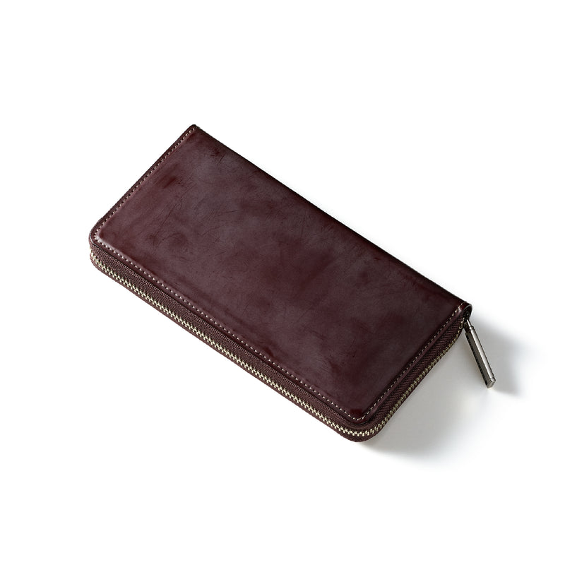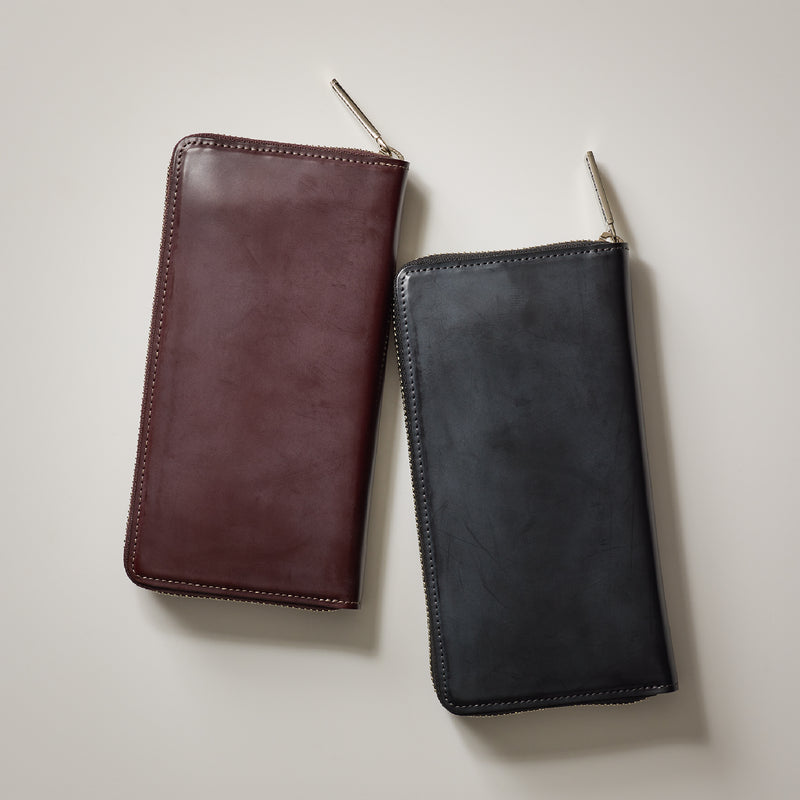 イギリスダービーステークスからイメージしてデザインされたコレクション。外装にはロウ引きコードバンを採用し、内装には英国純正オイルレザーを採用しました。イギリス仕込みの重厚感と高い完成度が魅力的。エイジングご堪能頂けます。ラウンドジップ型の長財布で、容量が大きめで使い勝手が良いのが特徴。コードバンの重厚感をダイレクトに楽しめるクラシカルなラウンドジップです。| 外寸 | 縦10.2cm×横19.2cm×厚さ3cm |