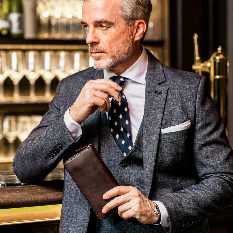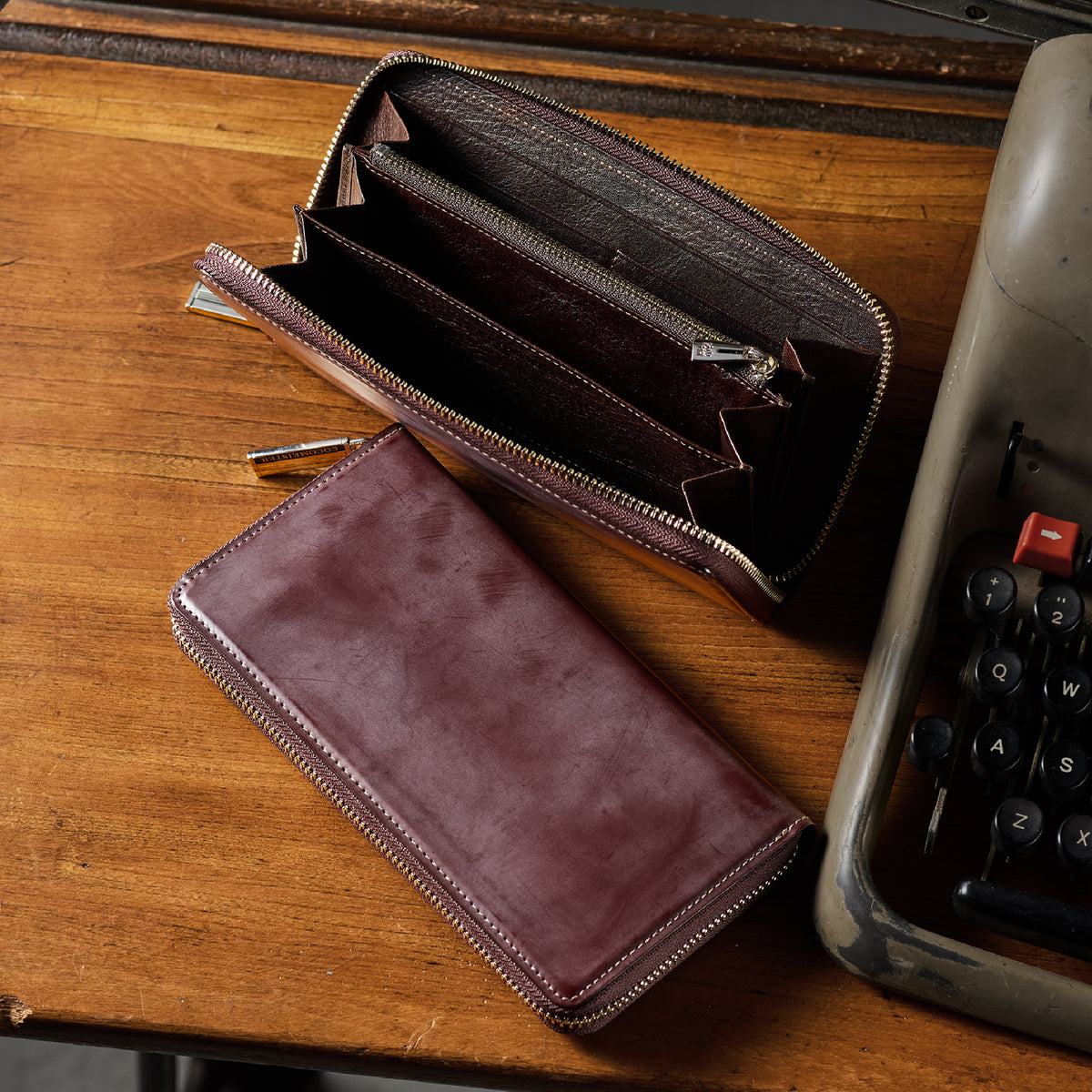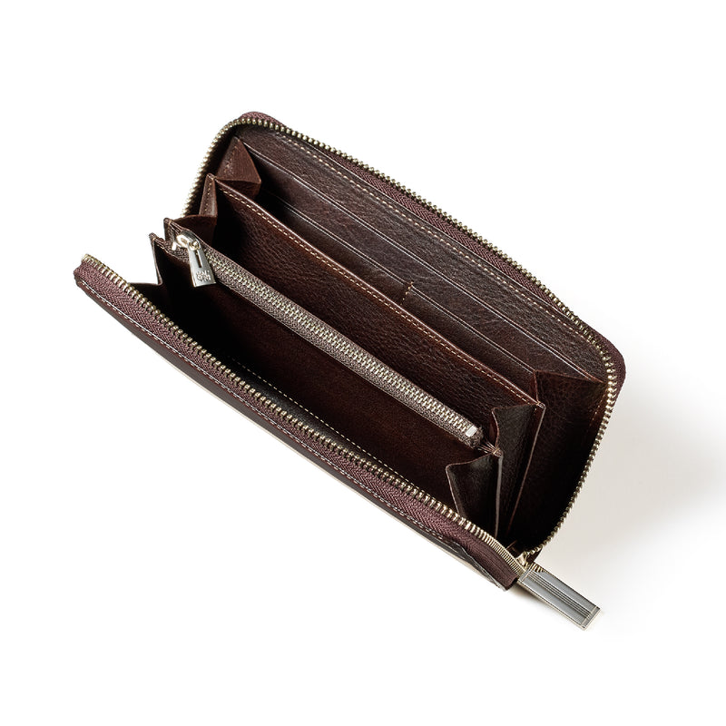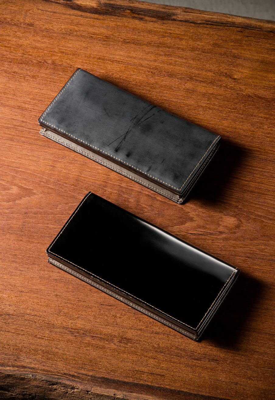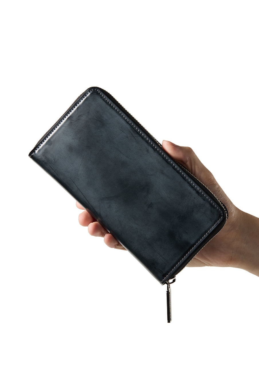 イギリスダービーステークスからイメージしてデザインされたコレクション。外装にはロウ引きコードバンを採用し、内装には英国純正オイルレザーを採用しました。イギリス仕込みの重厚感と高い完成度が魅力的。エイジングご堪能頂けます。ラウンドジップ型の長財布で、容量が大きめで使い勝手が良いのが特徴。コードバンの重厚感をダイレクトに楽しめるクラシカルなラウンドジップです。| 外寸 | 縦10.2cm×横19.2cm×厚さ3cm |
