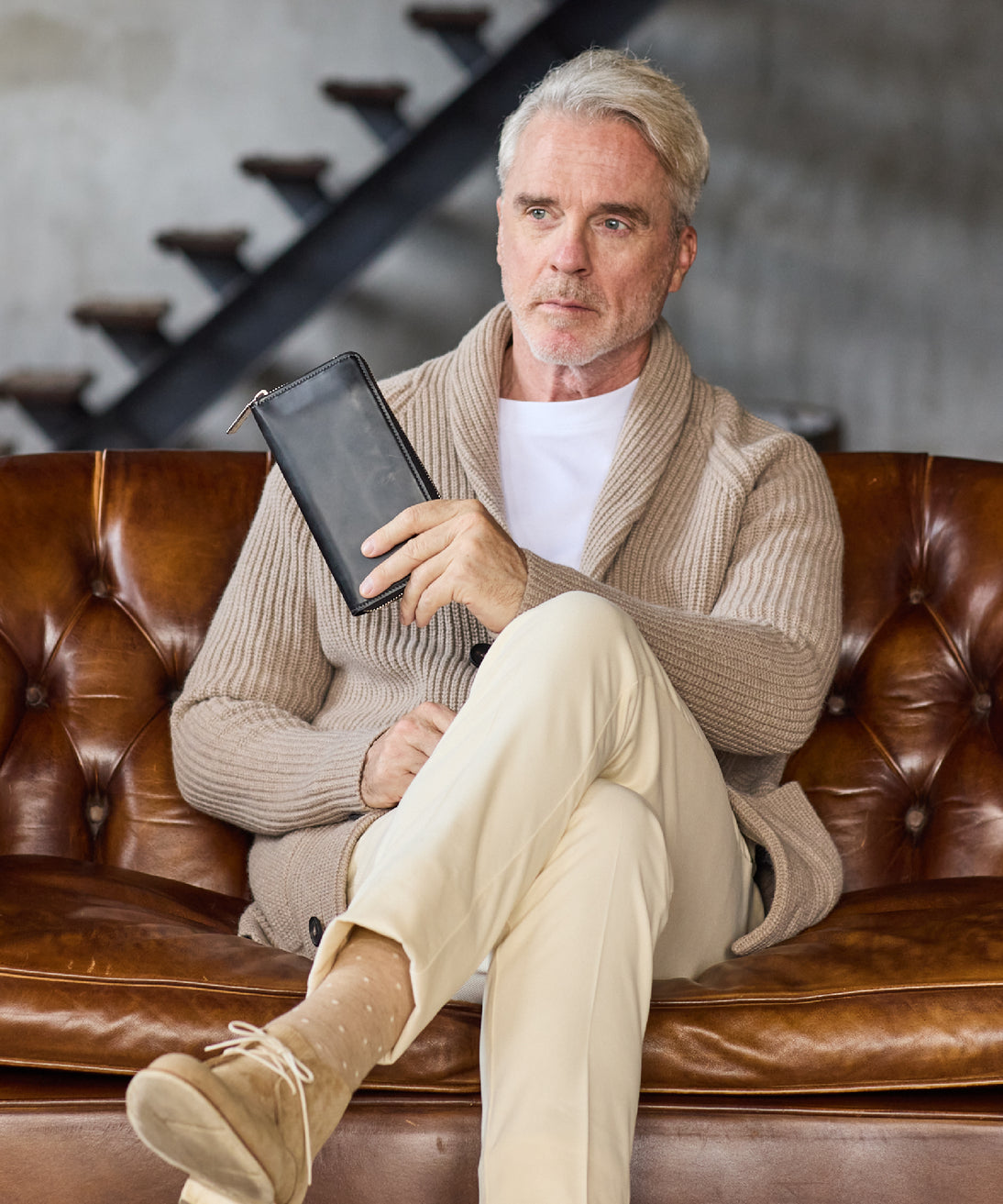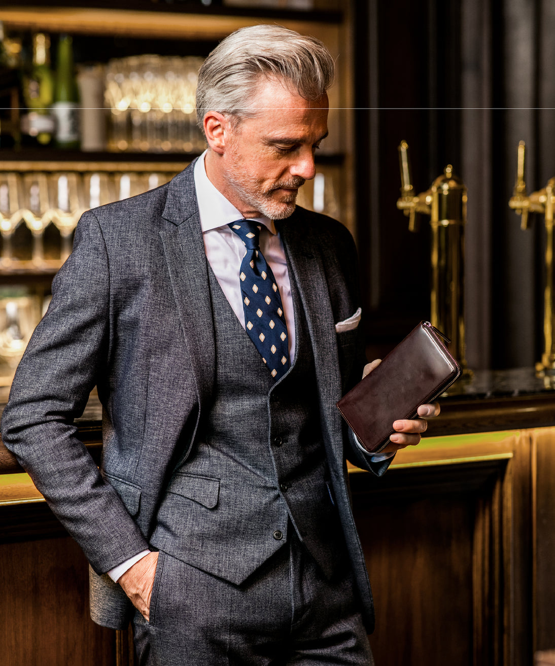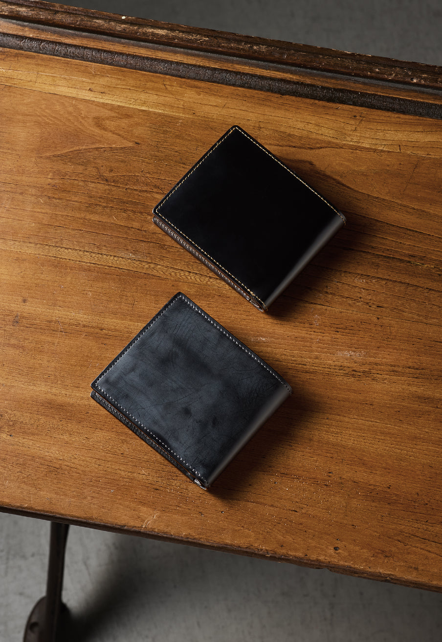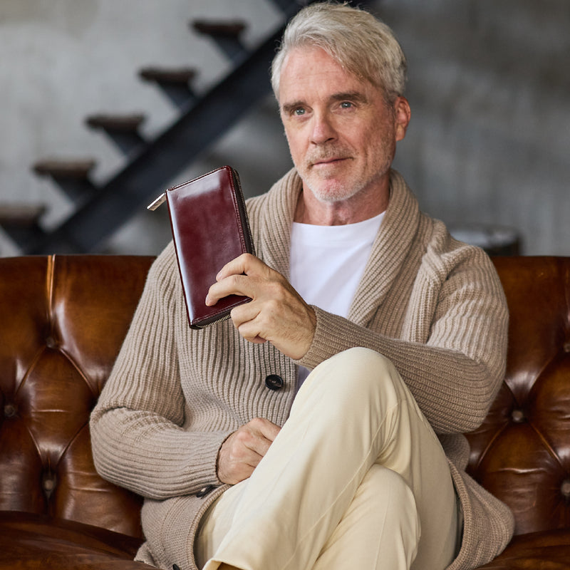 ロウ引きコードバンの曇りある質感が、重厚で端正な表情を描き出します。