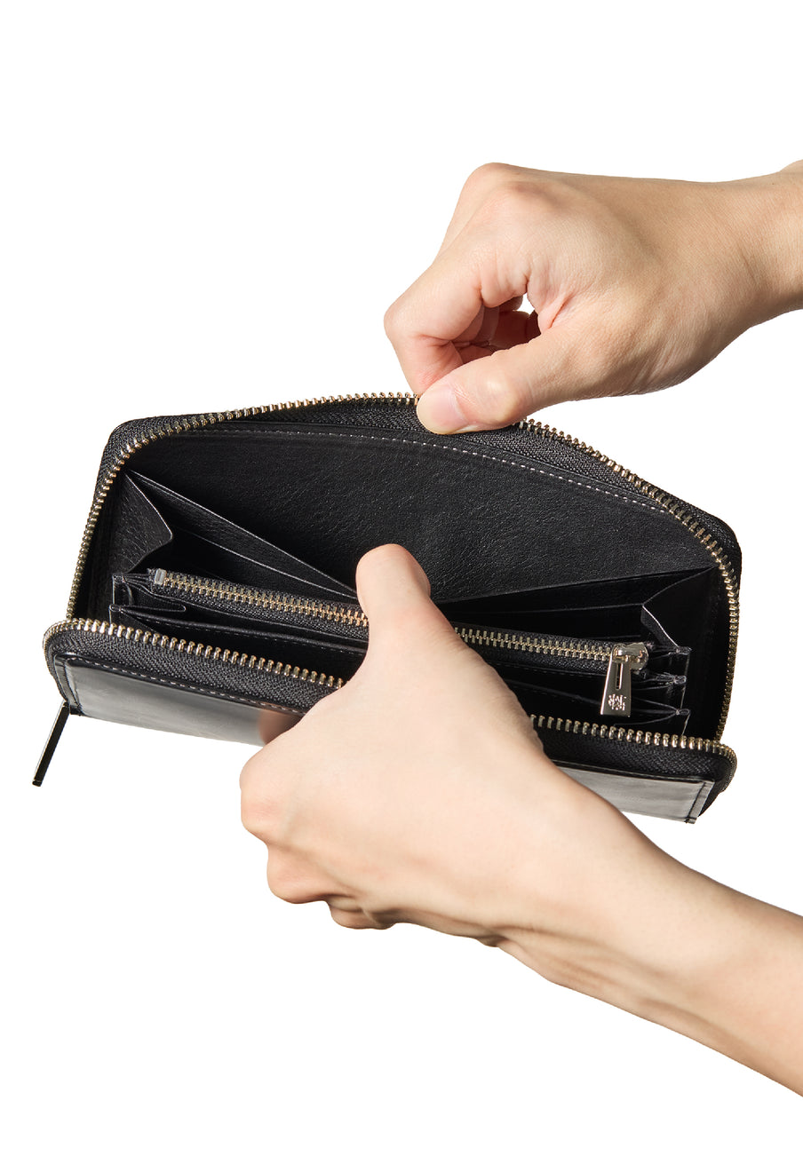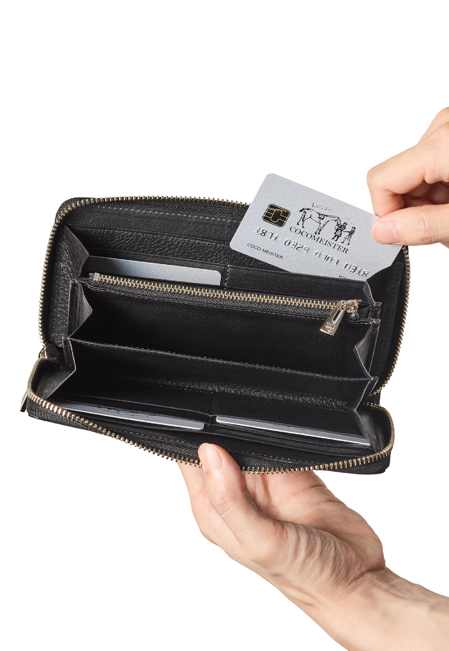 少し大きめの容量を誇るラウンドジップ長財布です。領収書の仕分けやカードを多めに入れたりと便利です。