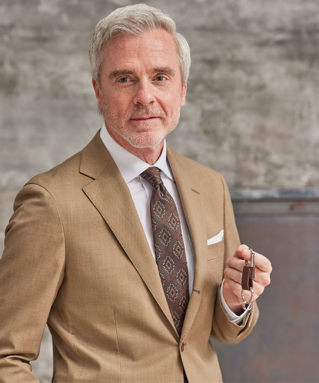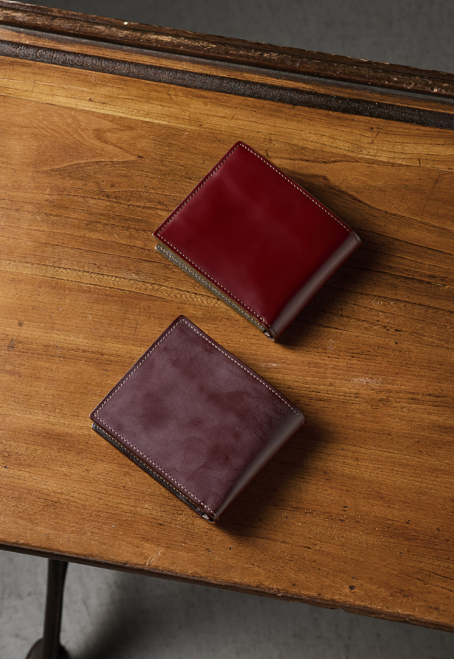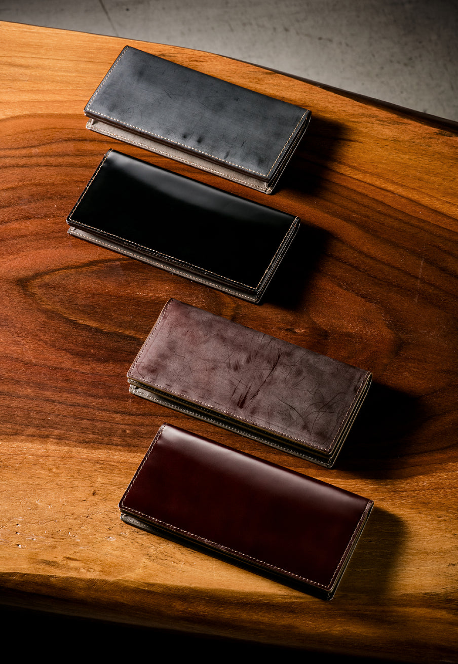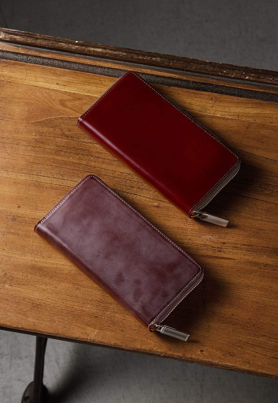 ロウ引きコードバンの曇りある質感が、重厚で端正な表情を描き出します。