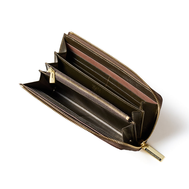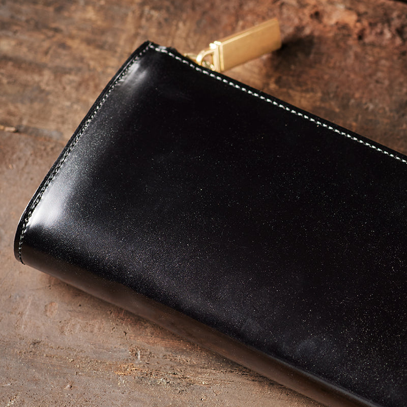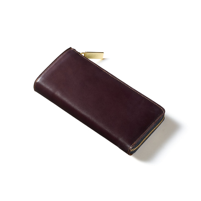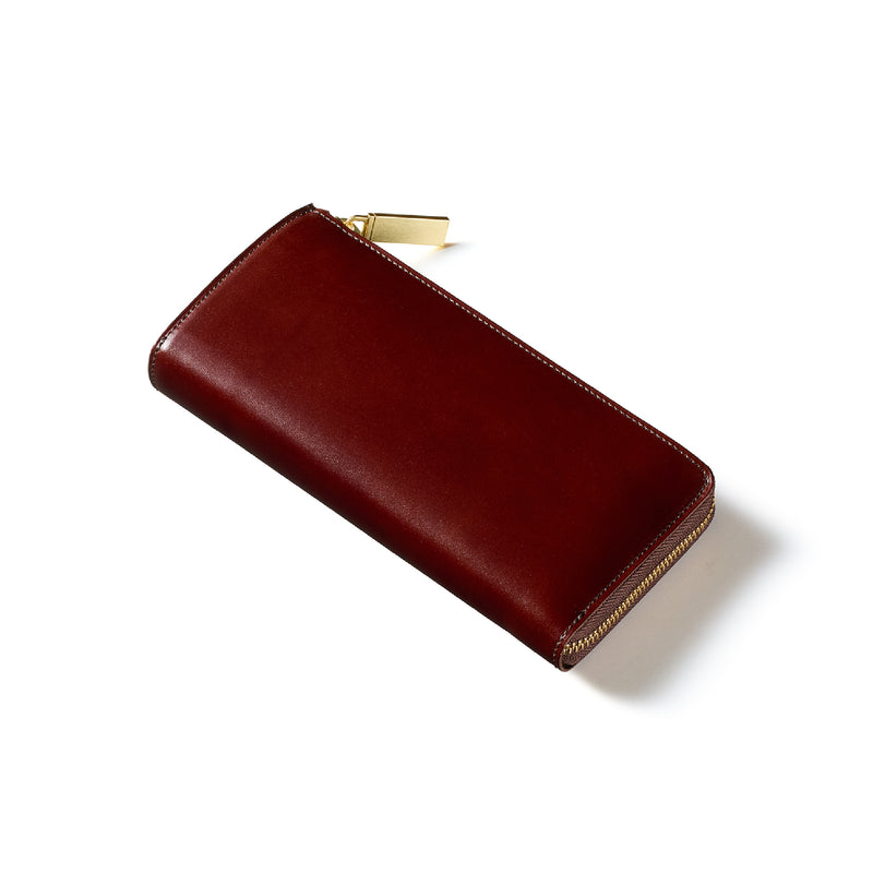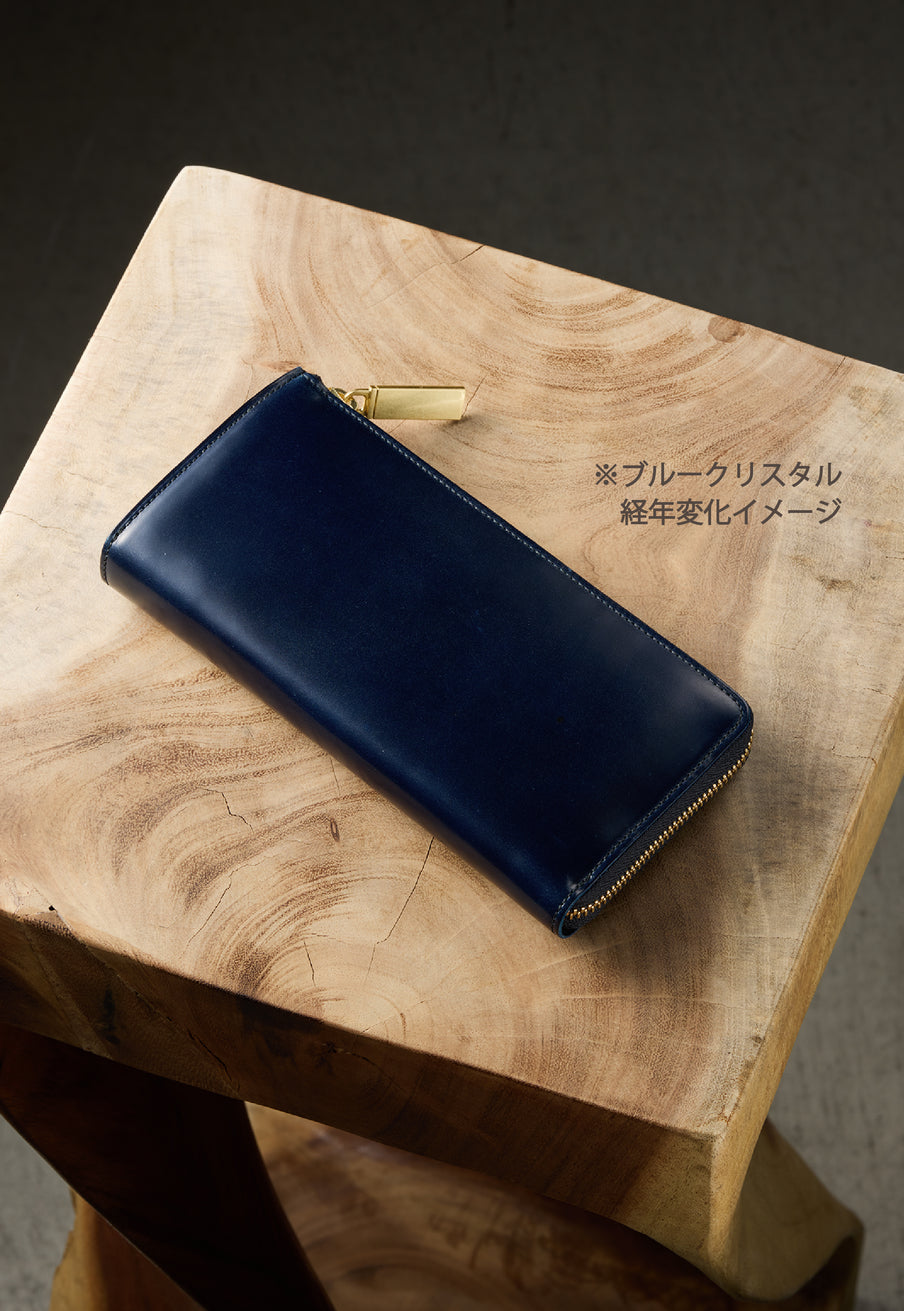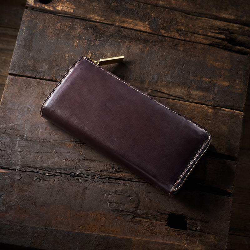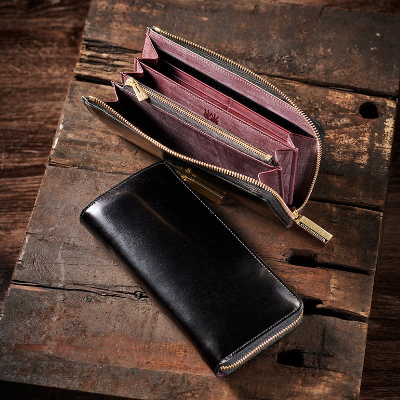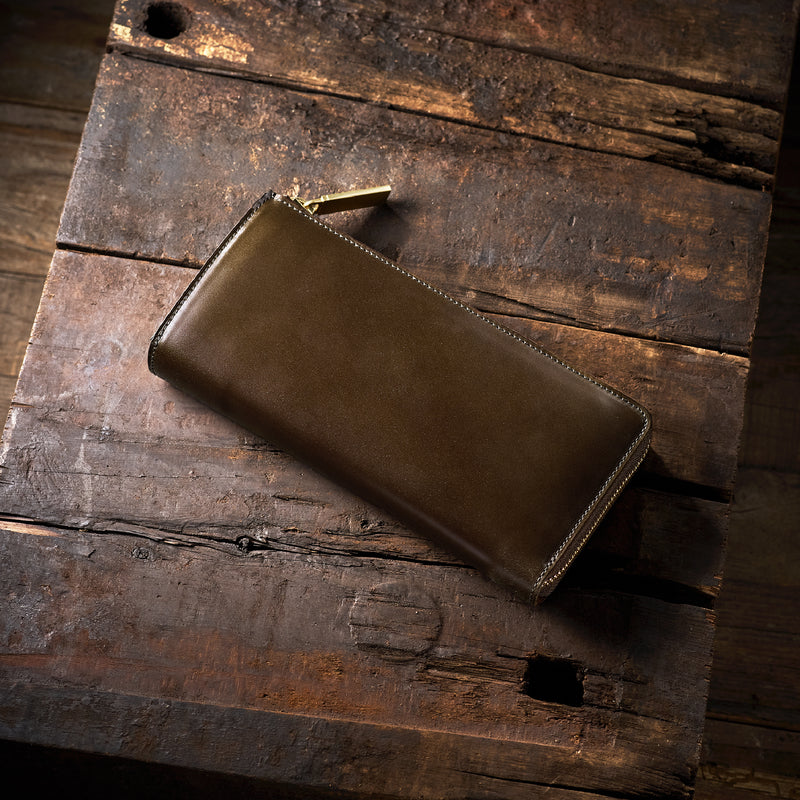 英国のクルーという街からイメージしたコードバンクルーです。オイルコードバンと、オークバークレザーという希少な素材を組み合わせ、特別な職人が仕立てた優美なフォルム、存在感が魅力のシリーズ。L字型のラウンドジップ長財布は、ファスナー部分がL字で作られており、開け閉めし易いのが特徴です。L字型でありながら、重厚感と存在感はしっかりと楽しめる仕上がりです。| 外寸 | 縦9.8×横19.7×厚さ3.5cm 開いた時の幅10cm |