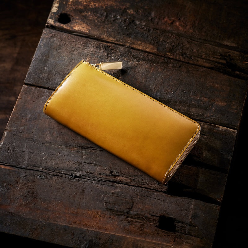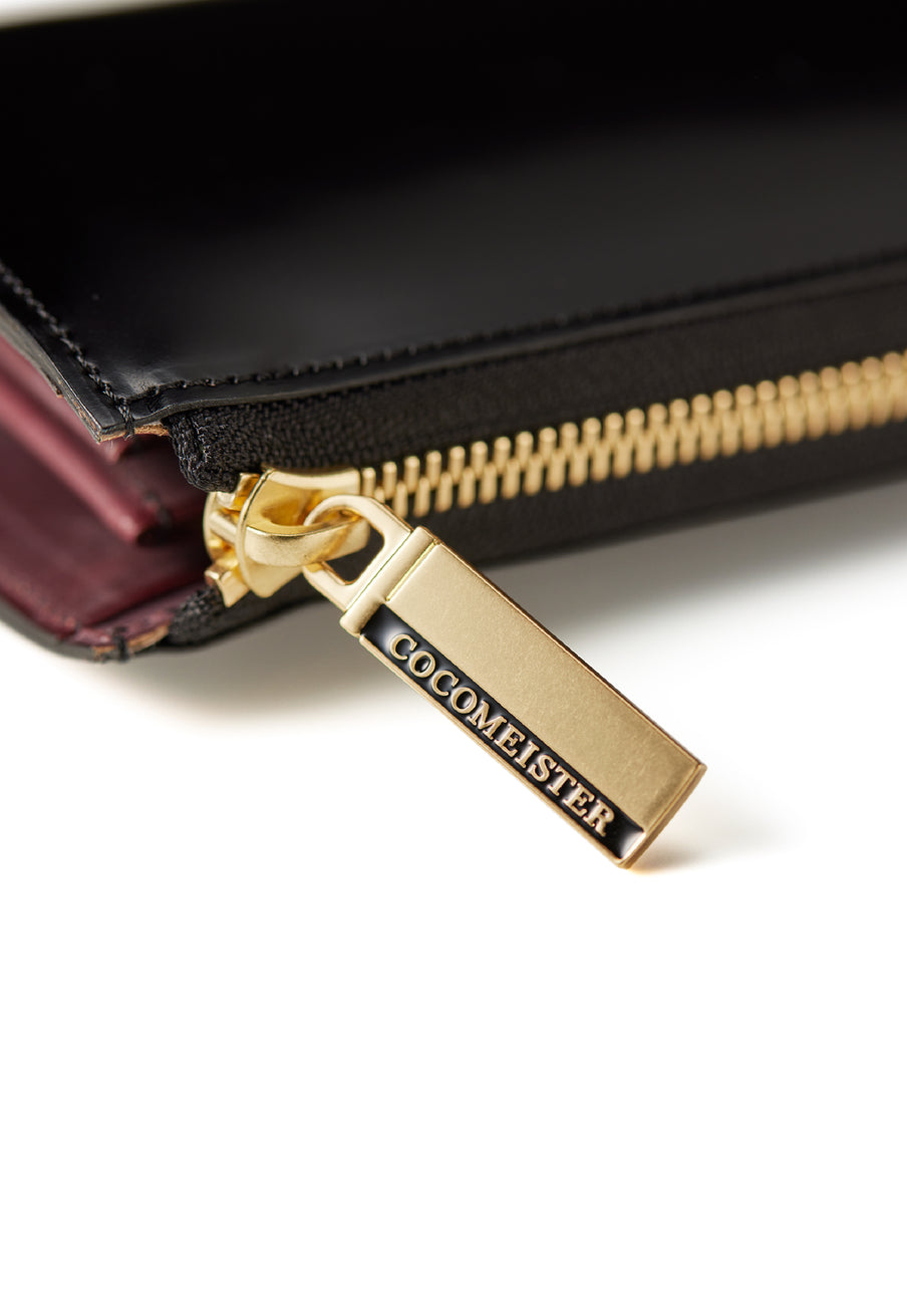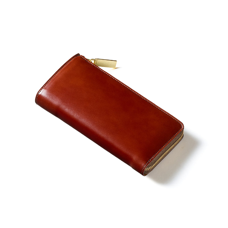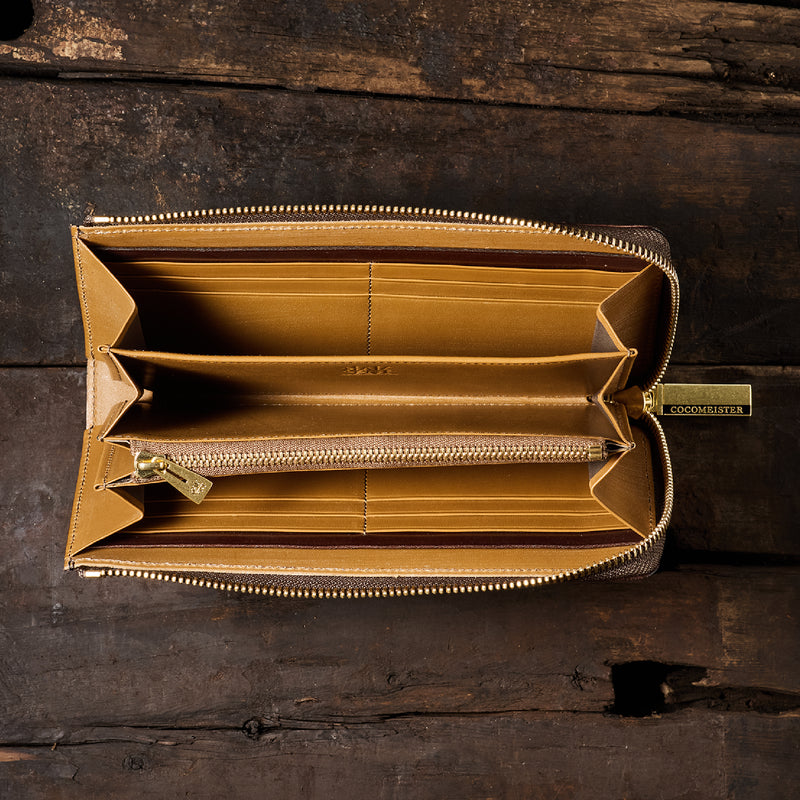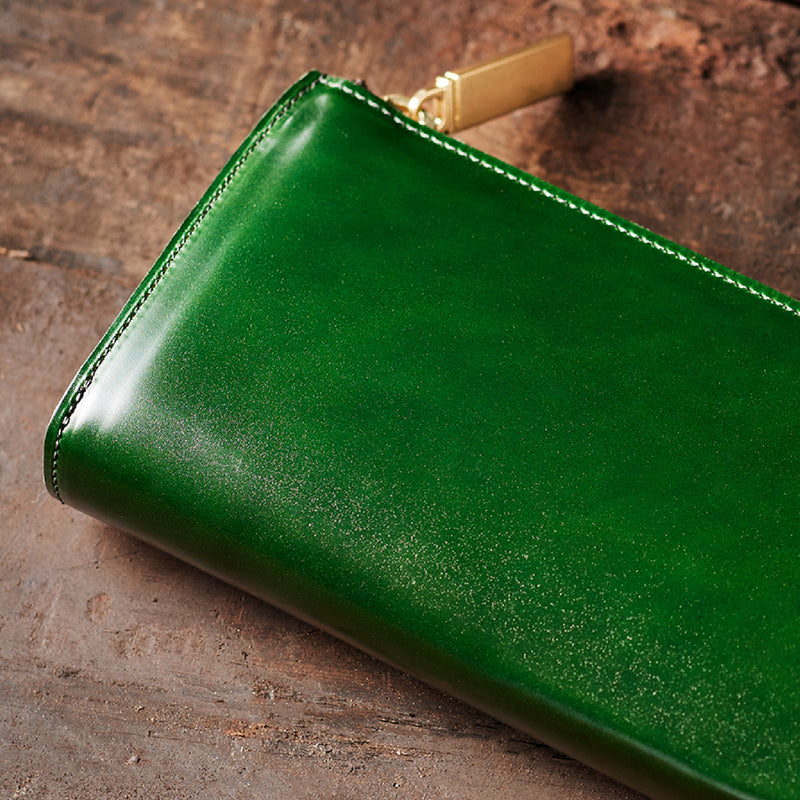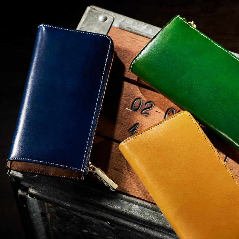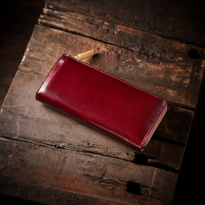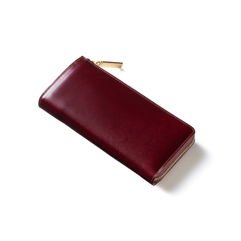 英国のクルーという街からイメージしたコードバンクルーです。オイルコードバンと、オークバークレザーという希少な素材を組み合わせ、特別な職人が仕立てた優美なフォルム、存在感が魅力のシリーズ。L字型のラウンドジップ長財布は、ファスナー部分がL字で作られており、開け閉めし易いのが特徴です。L字型でありながら、重厚感と存在感はしっかりと楽しめる仕上がりです。| 外寸 | 縦9.8×横19.7×厚さ3.5cm 開いた時の幅10cm |