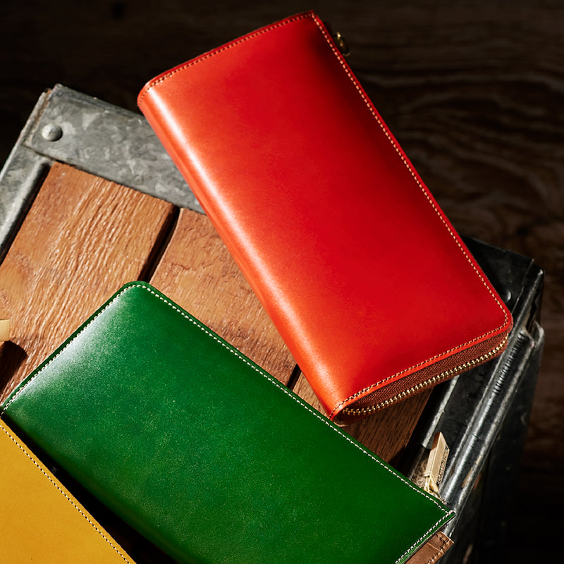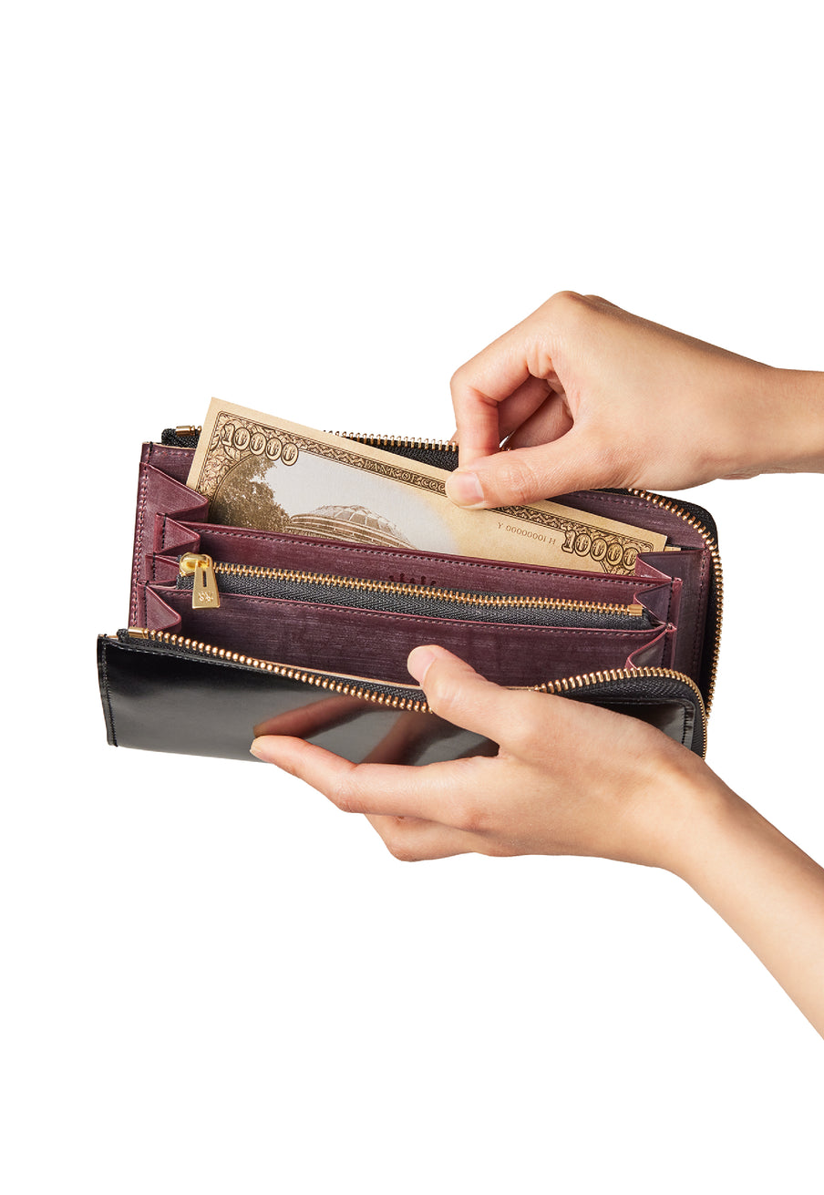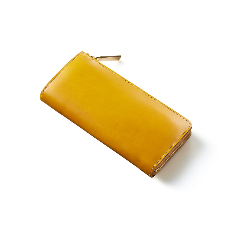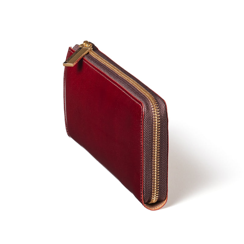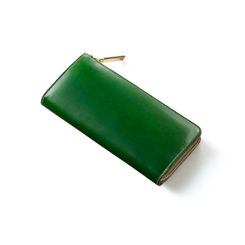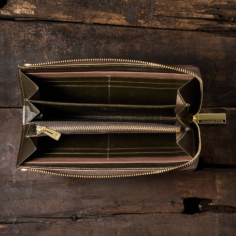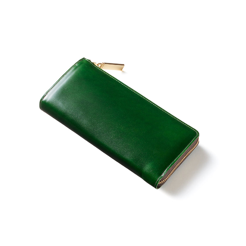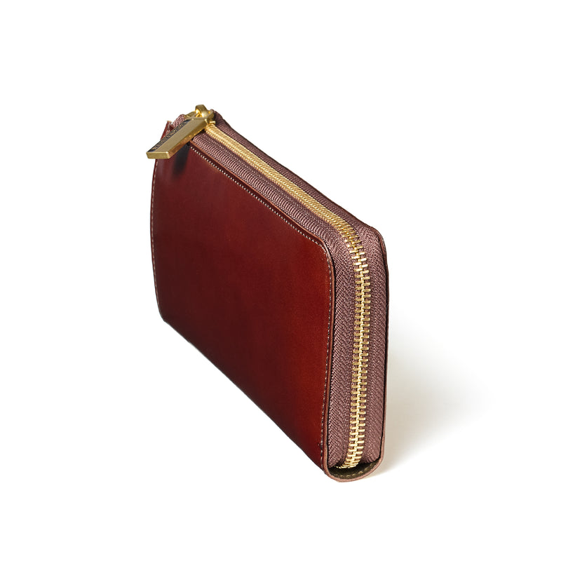 英国のクルーという街からイメージしたコードバンクルーです。オイルコードバンと、オークバークレザーという希少な素材を組み合わせ、特別な職人が仕立てた優美なフォルム、存在感が魅力のシリーズ。L字型のラウンドジップ長財布は、ファスナー部分がL字で作られており、開け閉めし易いのが特徴です。L字型でありながら、重厚感と存在感はしっかりと楽しめる仕上がりです。| 外寸 | 縦9.8×横19.7×厚さ3.5cm 開いた時の幅10cm |