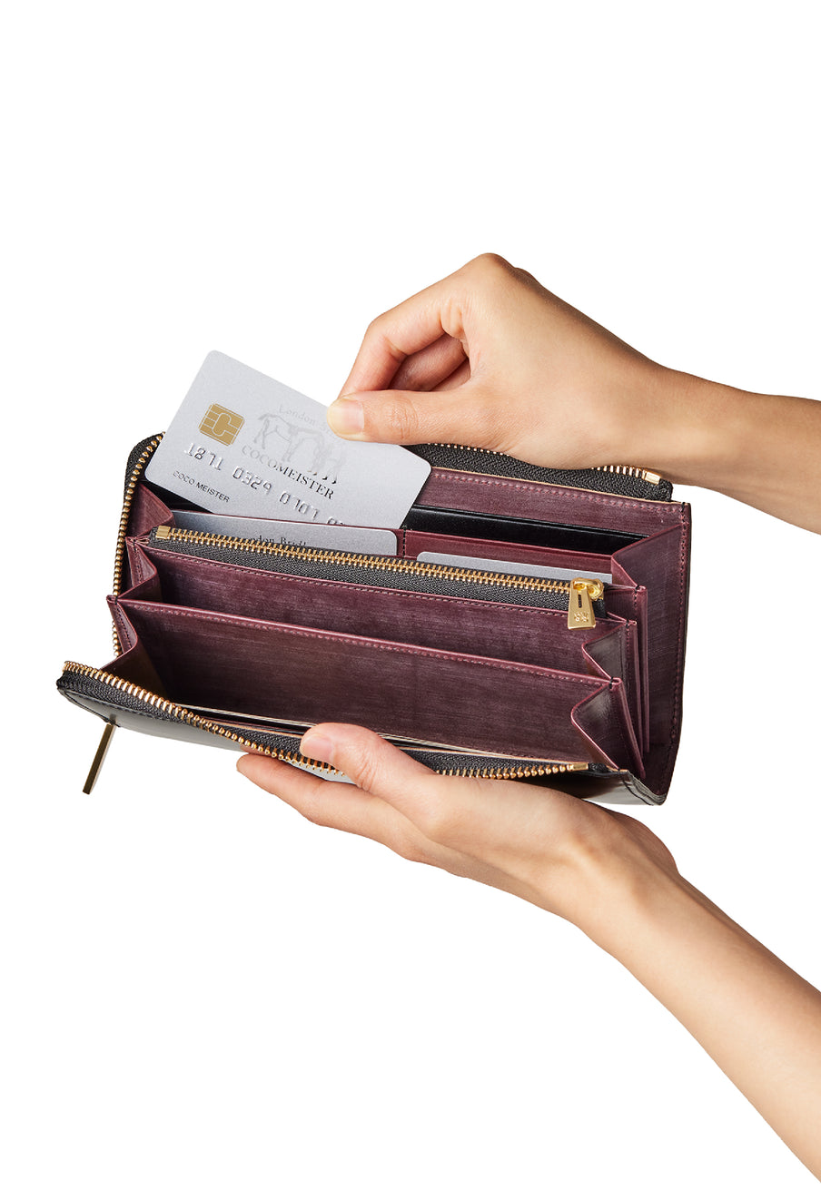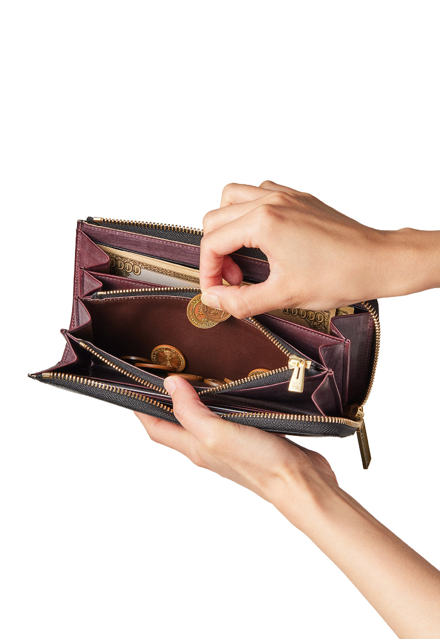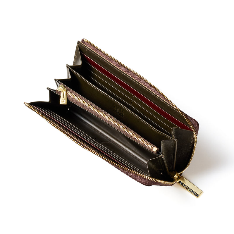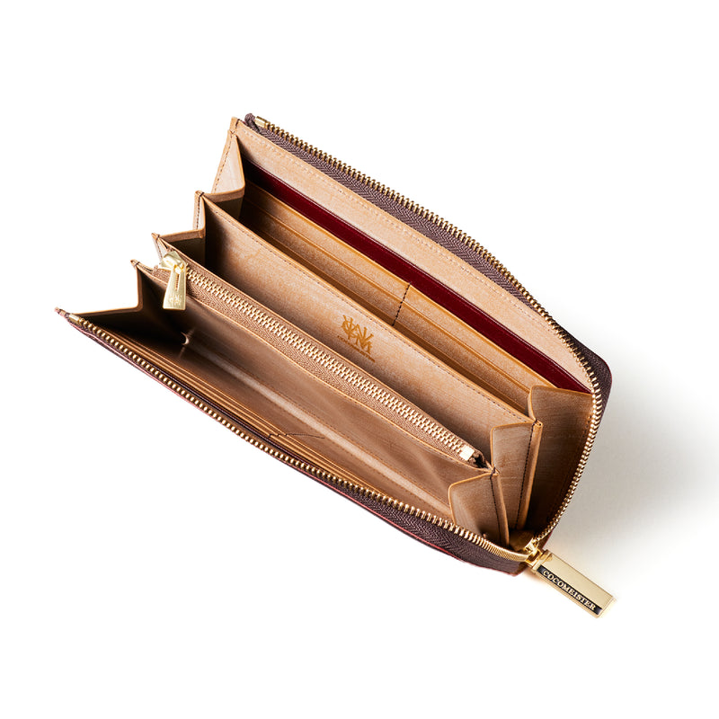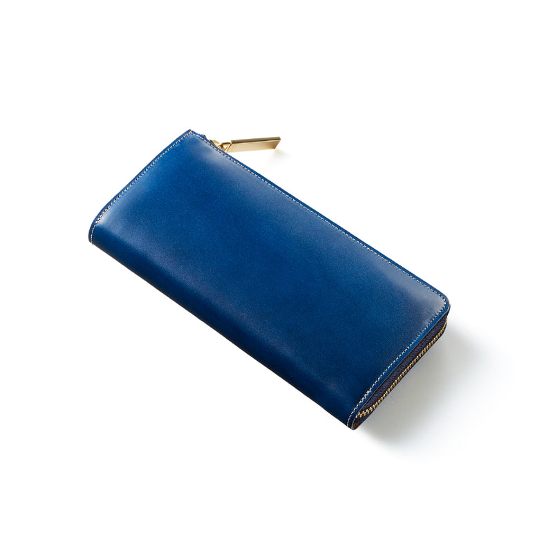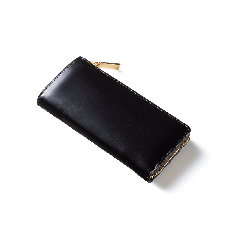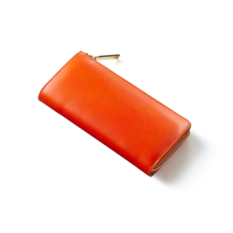 英国のクルーという街からイメージしたコードバンクルーです。オイルコードバンと、オークバークレザーという希少な素材を組み合わせ、特別な職人が仕立てた優美なフォルム、存在感が魅力のシリーズ。L字型のラウンドジップ長財布は、ファスナー部分がL字で作られており、開け閉めし易いのが特徴です。L字型でありながら、重厚感と存在感はしっかりと楽しめる仕上がりです。| 外寸 | 縦9.8×横19.7×厚さ3.5cm 開いた時の幅10cm |