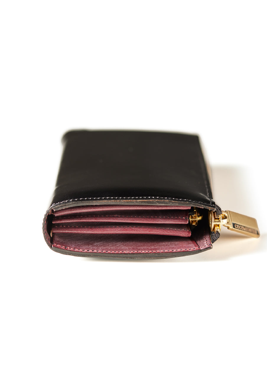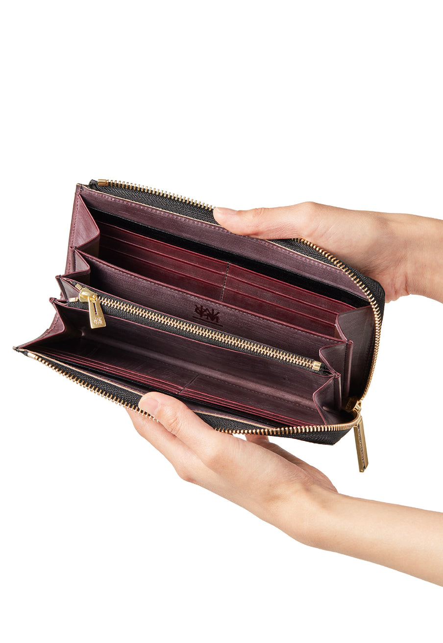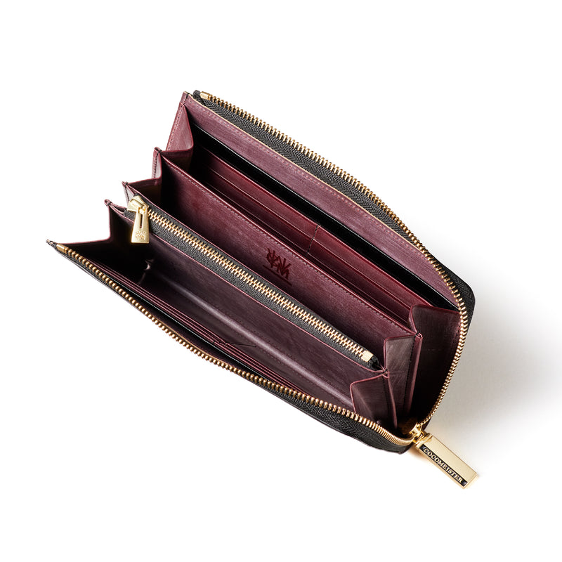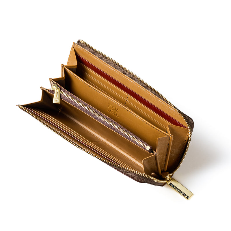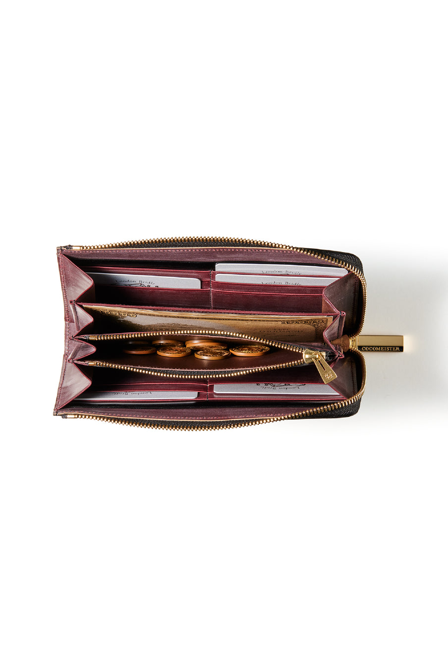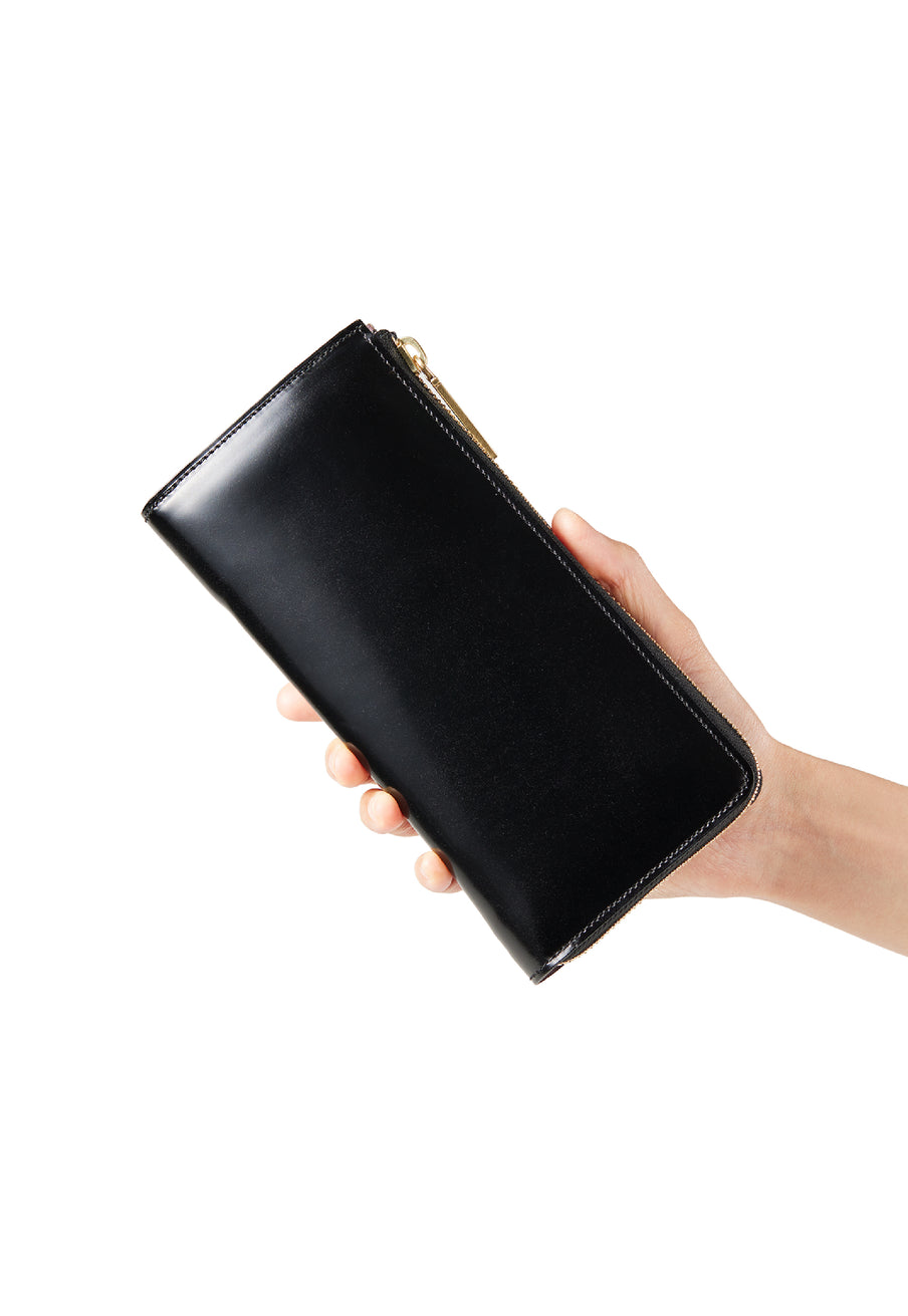 英国のクルーという街からイメージしたコードバンクルーです。オイルコードバンと、オークバークレザーという希少な素材を組み合わせ、特別な職人が仕立てた優美なフォルム、存在感が魅力のシリーズ。L字型のラウンドジップ長財布は、ファスナー部分がL字で作られており、開け閉めし易いのが特徴です。L字型でありながら、重厚感と存在感はしっかりと楽しめる仕上がりです。| 外寸 | 縦9.8×横19.7×厚さ3.5cm 開いた時の幅10cm |