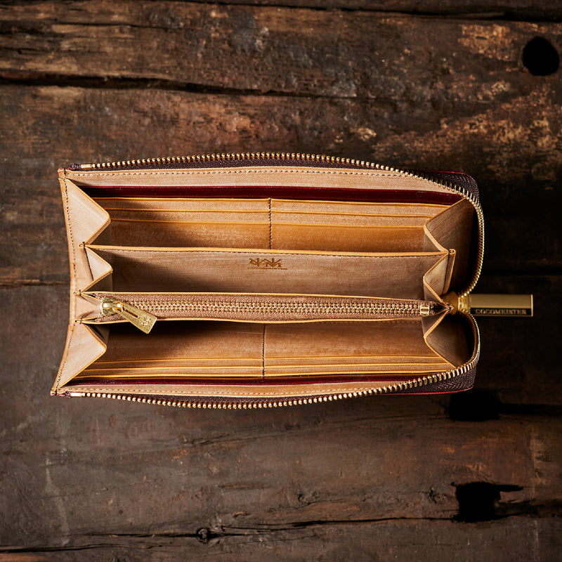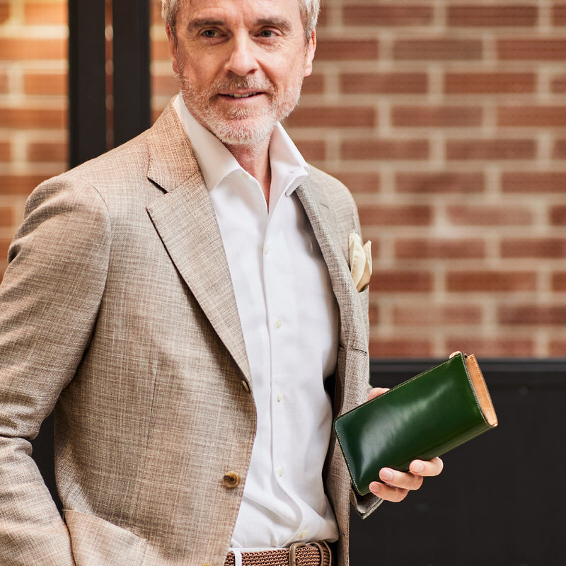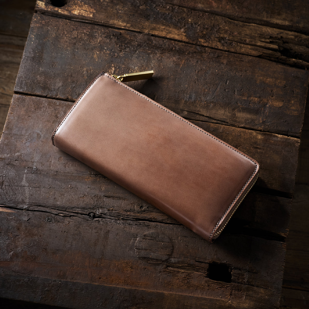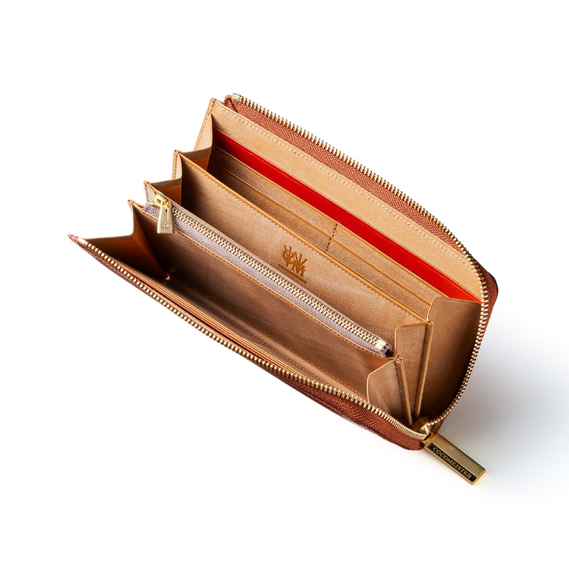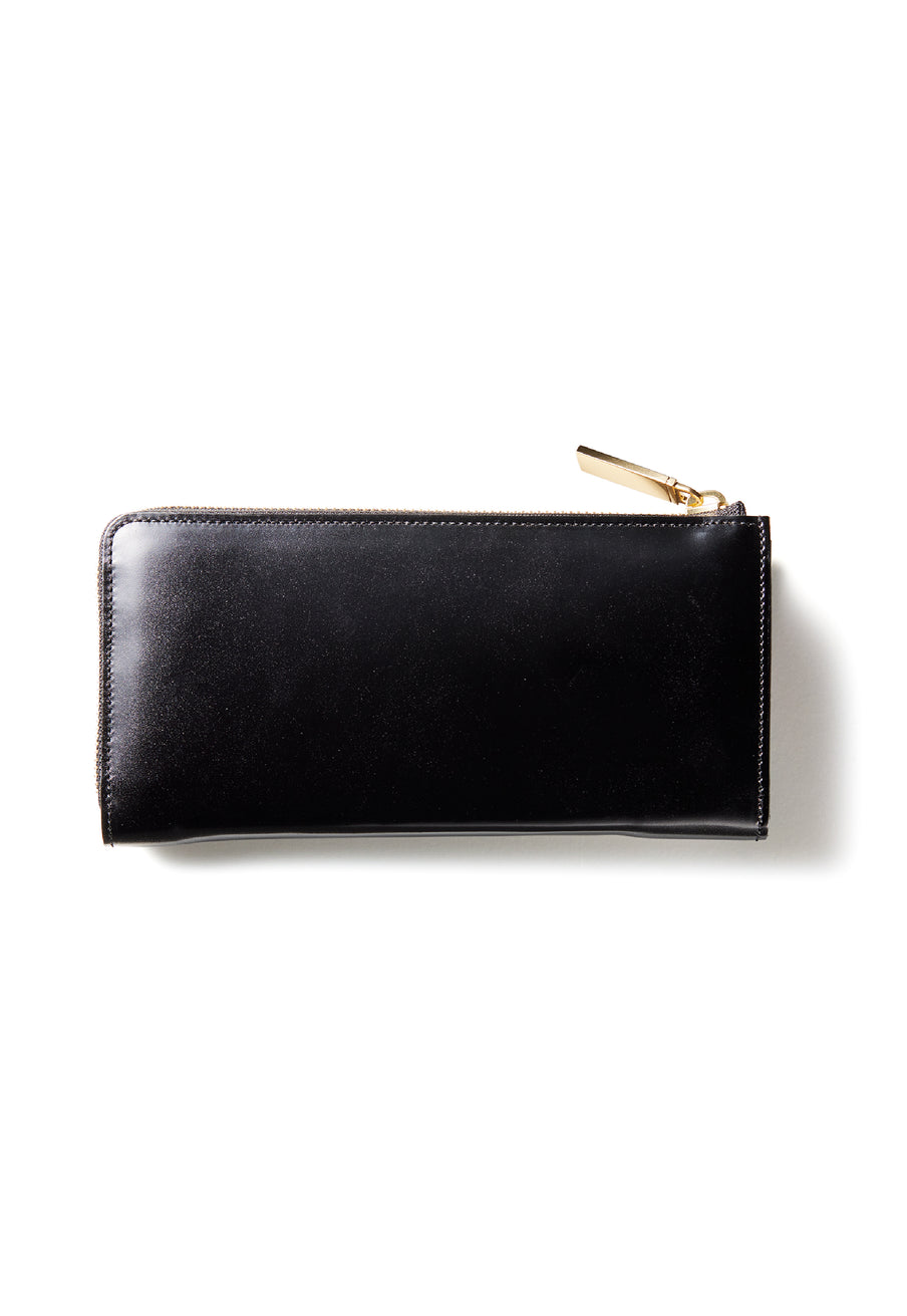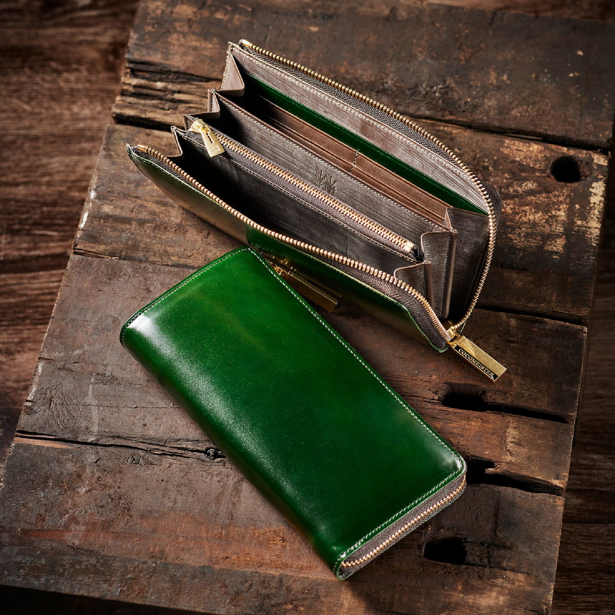 英国のクルーという街からイメージしたコードバンクルーです。オイルコードバンと、オークバークレザーという希少な素材を組み合わせ、特別な職人が仕立てた優美なフォルム、存在感が魅力のシリーズ。L字型のラウンドジップ長財布は、ファスナー部分がL字で作られており、開け閉めし易いのが特徴です。L字型でありながら、重厚感と存在感はしっかりと楽しめる仕上がりです。| 外寸 | 縦9.8×横19.7×厚さ3.5cm 開いた時の幅10cm |