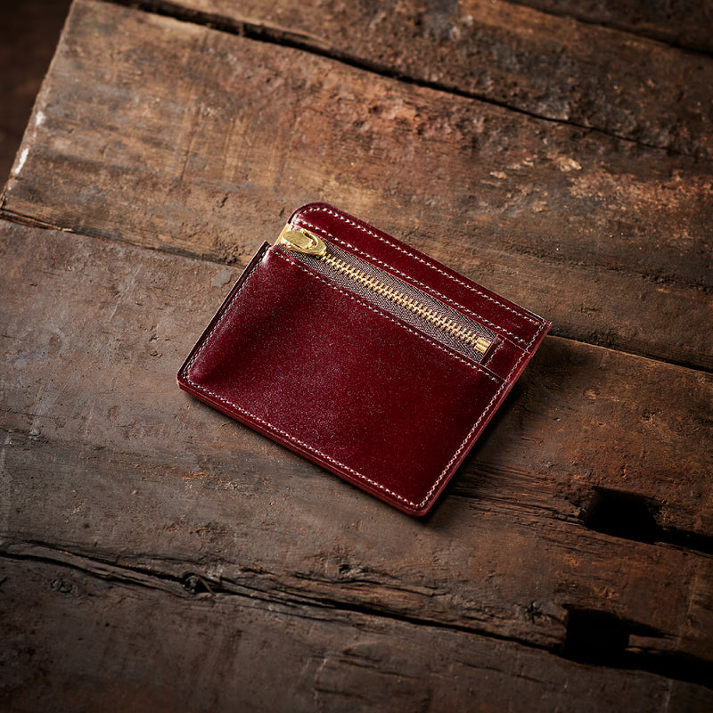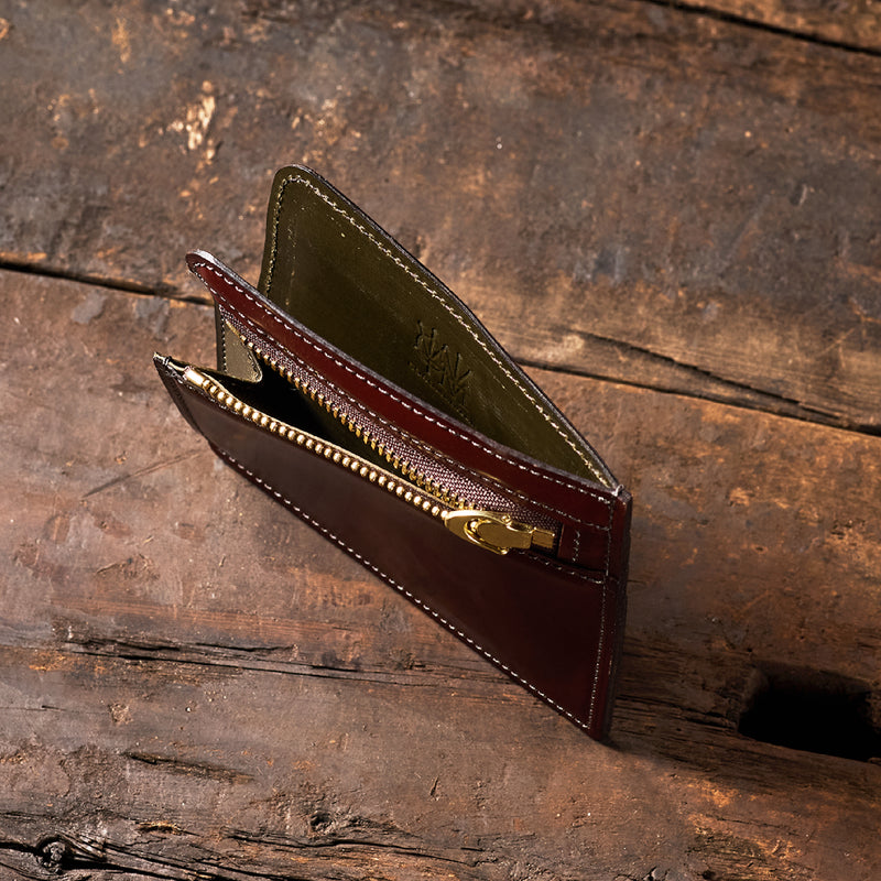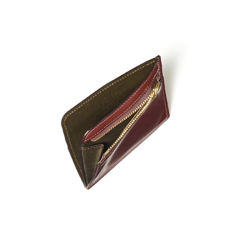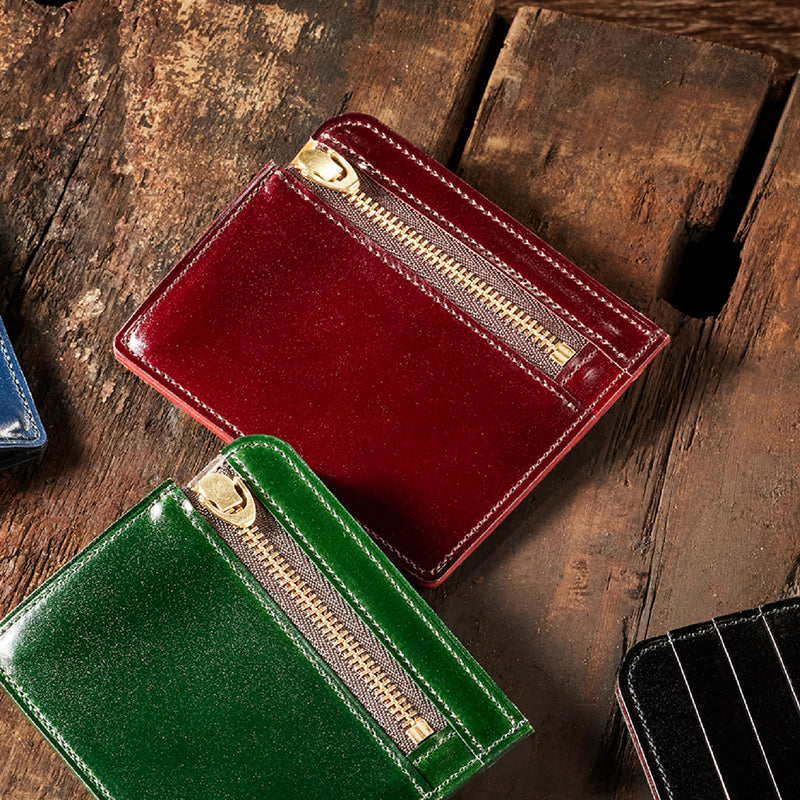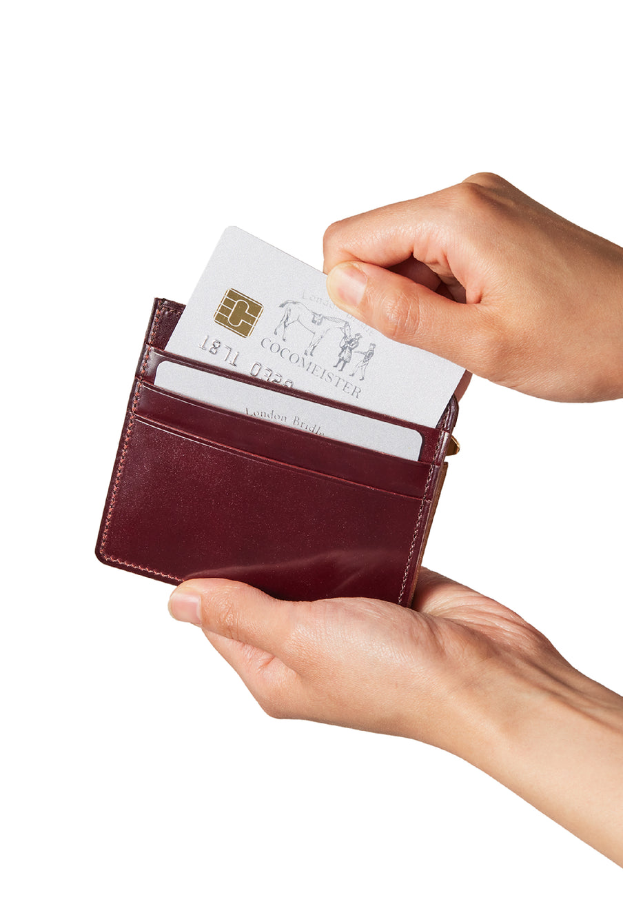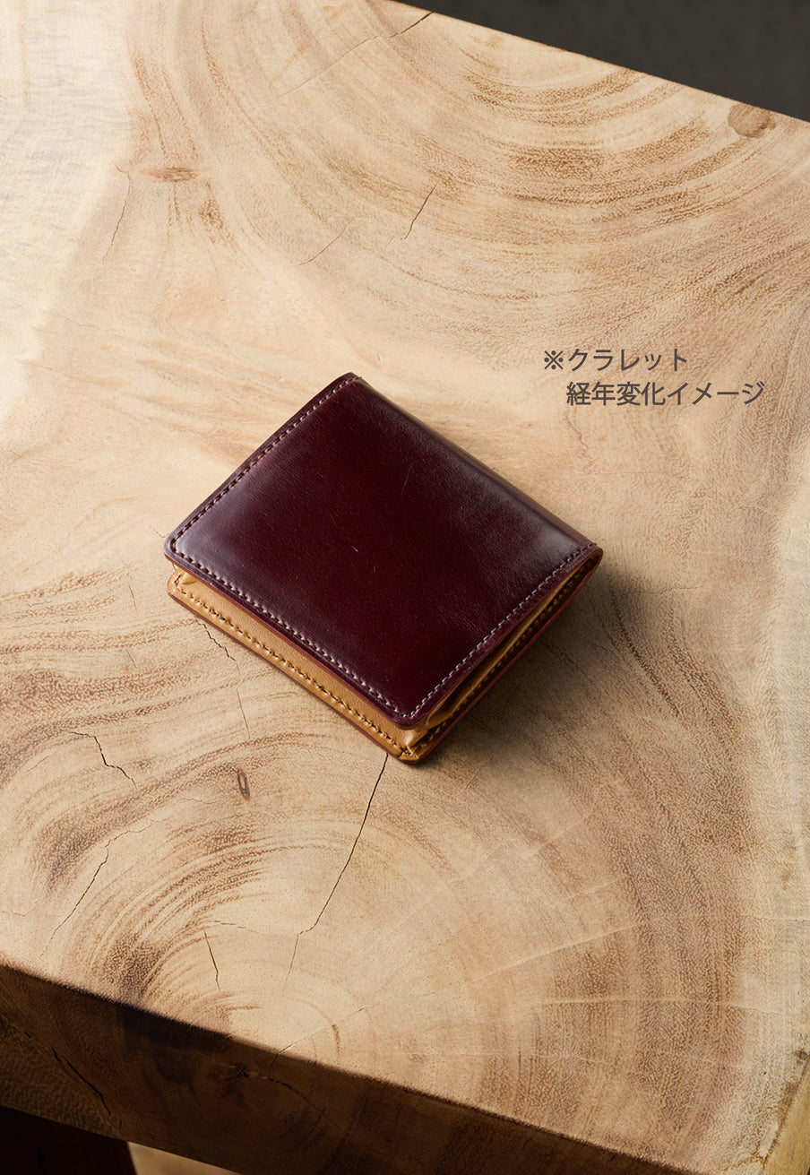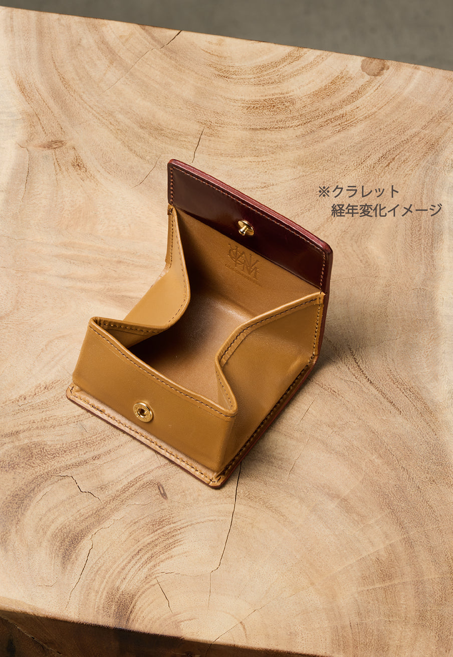 英国のクルーという街からイメージしたコードバンクルーです。オイルコードバンと、オークバークレザーという希少な素材を組み合わせ、特別な職人が仕立てた優美なフォルム、存在感が魅力のシリーズ。小銭入れとカード入れが外装に装備さているサミュエルです。真ん中部分は、挟み込むフリーポケットになっており、レシートなどを折り畳み収納できます。| 外寸 | 縦8.7×横10.2×厚さ1.3cm |