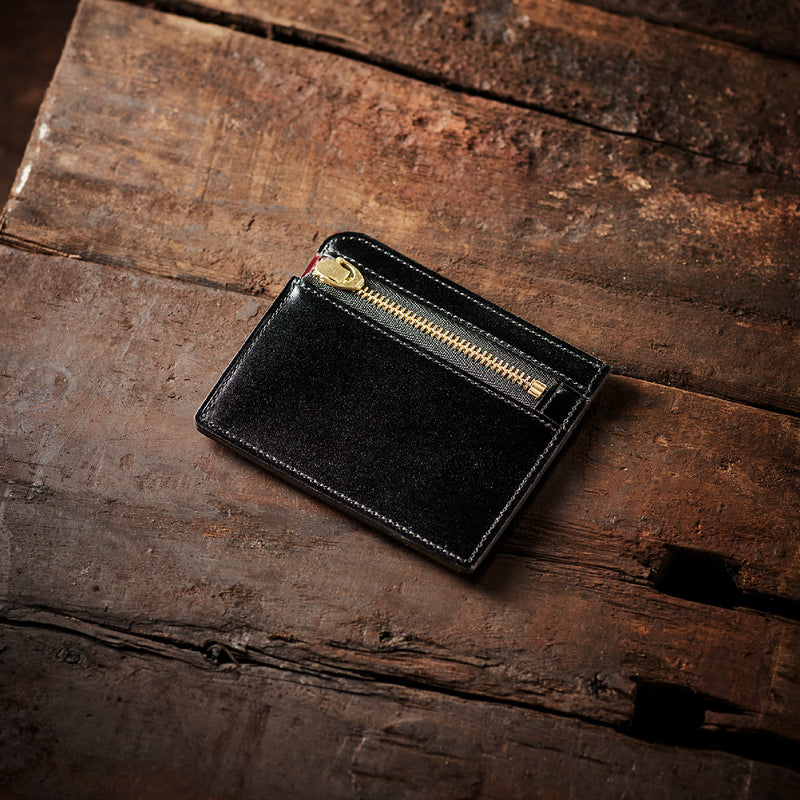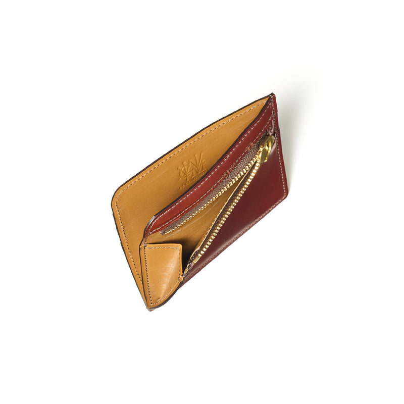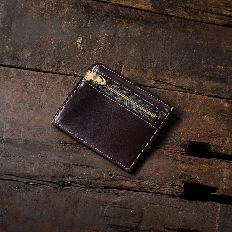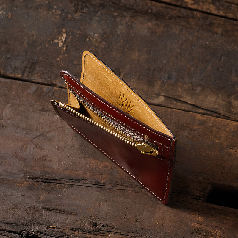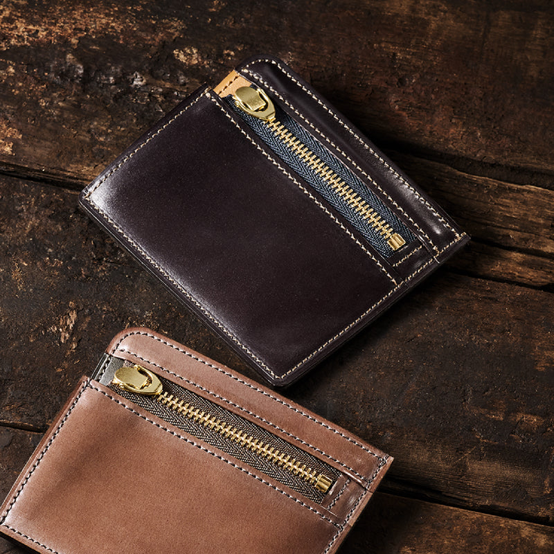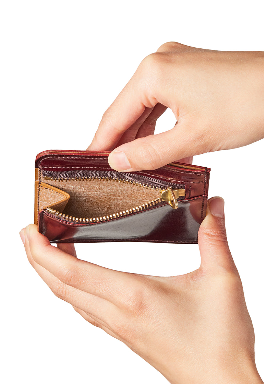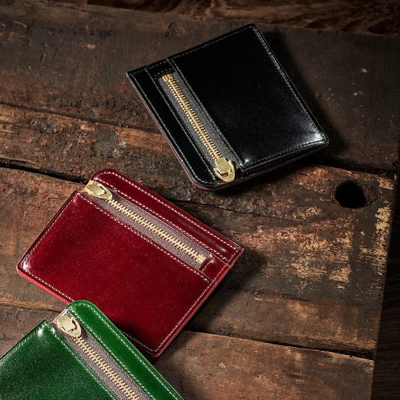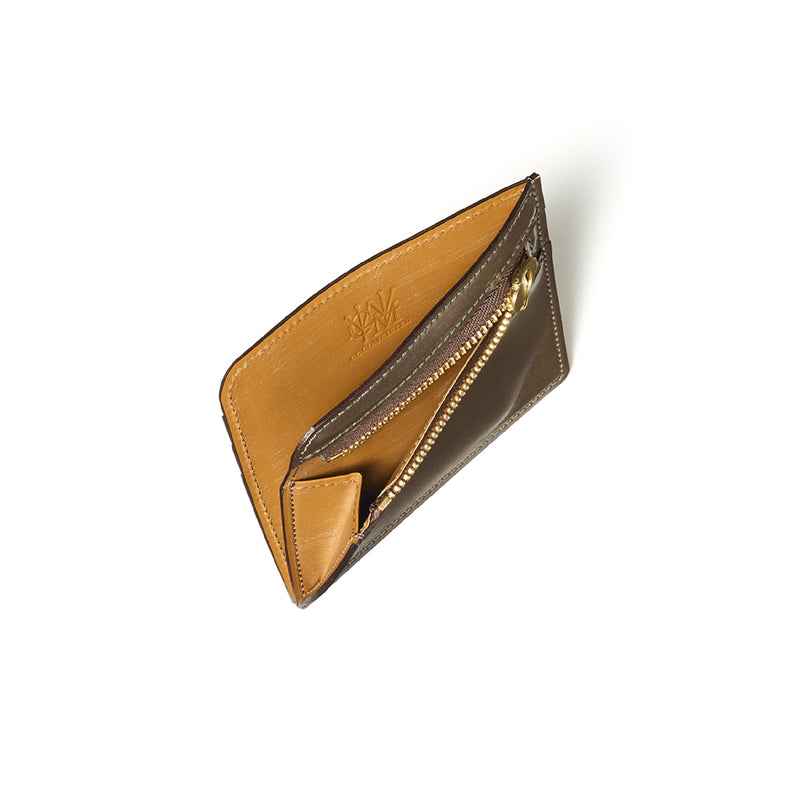 英国のクルーという街からイメージしたコードバンクルーです。オイルコードバンと、オークバークレザーという希少な素材を組み合わせ、特別な職人が仕立てた優美なフォルム、存在感が魅力のシリーズ。小銭入れとカード入れが外装に装備さているサミュエルです。真ん中部分は、挟み込むフリーポケットになっており、レシートなどを折り畳み収納できます。| 外寸 | 縦8.7×横10.2×厚さ1.3cm |