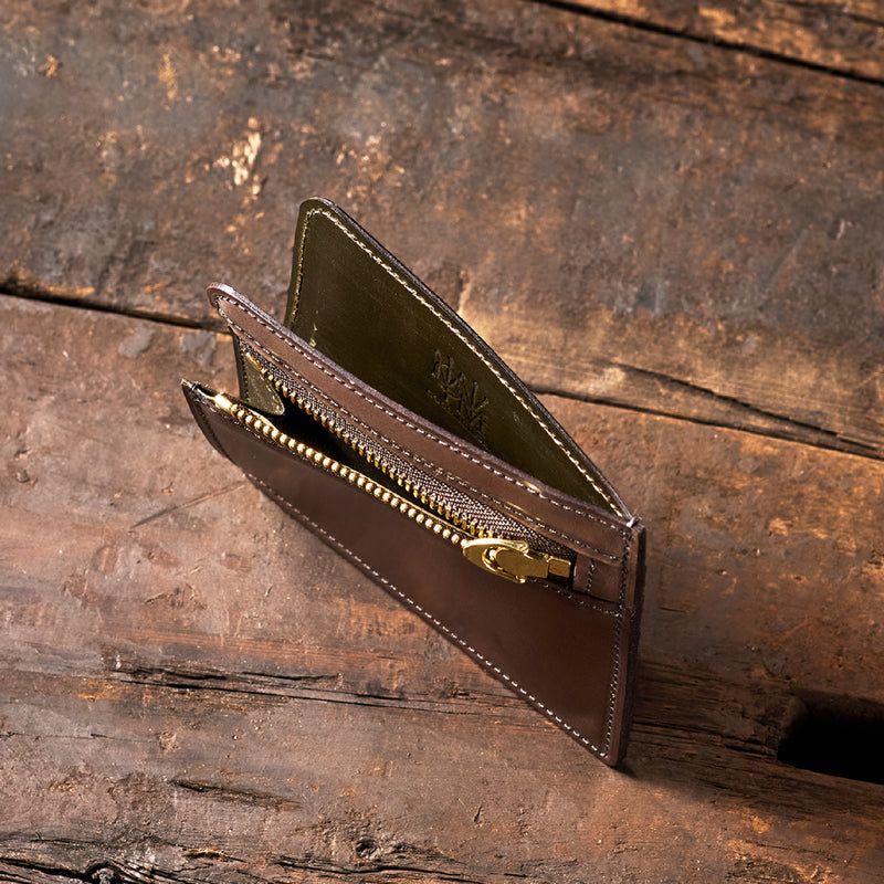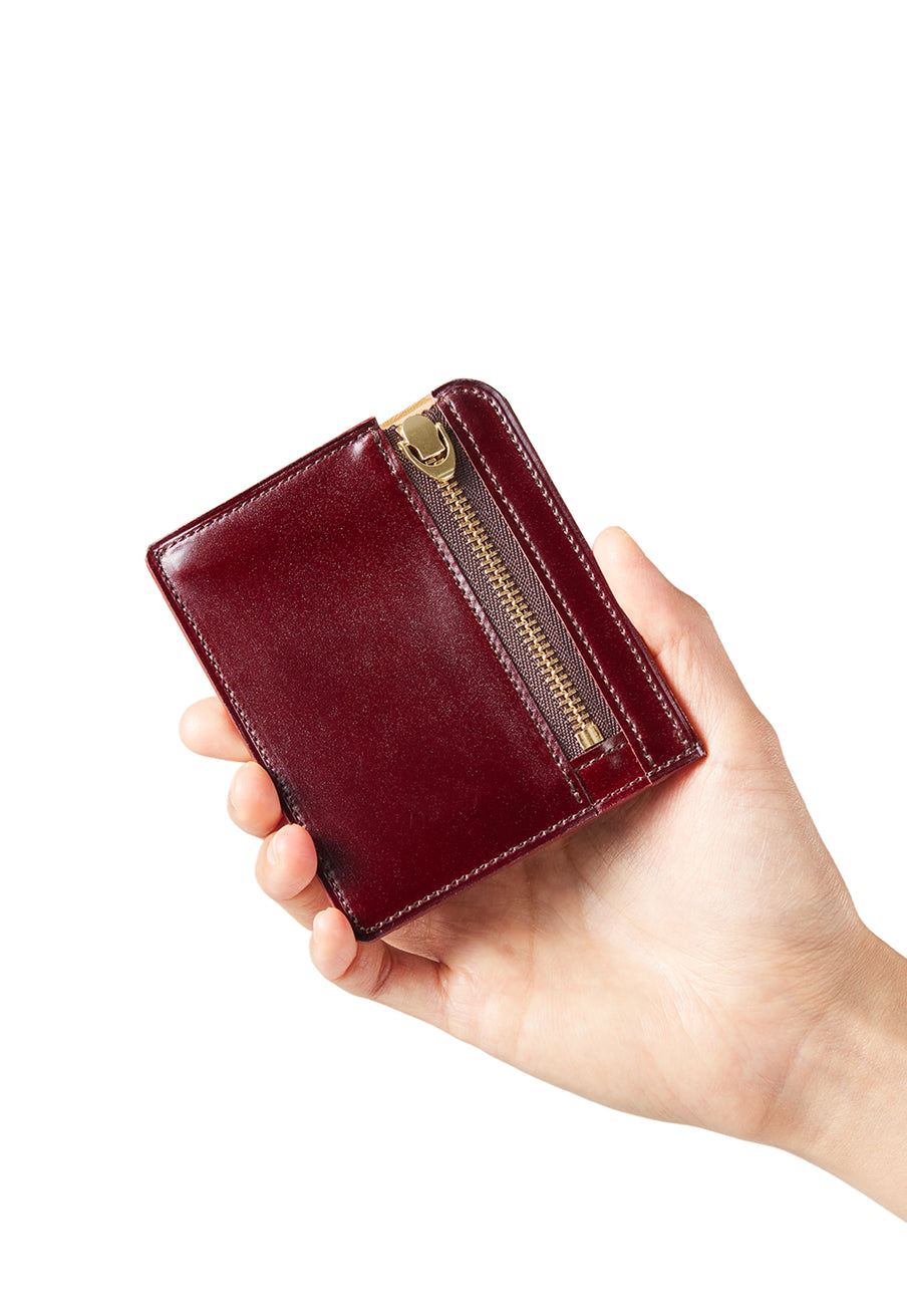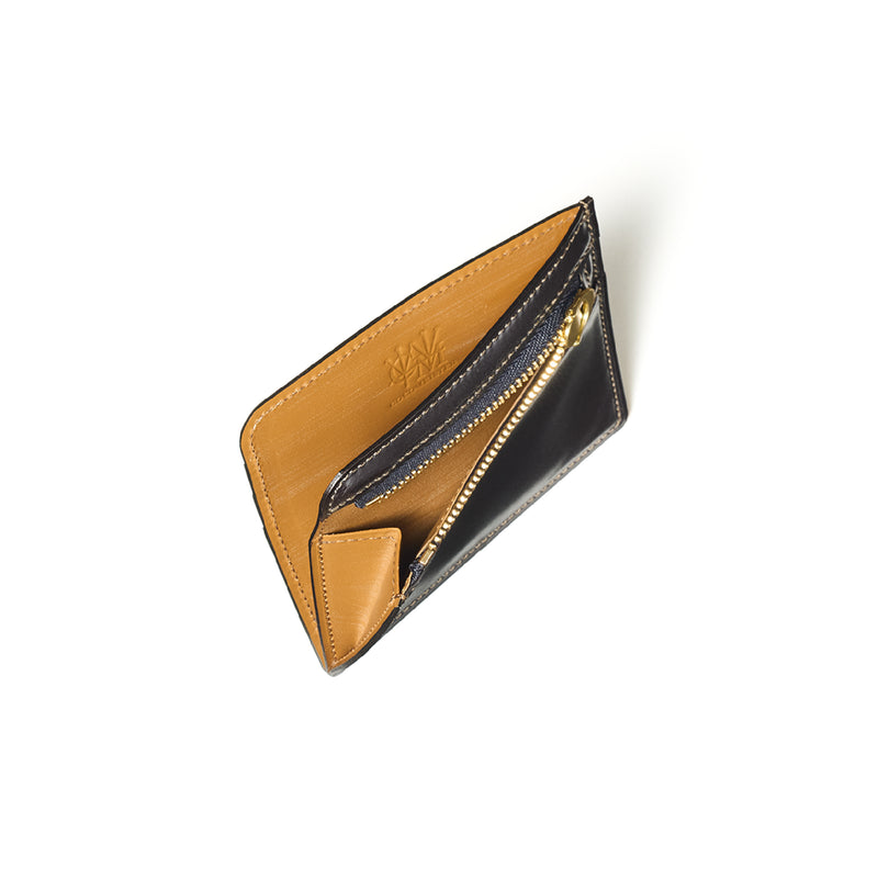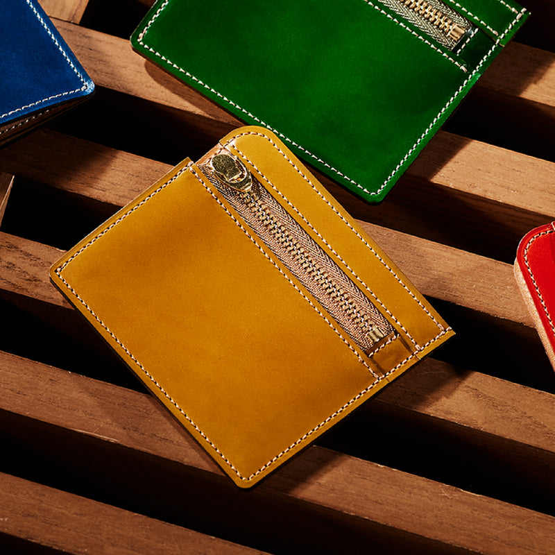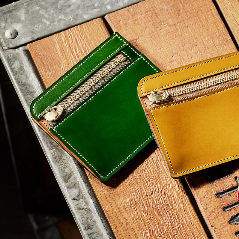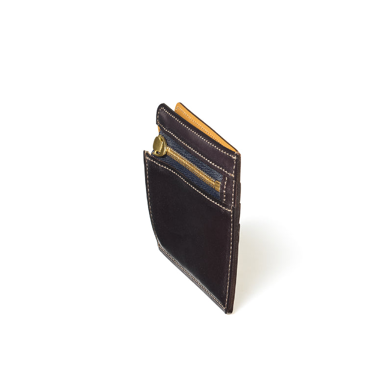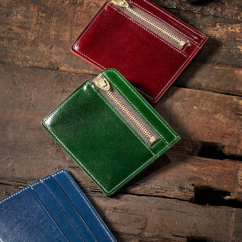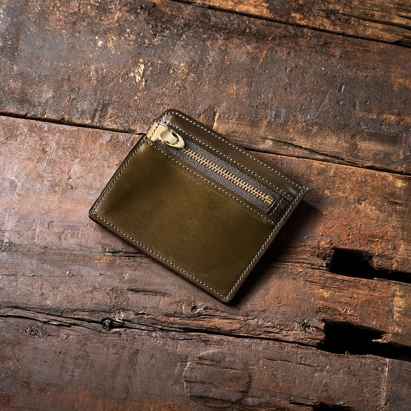 英国のクルーという街からイメージしたコードバンクルーです。オイルコードバンと、オークバークレザーという希少な素材を組み合わせ、特別な職人が仕立てた優美なフォルム、存在感が魅力のシリーズ。小銭入れとカード入れが外装に装備さているサミュエルです。真ん中部分は、挟み込むフリーポケットになっており、レシートなどを折り畳み収納できます。| 外寸 | 縦8.7×横10.2×厚さ1.3cm |