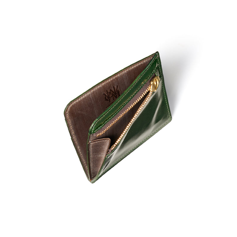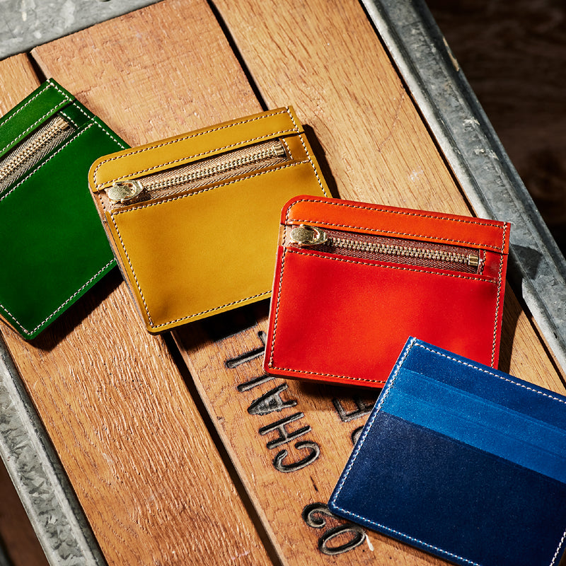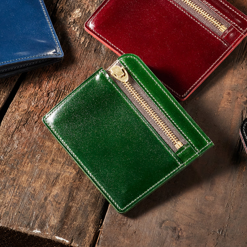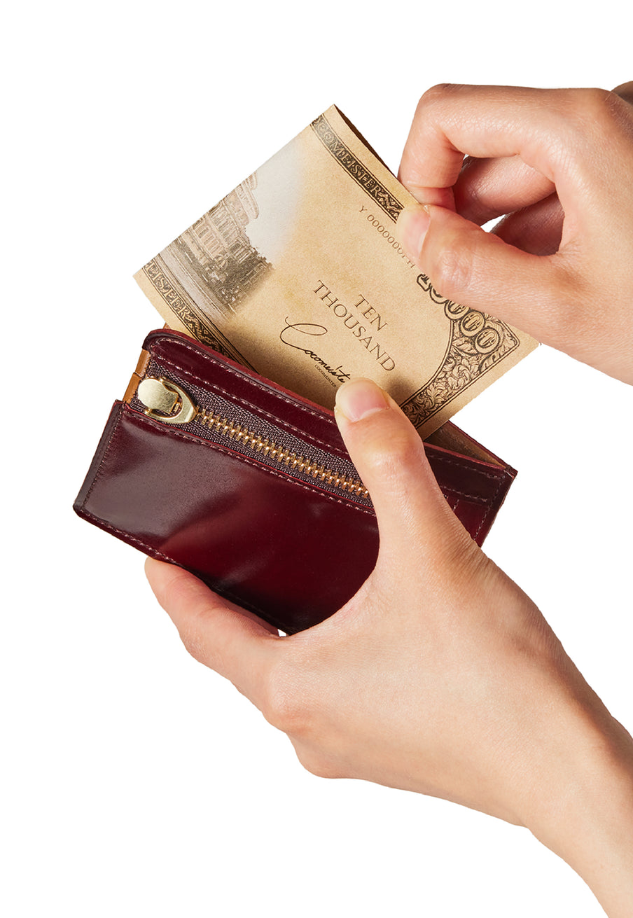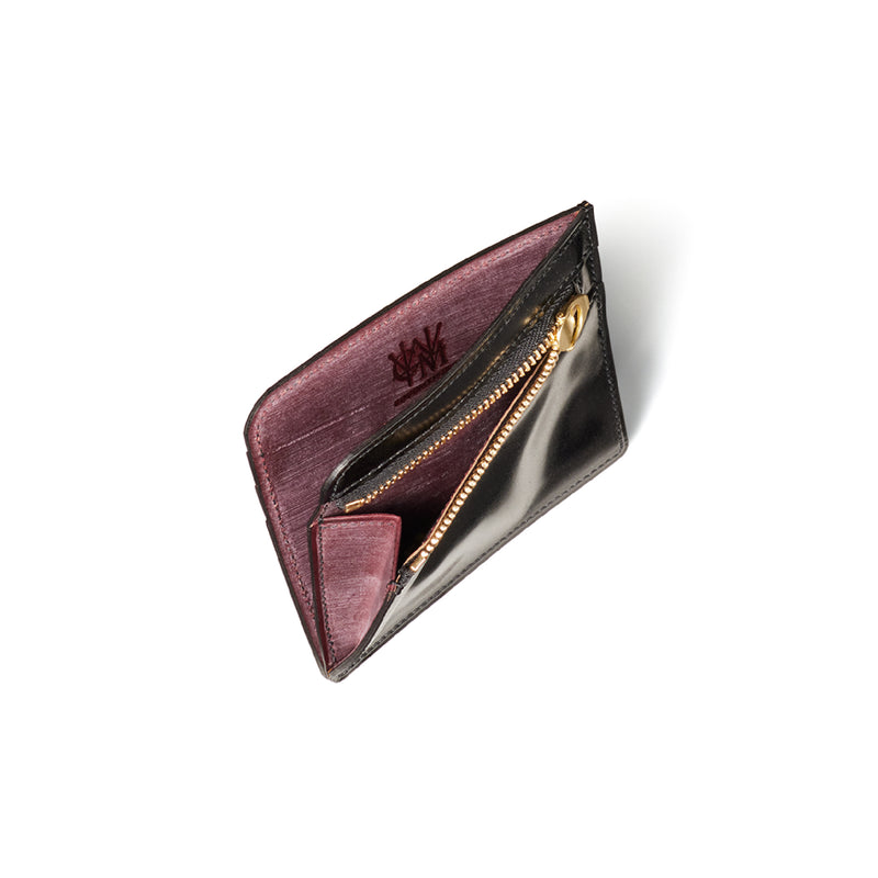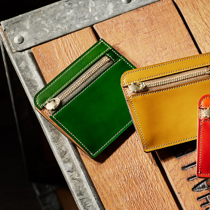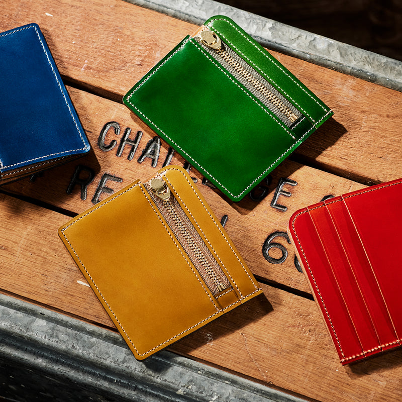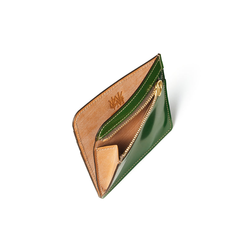 英国のクルーという街からイメージしたコードバンクルーです。オイルコードバンと、オークバークレザーという希少な素材を組み合わせ、特別な職人が仕立てた優美なフォルム、存在感が魅力のシリーズ。小銭入れとカード入れが外装に装備さているサミュエルです。真ん中部分は、挟み込むフリーポケットになっており、レシートなどを折り畳み収納できます。| 外寸 | 縦8.7×横10.2×厚さ1.3cm |