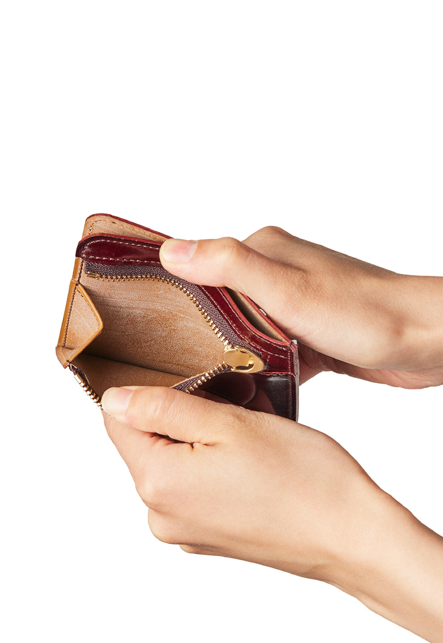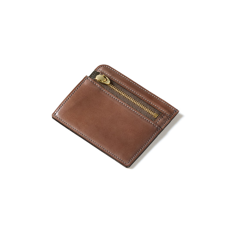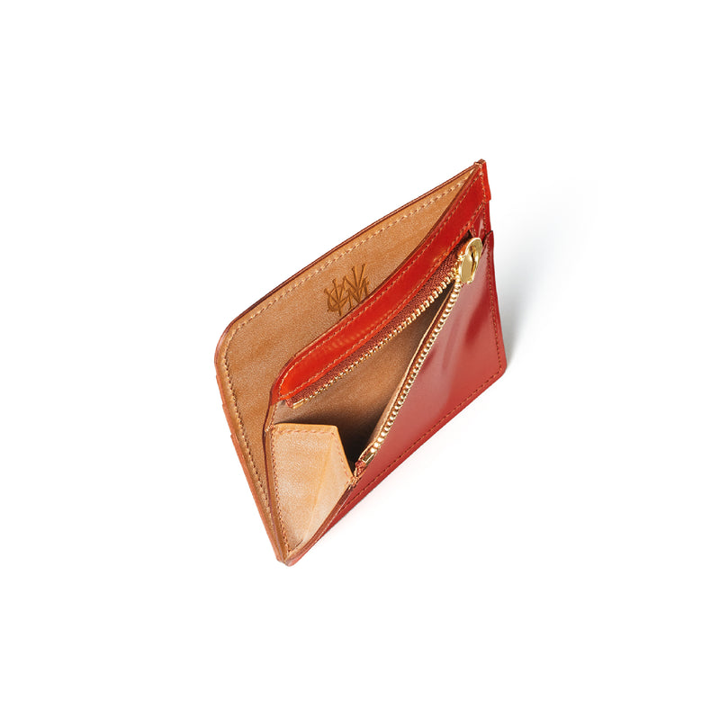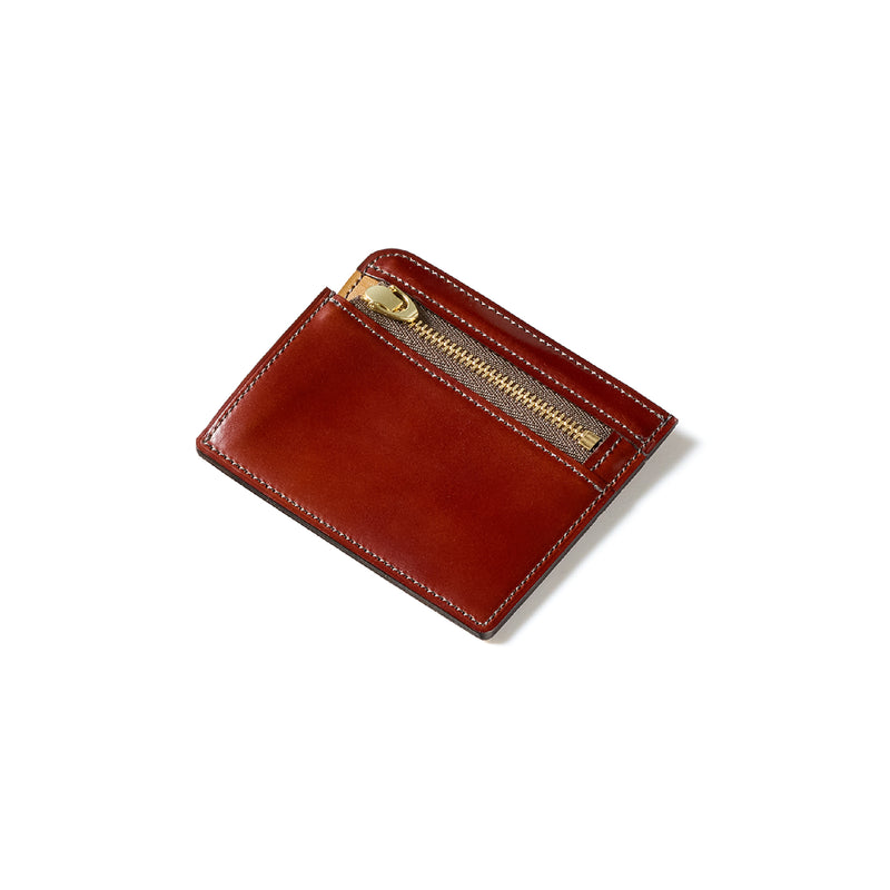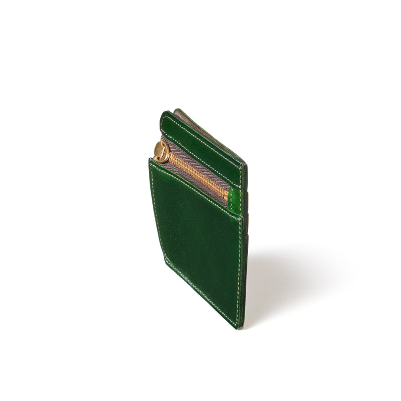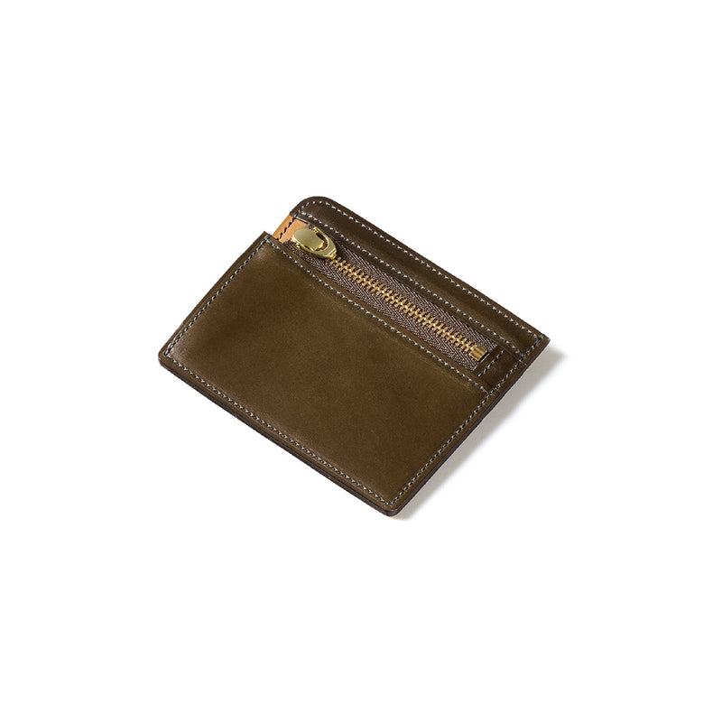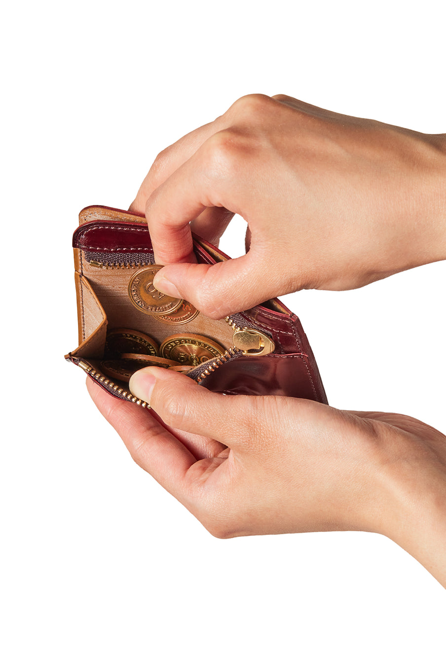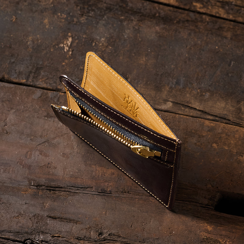 英国のクルーという街からイメージしたコードバンクルーです。オイルコードバンと、オークバークレザーという希少な素材を組み合わせ、特別な職人が仕立てた優美なフォルム、存在感が魅力のシリーズ。小銭入れとカード入れが外装に装備さているサミュエルです。真ん中部分は、挟み込むフリーポケットになっており、レシートなどを折り畳み収納できます。| 外寸 | 縦8.7×横10.2×厚さ1.3cm |