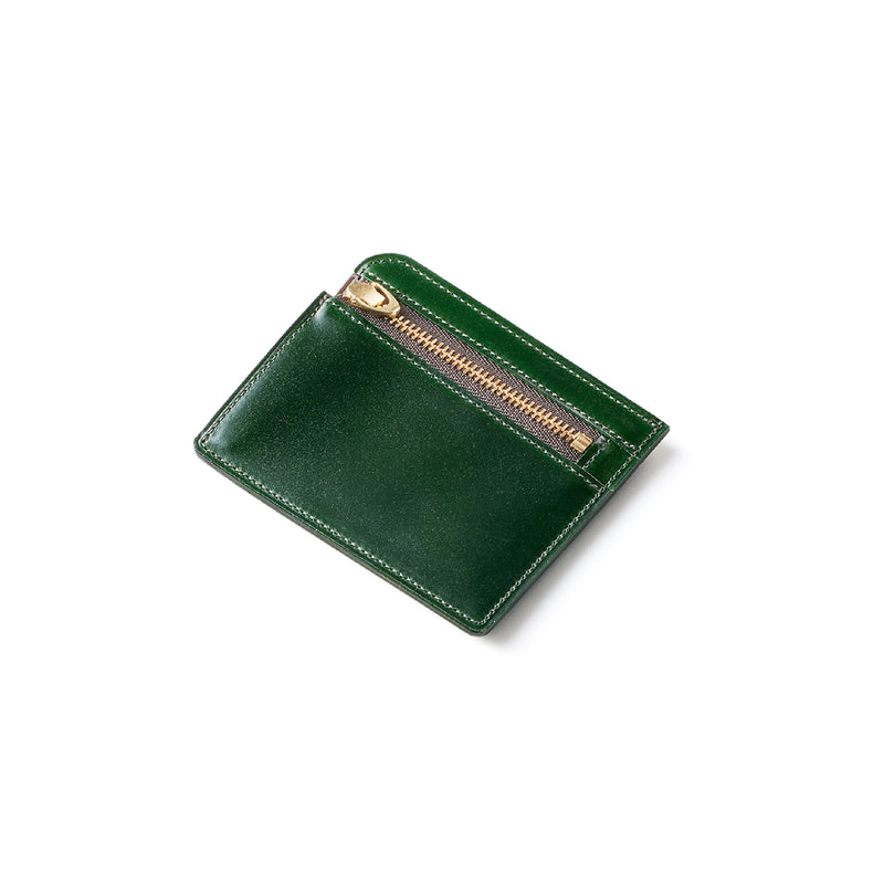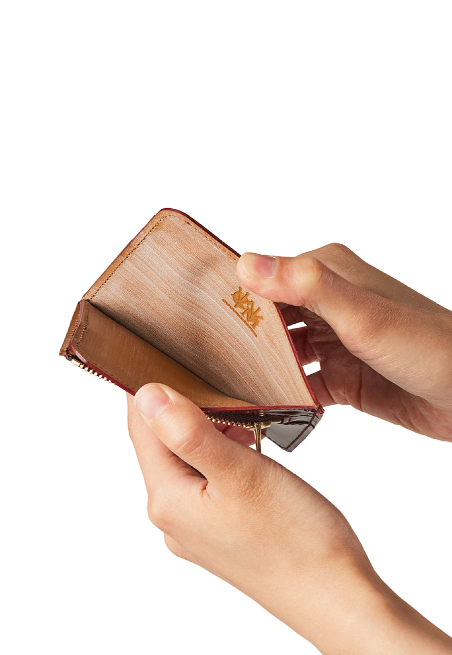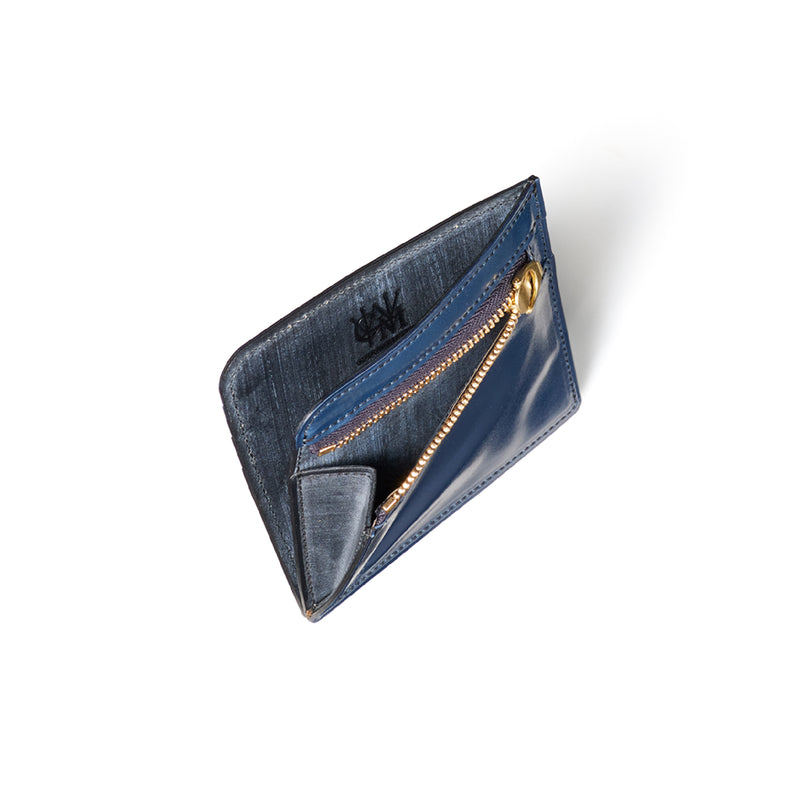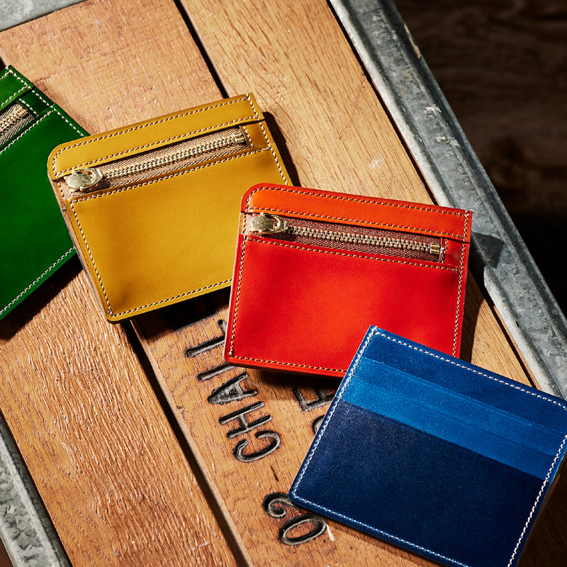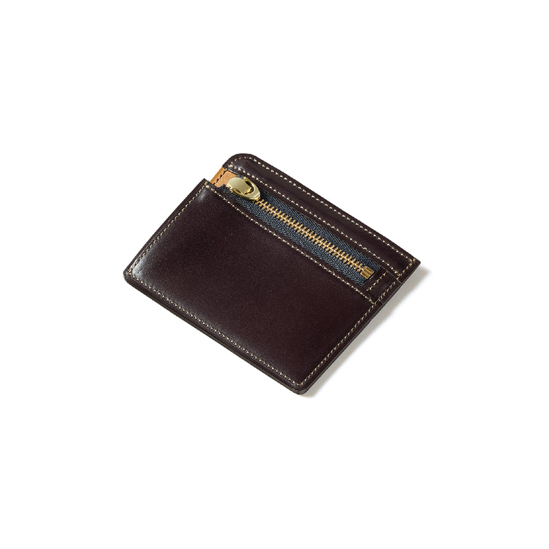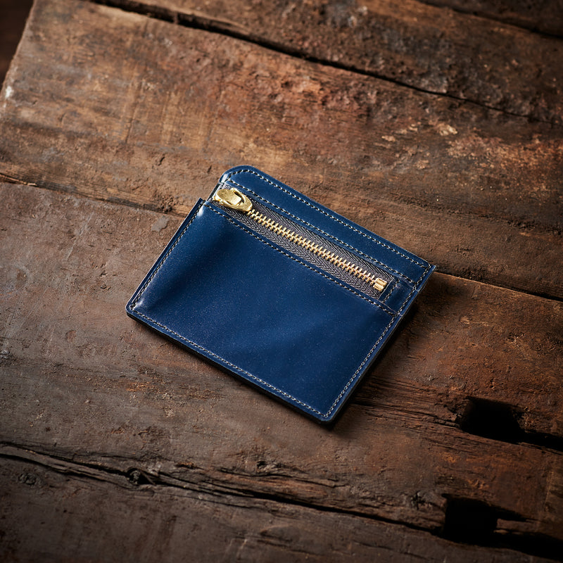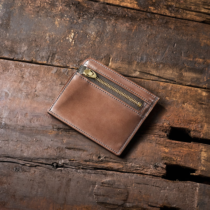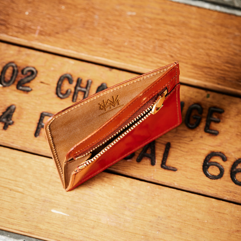 英国のクルーという街からイメージしたコードバンクルーです。オイルコードバンと、オークバークレザーという希少な素材を組み合わせ、特別な職人が仕立てた優美なフォルム、存在感が魅力のシリーズ。小銭入れとカード入れが外装に装備さているサミュエルです。真ん中部分は、挟み込むフリーポケットになっており、レシートなどを折り畳み収納できます。| 外寸 | 縦8.7×横10.2×厚さ1.3cm |