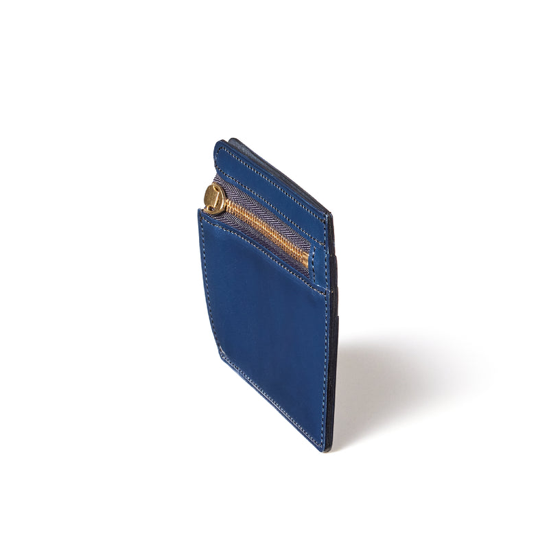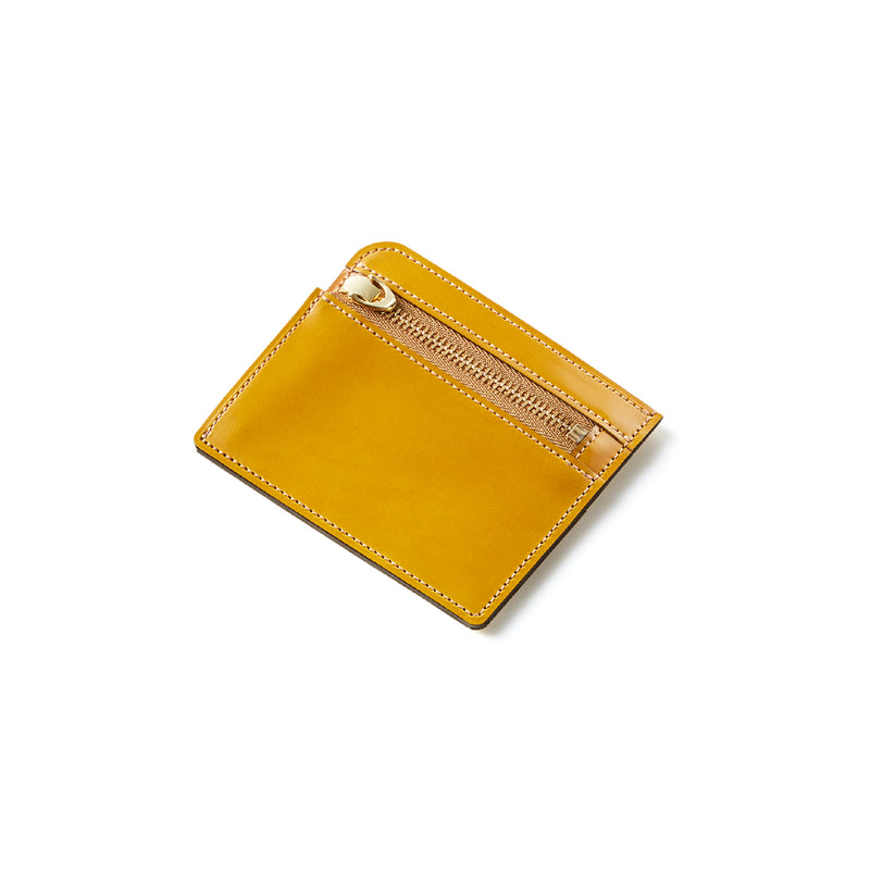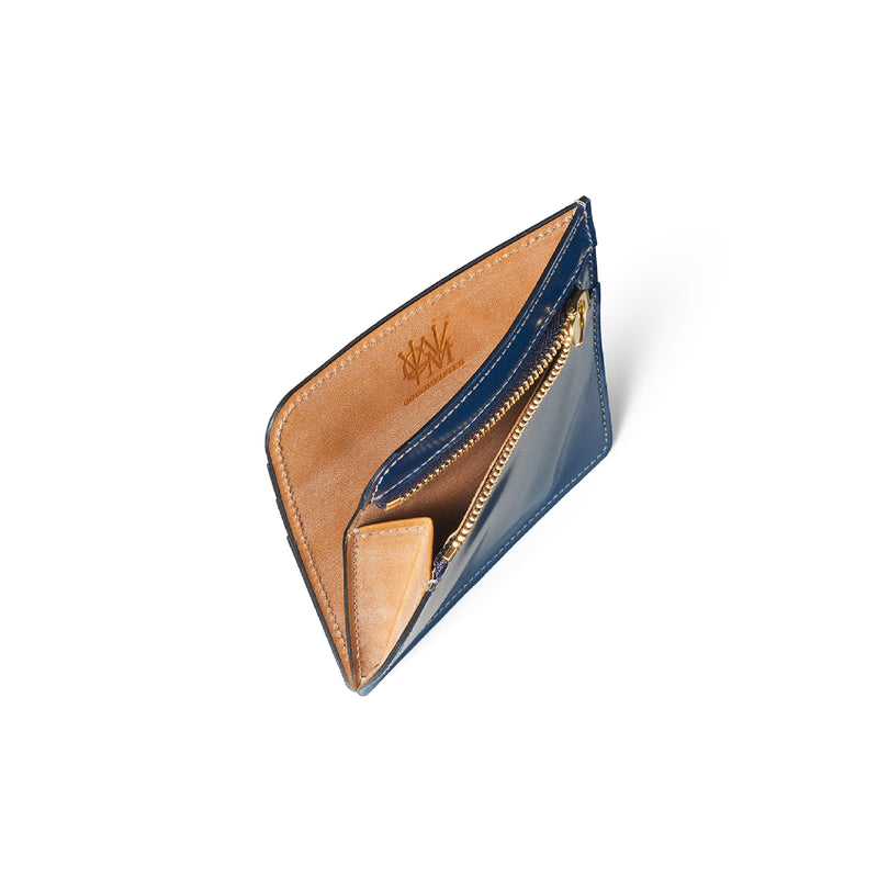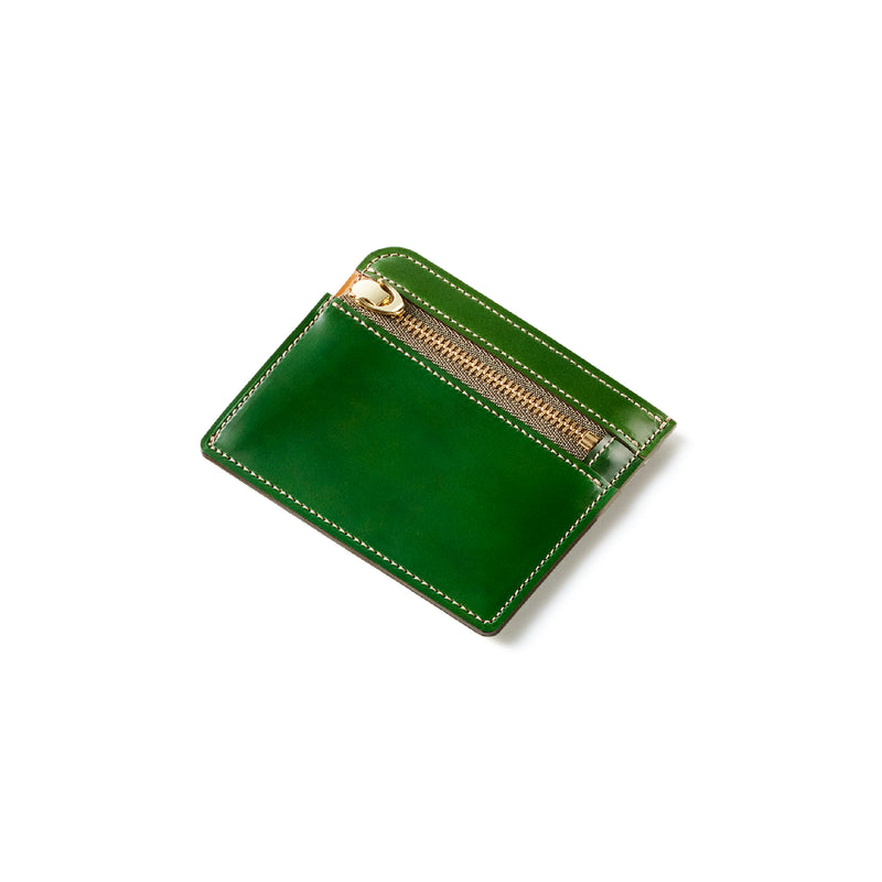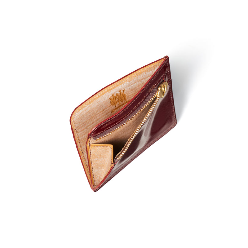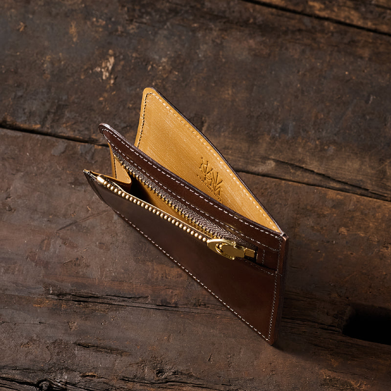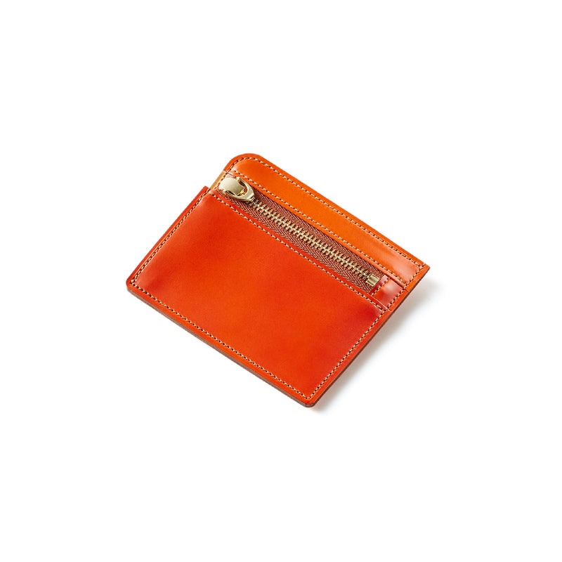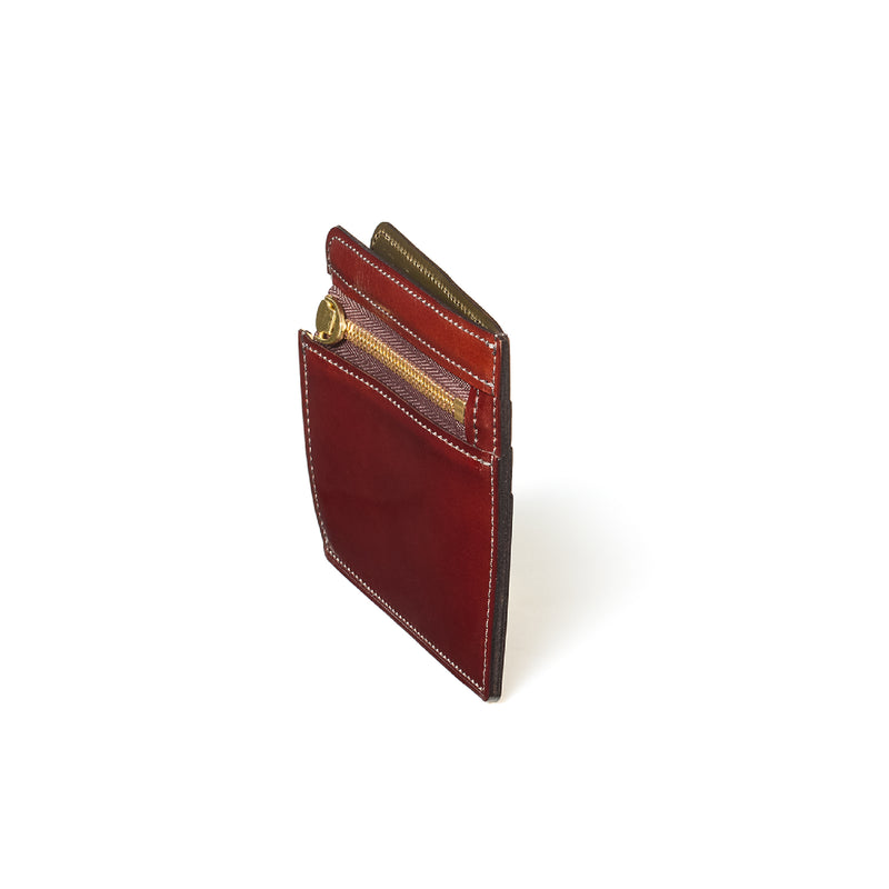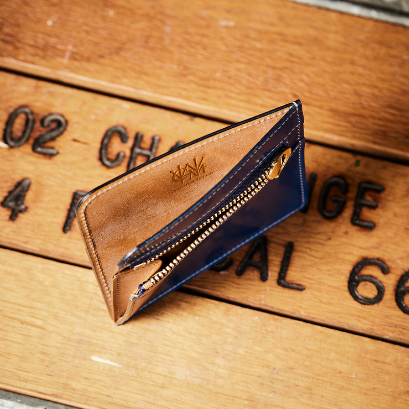 英国のクルーという街からイメージしたコードバンクルーです。オイルコードバンと、オークバークレザーという希少な素材を組み合わせ、特別な職人が仕立てた優美なフォルム、存在感が魅力のシリーズ。小銭入れとカード入れが外装に装備さているサミュエルです。真ん中部分は、挟み込むフリーポケットになっており、レシートなどを折り畳み収納できます。| 外寸 | 縦8.7×横10.2×厚さ1.3cm |