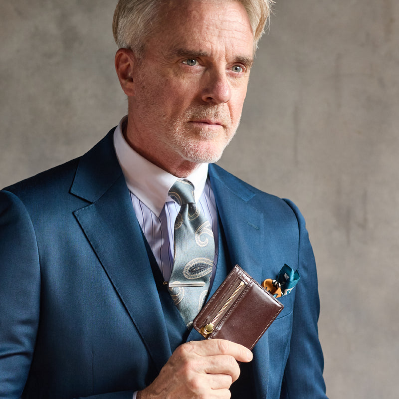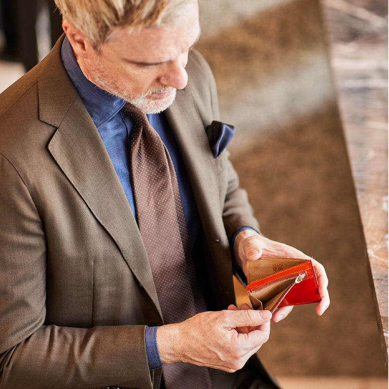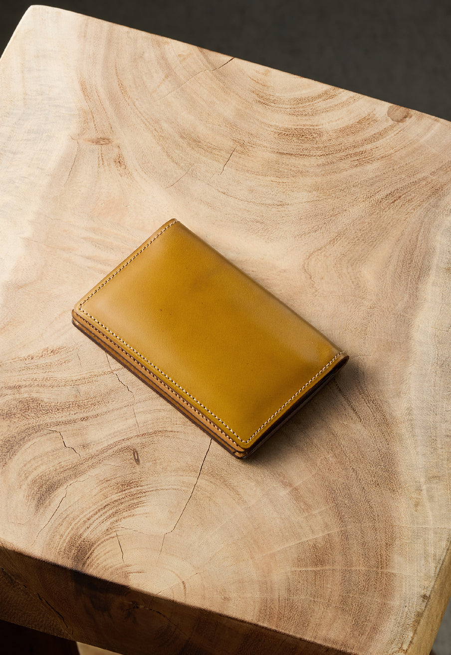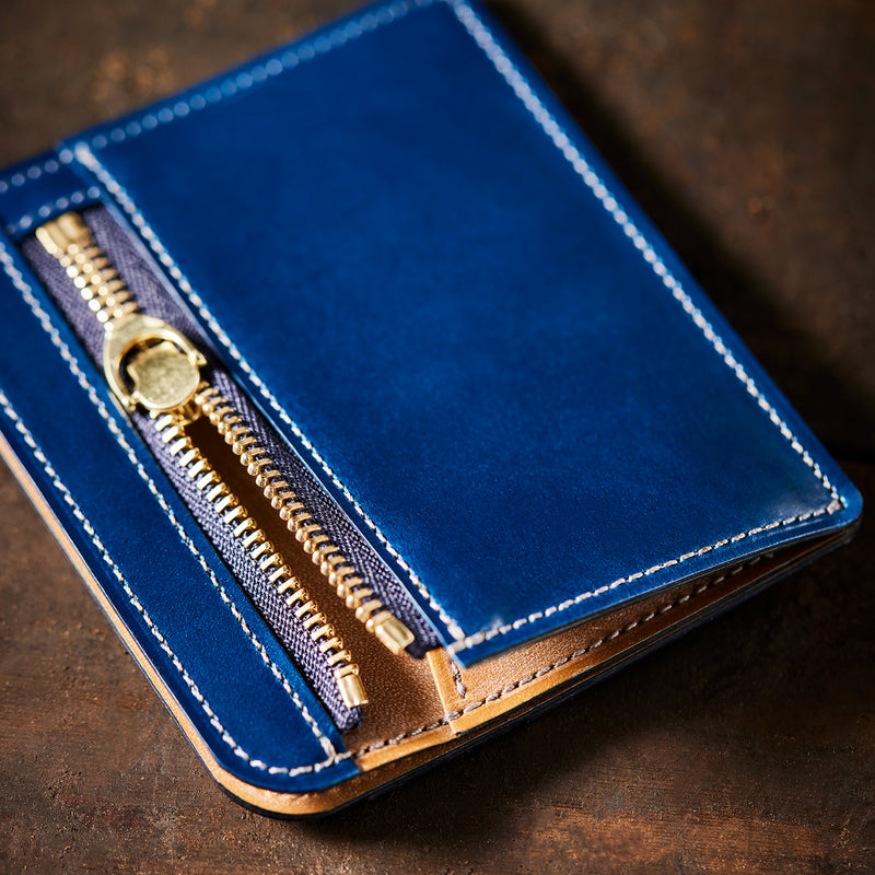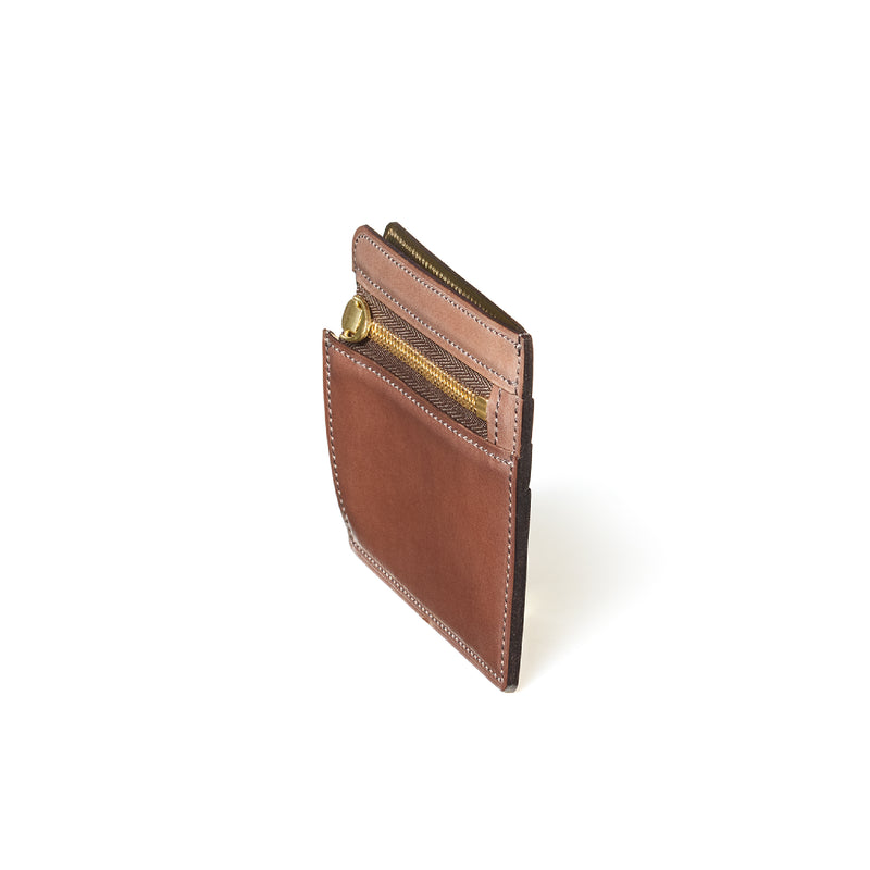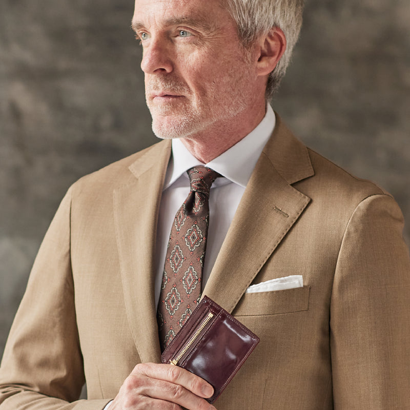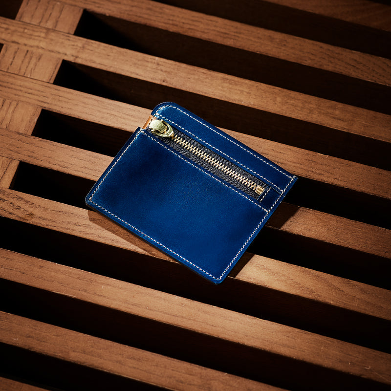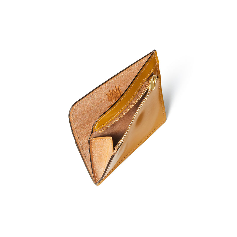 英国のクルーという街からイメージしたコードバンクルーです。オイルコードバンと、オークバークレザーという希少な素材を組み合わせ、特別な職人が仕立てた優美なフォルム、存在感が魅力のシリーズ。小銭入れとカード入れが外装に装備さているサミュエルです。真ん中部分は、挟み込むフリーポケットになっており、レシートなどを折り畳み収納できます。| 外寸 | 縦8.7×横10.2×厚さ1.3cm |