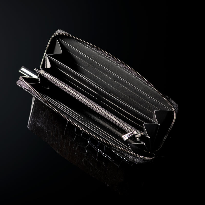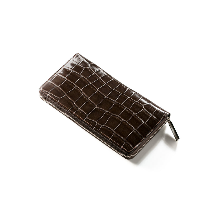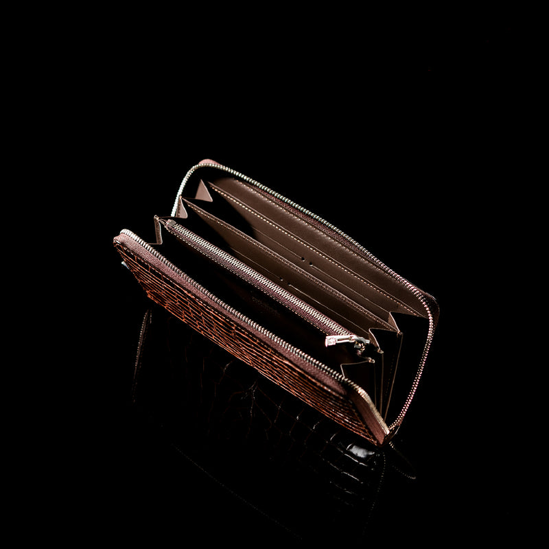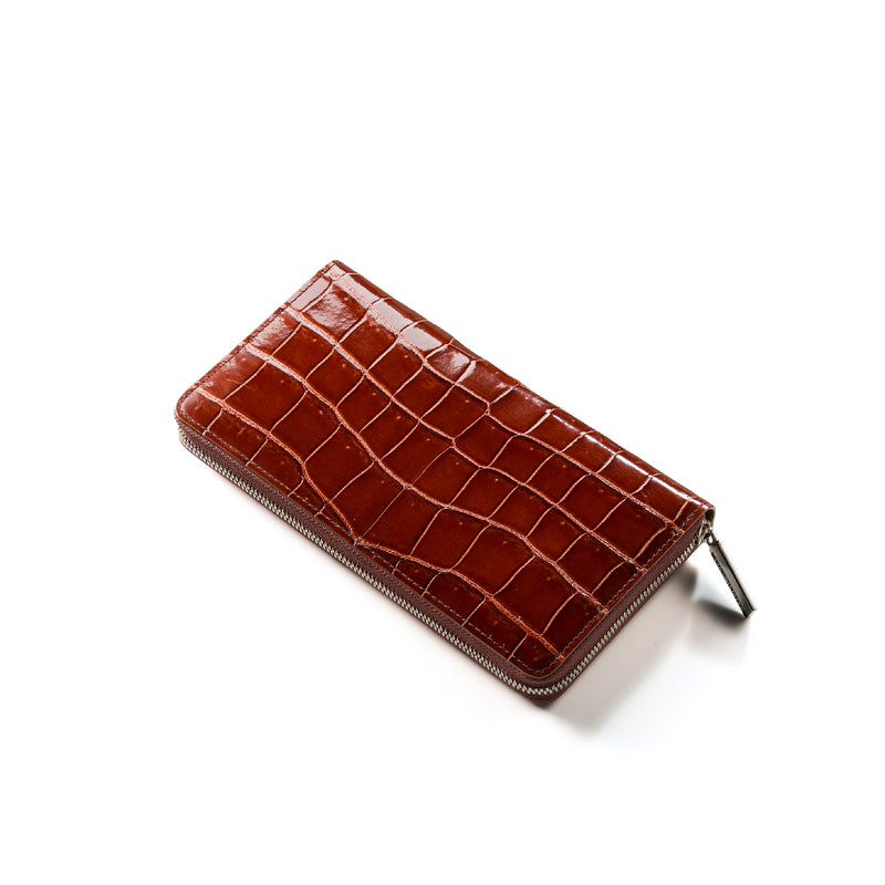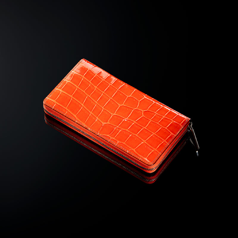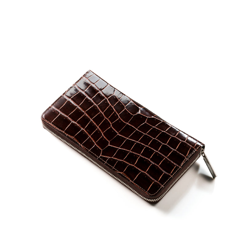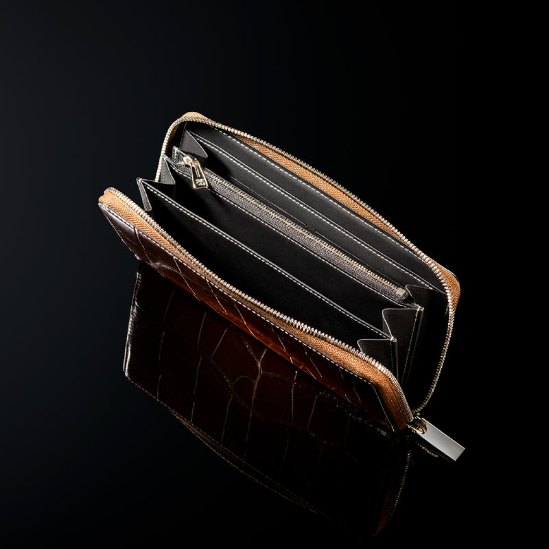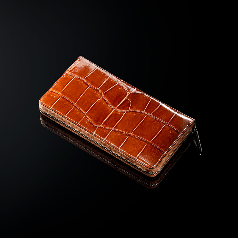 ダイナミックで芸術的な究極クロコダイルコレクション。独自の感性により生まれたフランス産の最高級クロコダイルレザー。現代のライフスタイルに合う様に、日本のクロコダイル熟練工が仕立てます。大きめのラウンドジップ型の長財布で、容量が大きめで使い勝手が良いのが特徴です。中身を落とす心配もなく、重厚感のあるフォルムが格好良くお洒落です。| 外寸 | 縦11.5cm×横21cm×厚み2.3cm |