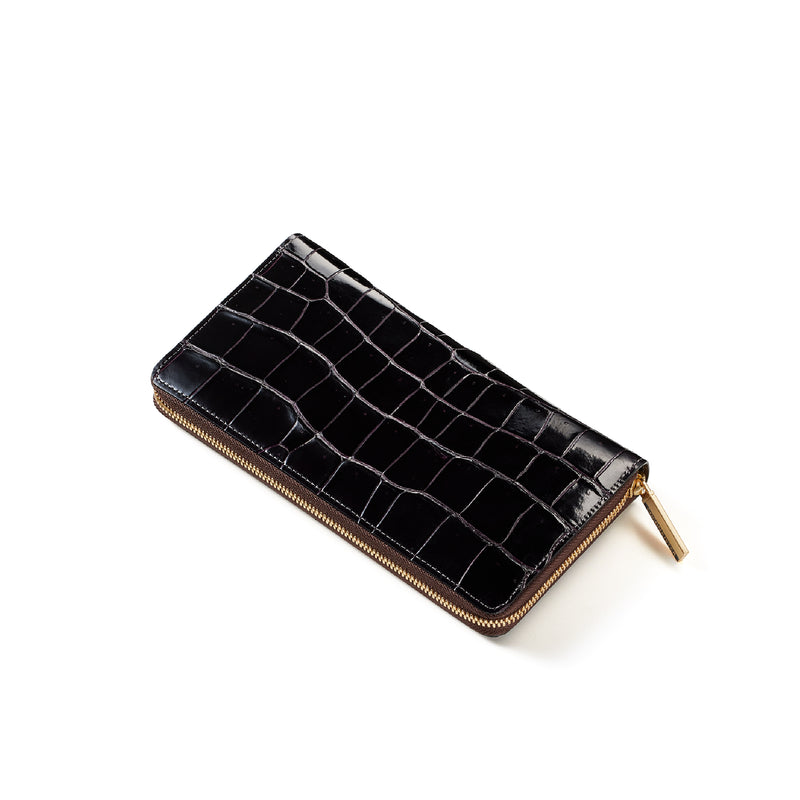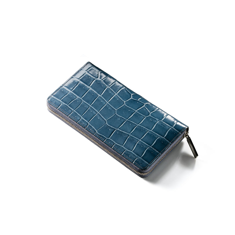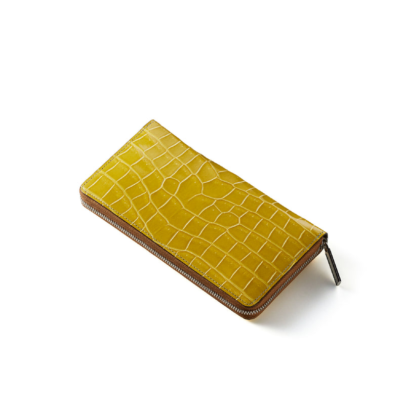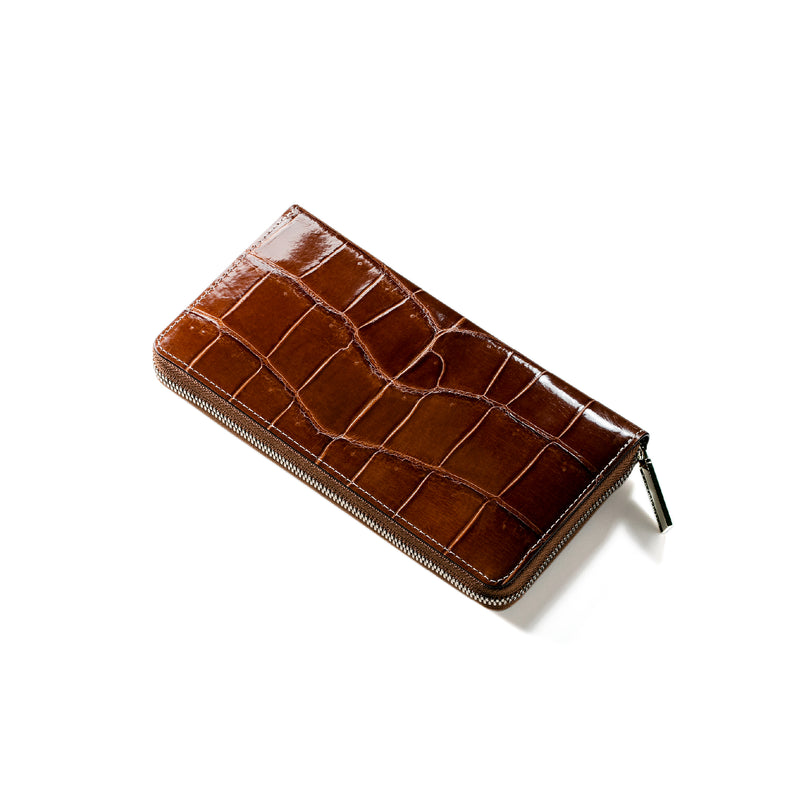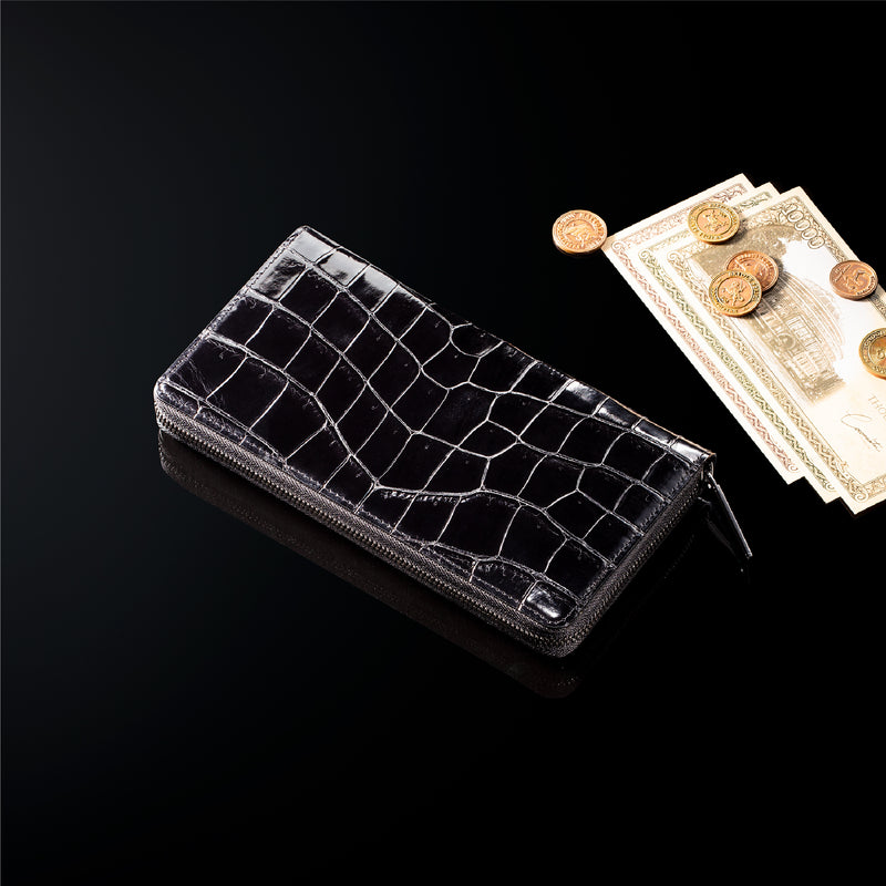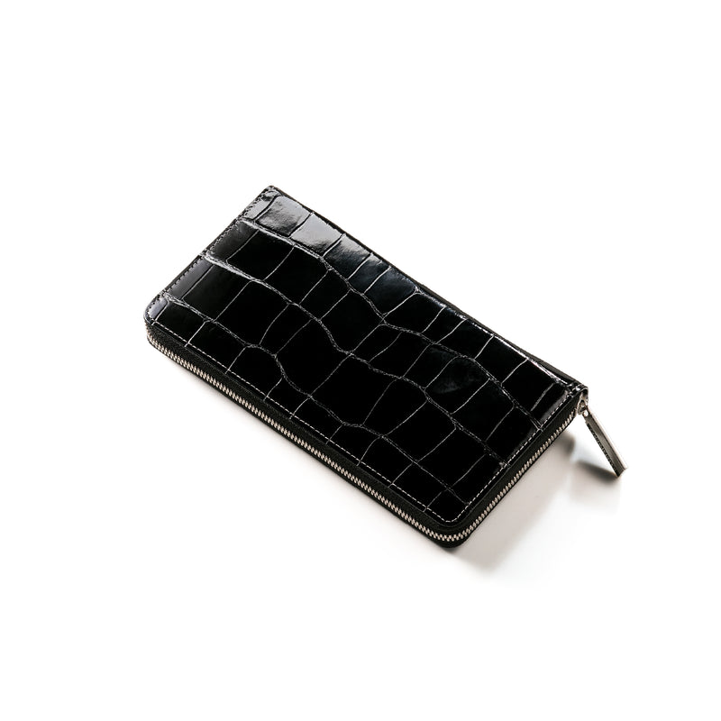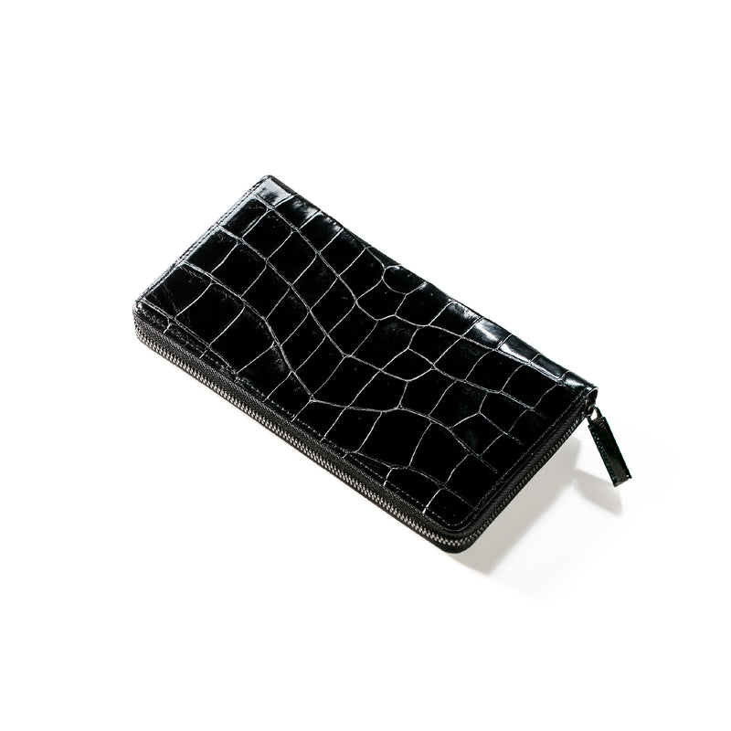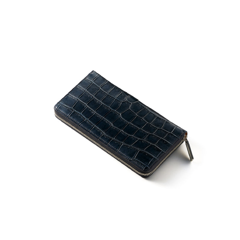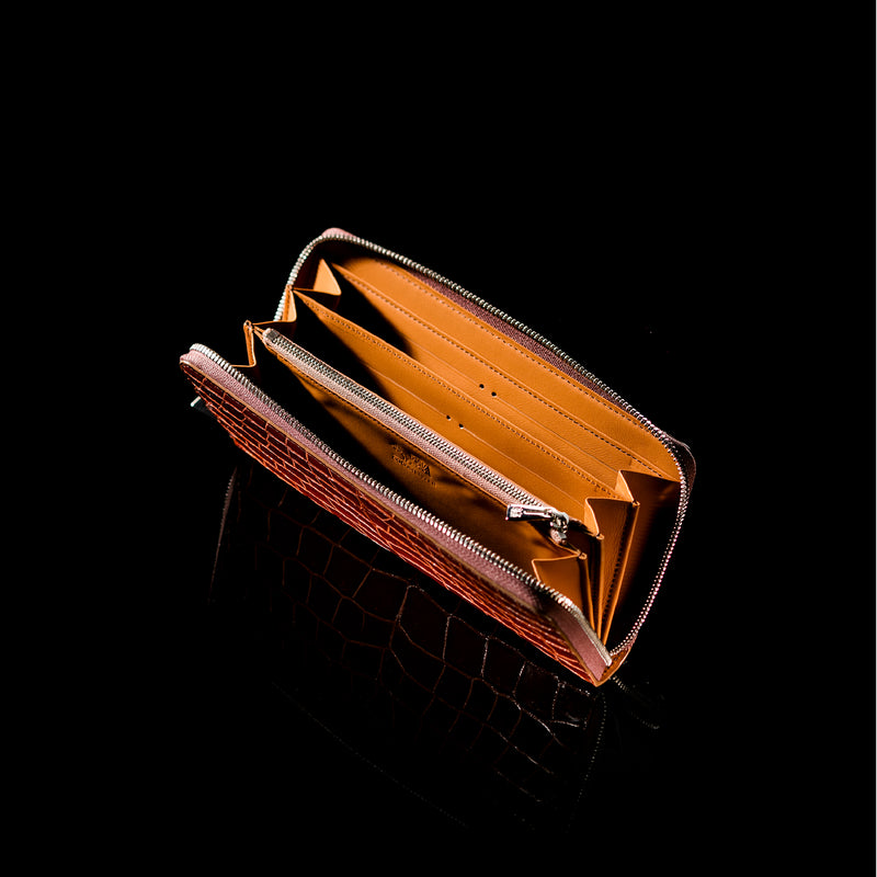 ダイナミックで芸術的な究極クロコダイルコレクション。独自の感性により生まれたフランス産の最高級クロコダイルレザー。現代のライフスタイルに合う様に、日本のクロコダイル熟練工が仕立てます。大きめのラウンドジップ型の長財布で、容量が大きめで使い勝手が良いのが特徴です。中身を落とす心配もなく、重厚感のあるフォルムが格好良くお洒落です。| 外寸 | 縦11.5cm×横21cm×厚み2.3cm |