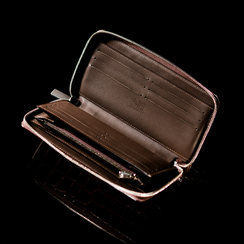 ダイナミックで芸術的な究極クロコダイルコレクション。独自の感性により生まれたフランス産の最高級クロコダイルレザー。現代のライフスタイルに合う様に、日本のクロコダイル熟練工が仕立てます。セパレート式ラウンドジップ長財布は、180度開く仕様になっており、片方に小銭入れと札入れが付いており、もう片方にはカード入れがメインのスペースになっています。とにかく大判で大容量さが魅力のラウンドジップ長財布です。| 外寸 | 縦11.5cm×横21cm×厚み2.3cm |