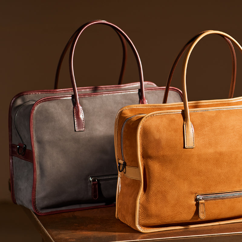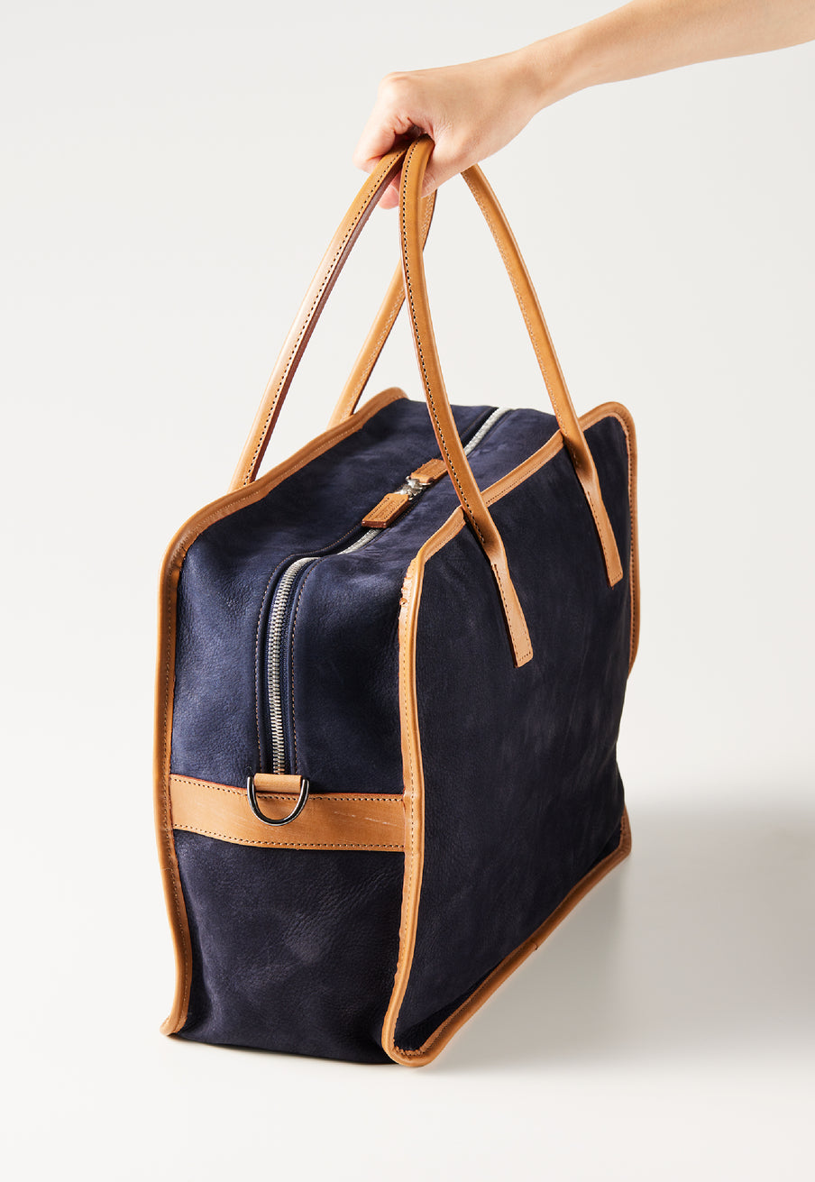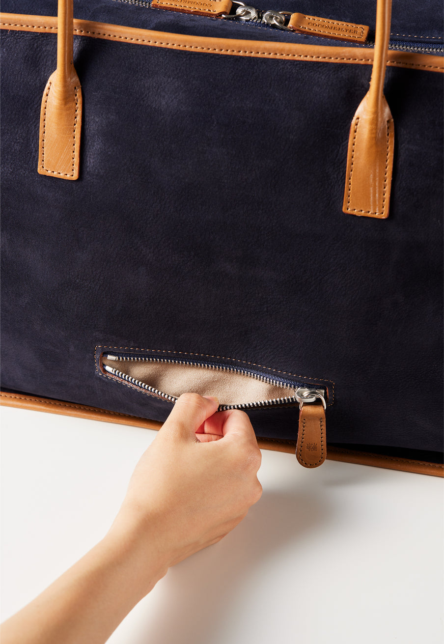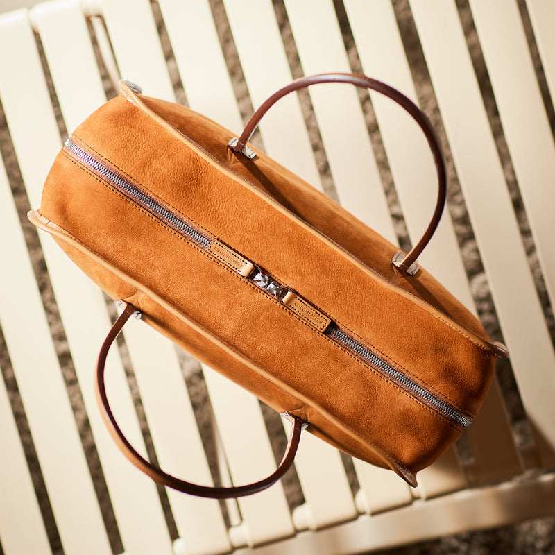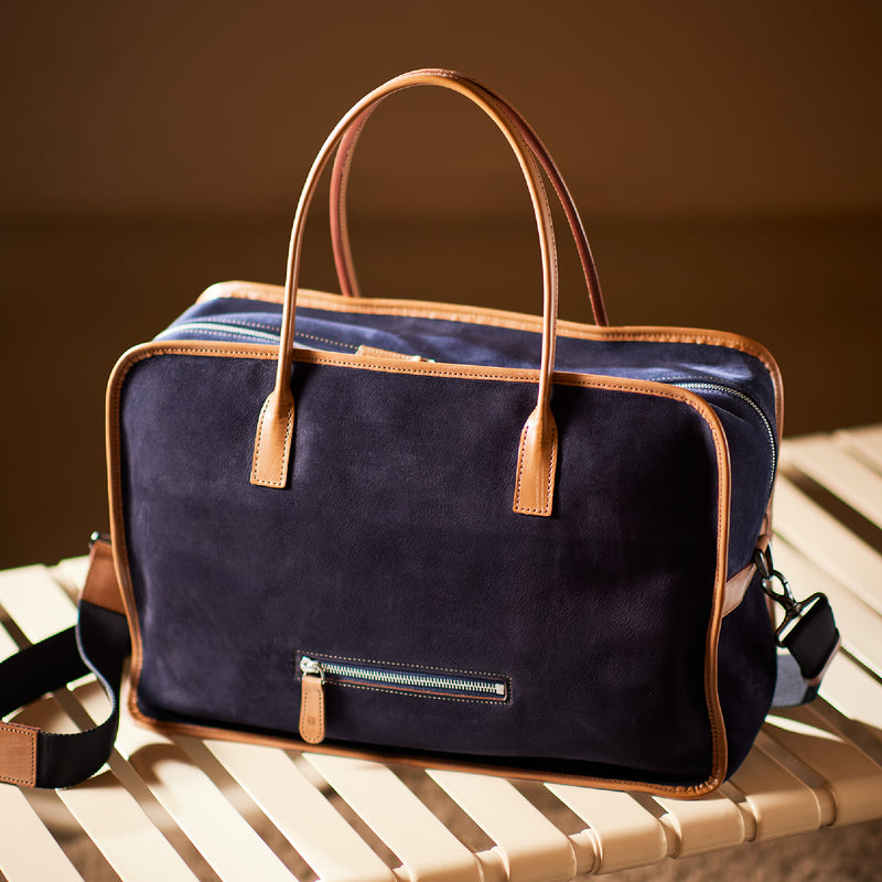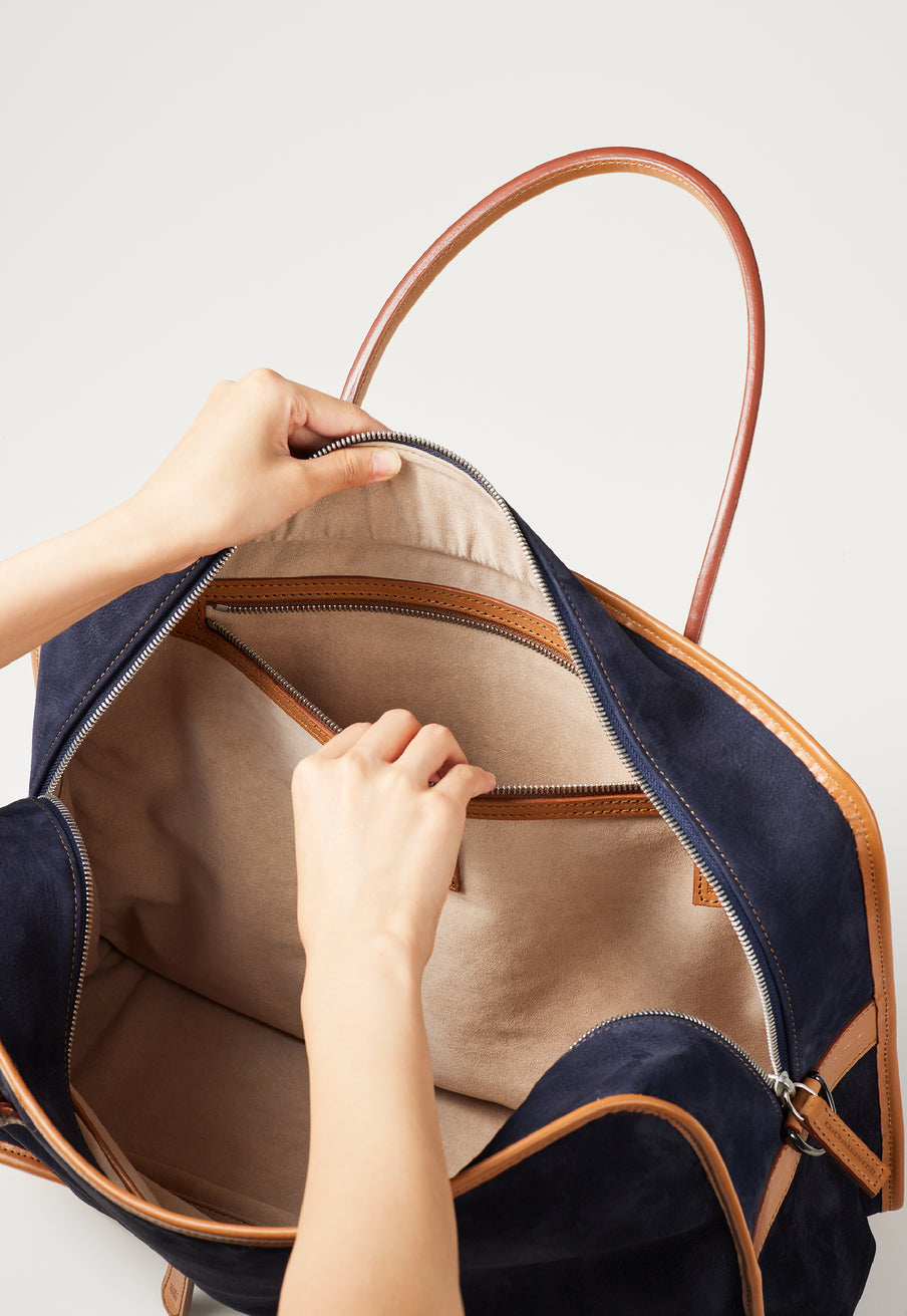 紀元前ルーツの英国産オークバークを持ち手と外枠に使用し、本体にはスペイン原皮のヌバックを採用しました。ラグジュアリーホテルのプールサイドにある、大判なタオルはいつも心地よく水気を吸収してくれます。そこからインスピレーションしたのが、このクラシカルボストンです。タオルの様に水気は吸収しませんが、質感の心地よさは別格です。| 外寸 | 縦29.5cm×横42.5cm×底厚み15cm (ファスナーポケット)縦8.5cm×横14cm |
