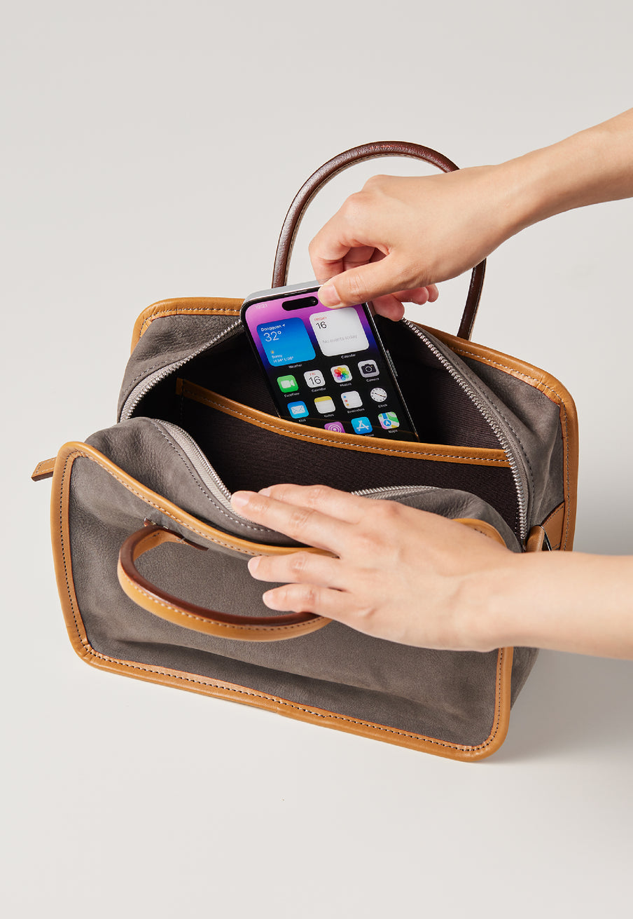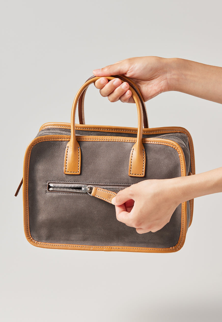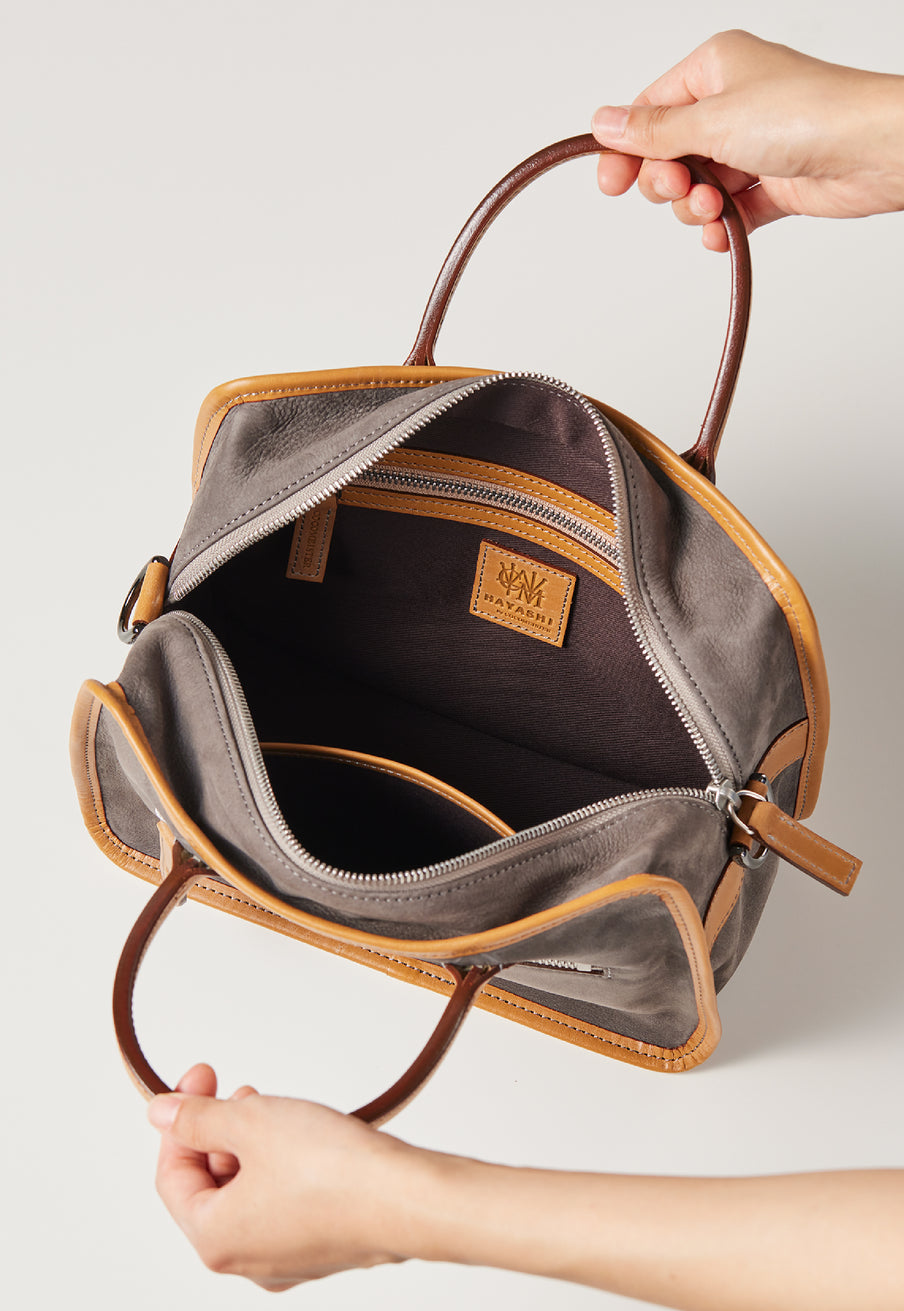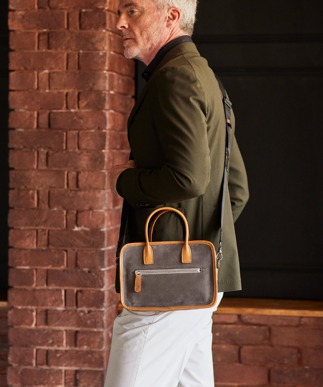 質感にこだわり抜いた極上スペインヌバックを本体に使用し、希少皮革オークバークをフチや持ち手に採用しクラシカルな風合いを取り入れたミニバッグ。特別な熟練工が仕立てることで実現した、絶妙なフォルム。素材の組み合わせ。ショルダーベルトを装着し休日を優雅に持ち運ぶ、ショルダースタイルを基本とし、ベルトを外すことでセカンドバッグとしてもお洒落に使えます。| 外寸 | 縦18cm×横25cm×底厚み12cm (ファスナーポケット)縦9cm×横17.5cm |