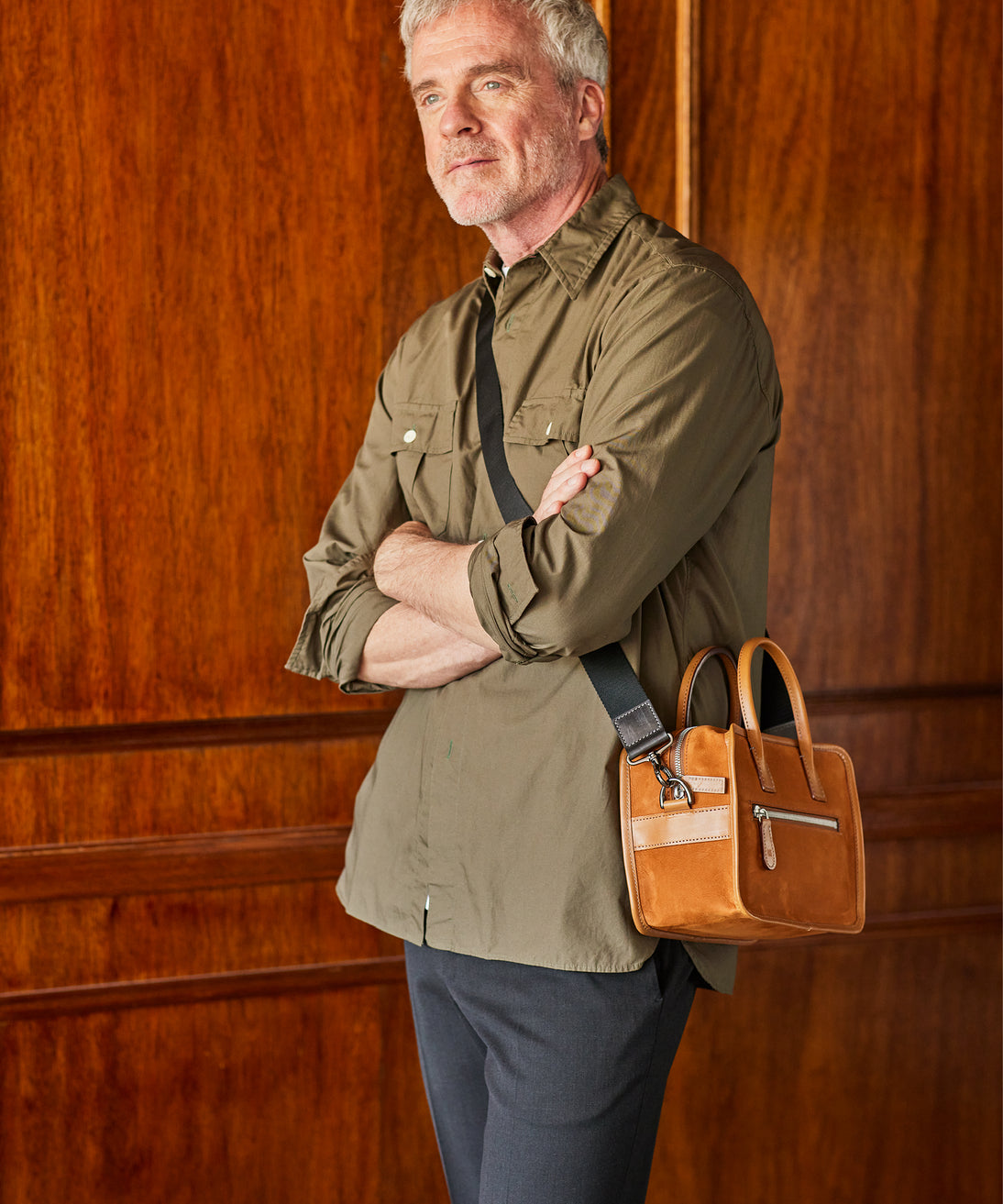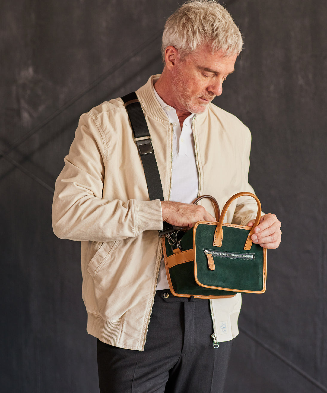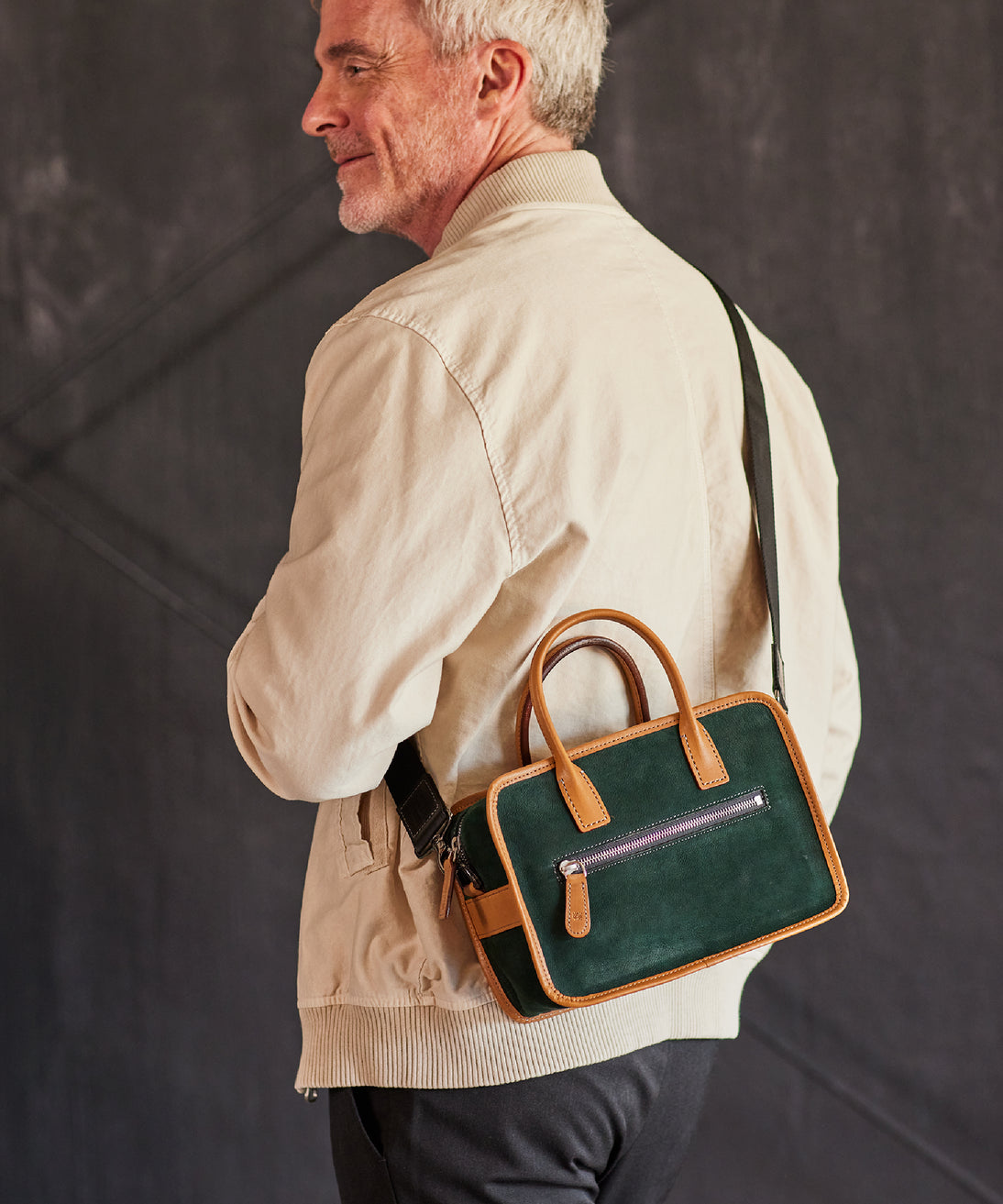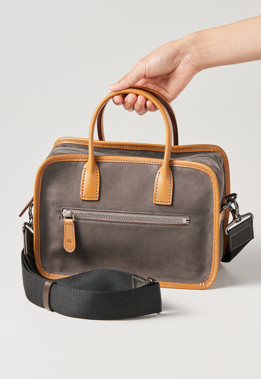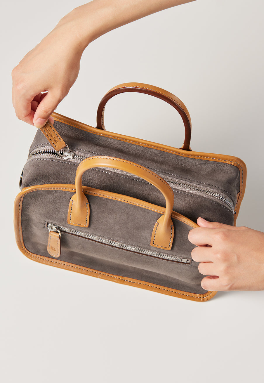 質感にこだわり抜いた極上スペインヌバックを本体に使用し、希少皮革オークバークをフチや持ち手に採用しクラシカルな風合いを取り入れたミニバッグ。特別な熟練工が仕立てることで実現した、絶妙なフォルム。素材の組み合わせ。ショルダーベルトを装着し休日を優雅に持ち運ぶ、ショルダースタイルを基本とし、ベルトを外すことでセカンドバッグとしてもお洒落に使えます。| 外寸 | 縦18cm×横25cm×底厚み12cm (ファスナーポケット)縦9cm×横17.5cm |