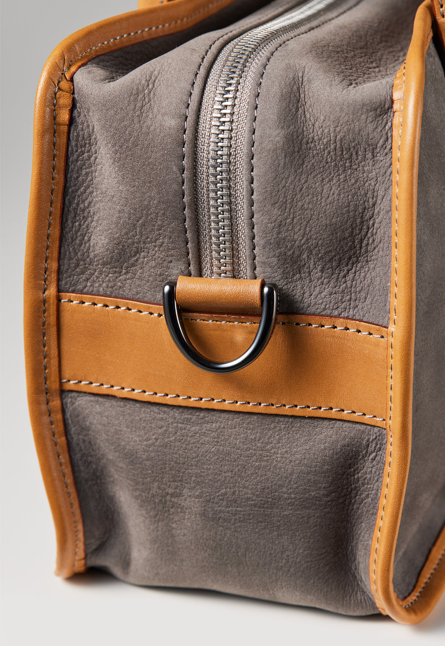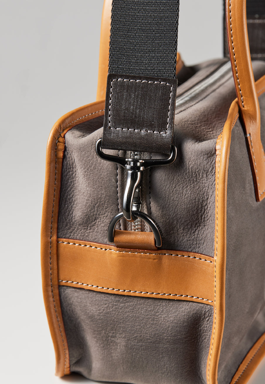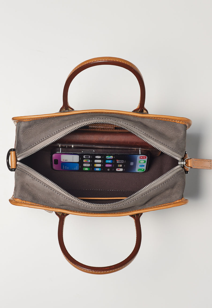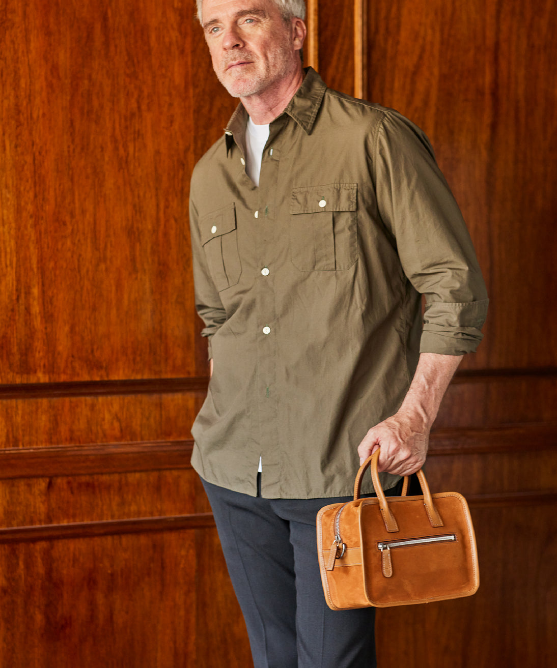 質感にこだわり抜いた極上スペインヌバックを本体に使用し、希少皮革オークバークをフチや持ち手に採用しクラシカルな風合いを取り入れたミニバッグ。特別な熟練工が仕立てることで実現した、絶妙なフォルム。素材の組み合わせ。ショルダーベルトを装着し休日を優雅に持ち運ぶ、ショルダースタイルを基本とし、ベルトを外すことでセカンドバッグとしてもお洒落に使えます。| 外寸 | 縦18cm×横25cm×底厚み12cm (ファスナーポケット)縦9cm×横17.5cm |