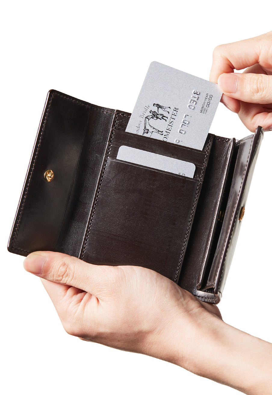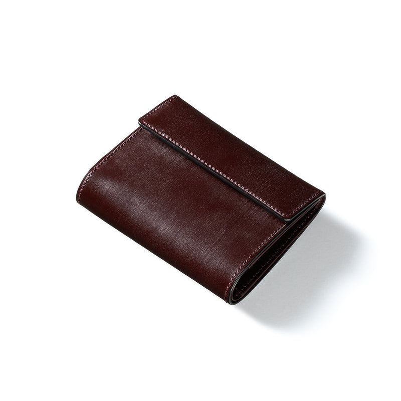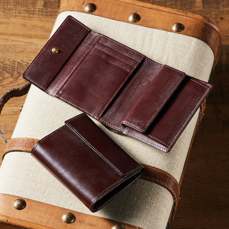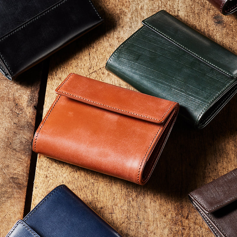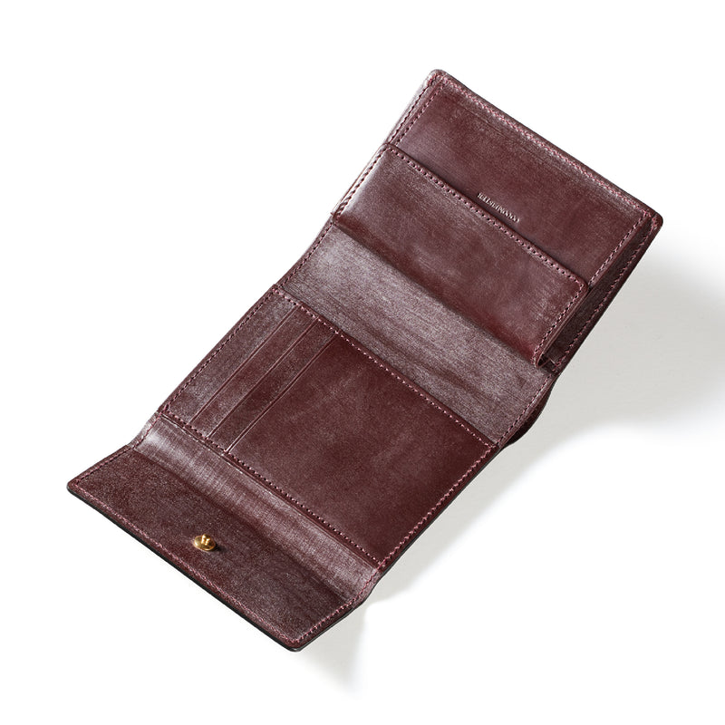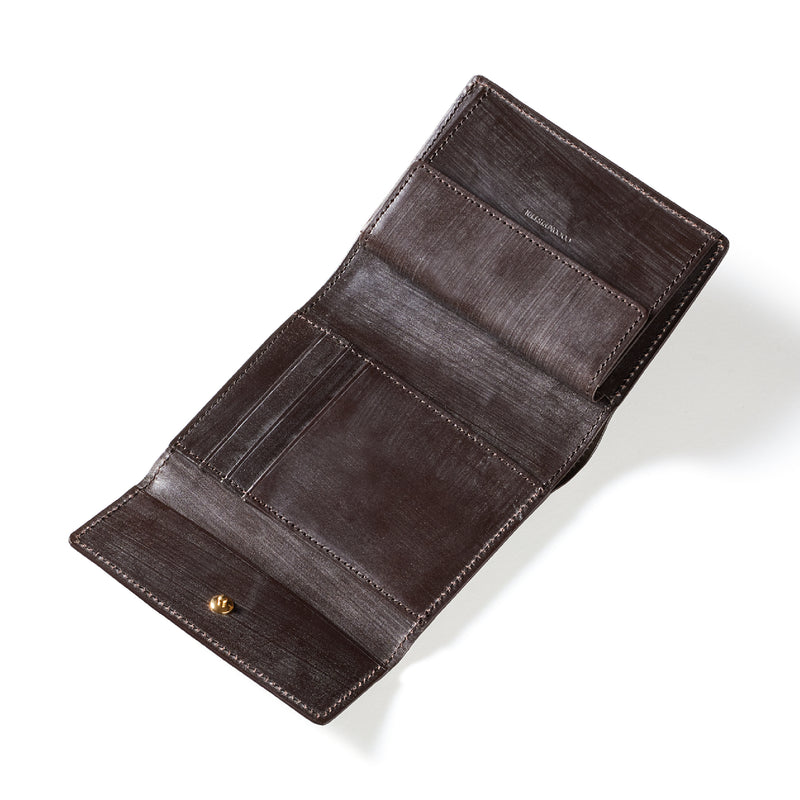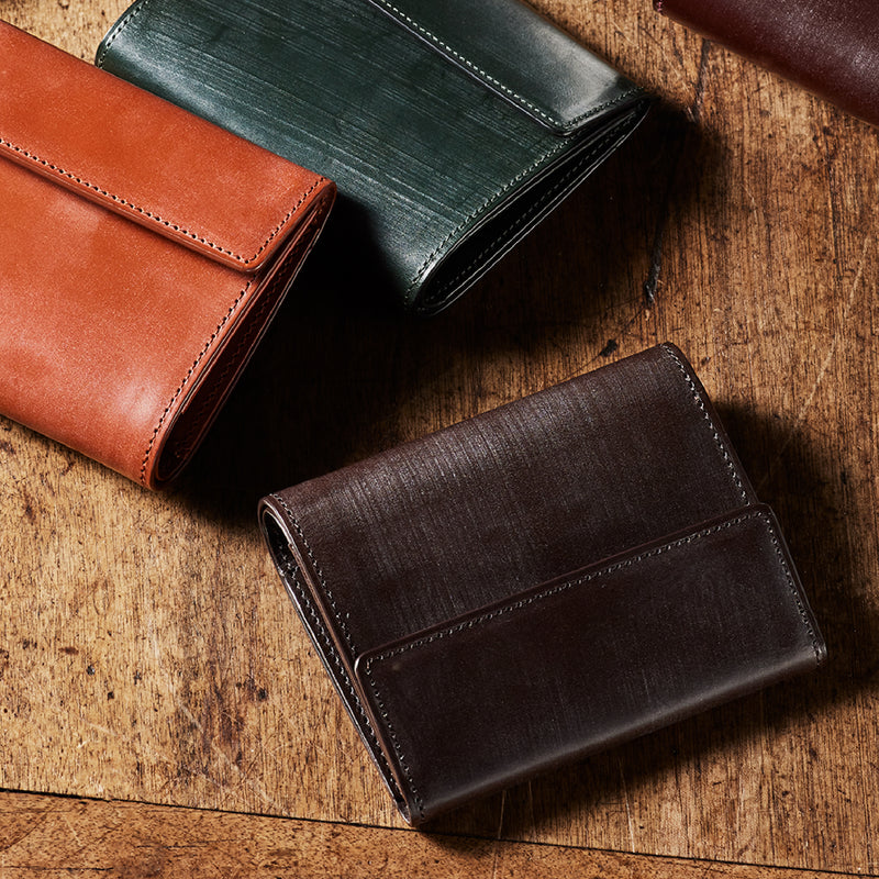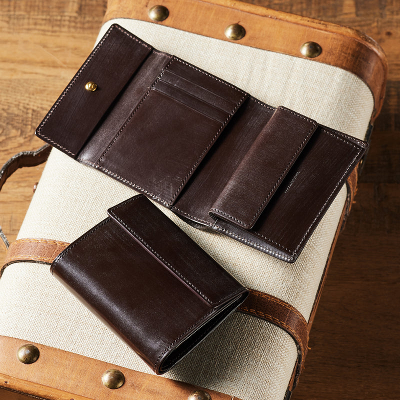 英国文化の真髄を追求したシリーズ、ジョージブライドル。イギリス産の最高級馬具革を全面に使用、高い技術力を誇る日本の熟練職人の技により、トラディショナルで芸術的な作品を作り上げます。表裏ブライドルレザーが美しく洗練されています。折りたたみタイプの3つ折り財布、手帳の様なお洒落なフォルムが魅力。手に収まるデザインで、置いても絵になる格好良さがあります。| 外寸 | 縦9.4×横11.4×厚さ3cm |