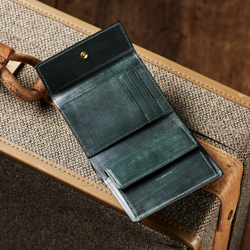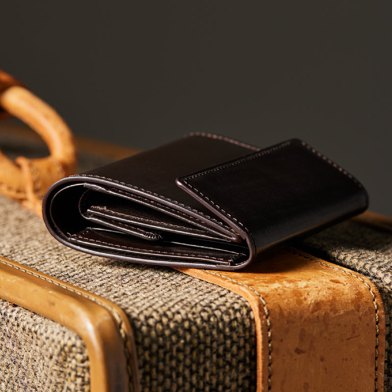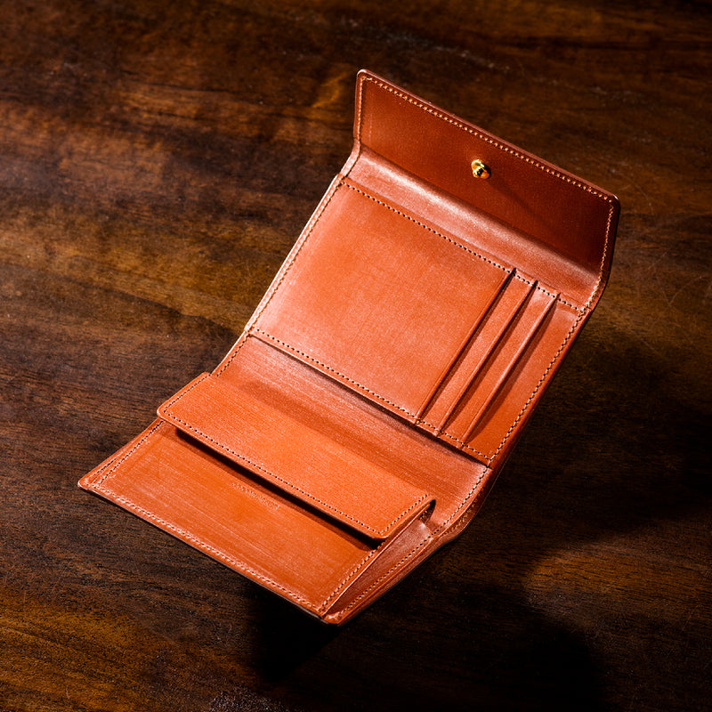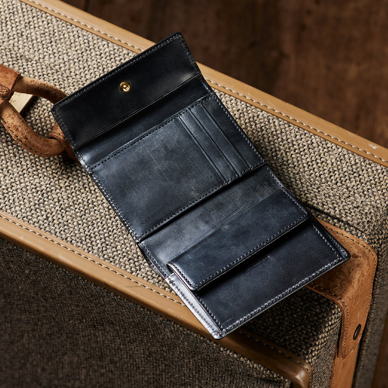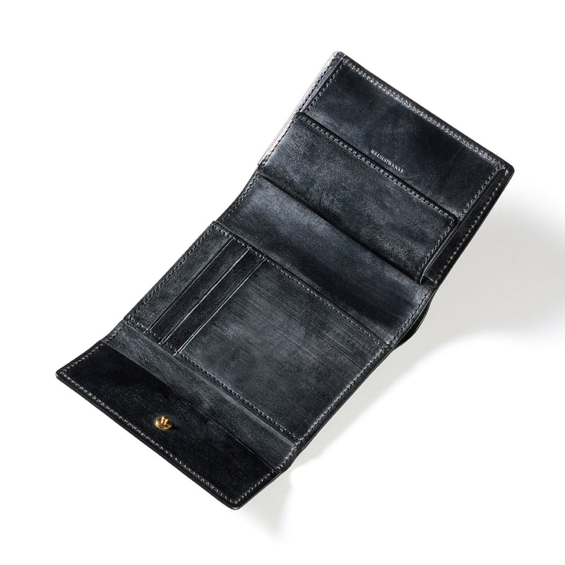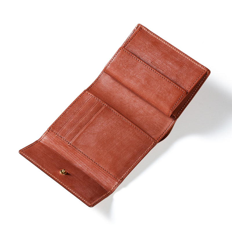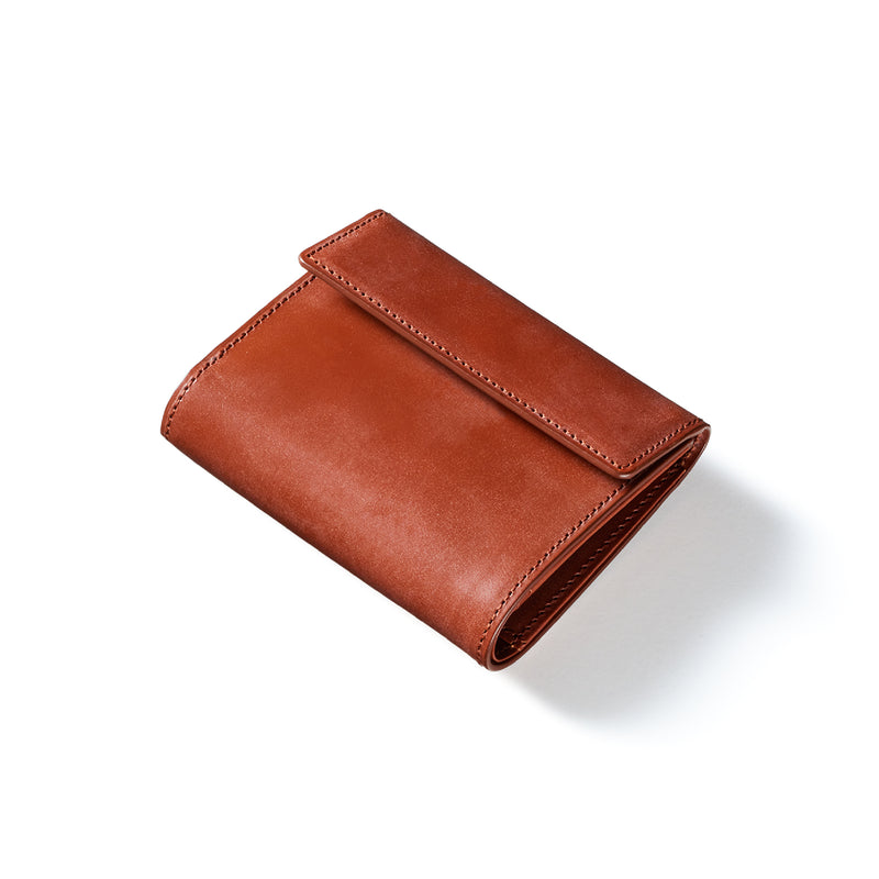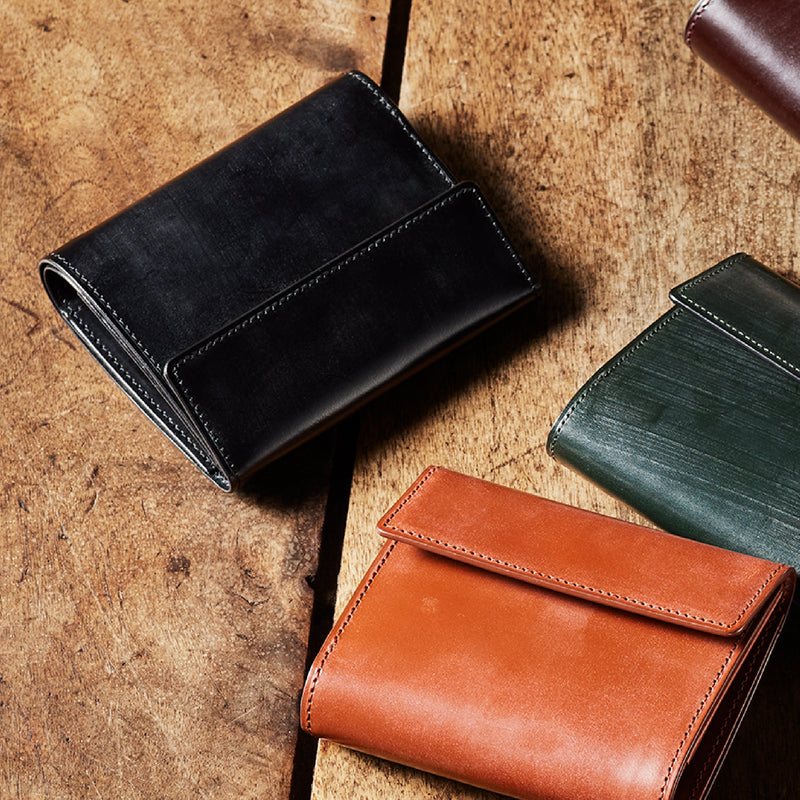 英国文化の真髄を追求したシリーズ、ジョージブライドル。イギリス産の最高級馬具革を全面に使用、高い技術力を誇る日本の熟練職人の技により、トラディショナルで芸術的な作品を作り上げます。表裏ブライドルレザーが美しく洗練されています。折りたたみタイプの3つ折り財布、手帳の様なお洒落なフォルムが魅力。手に収まるデザインで、置いても絵になる格好良さがあります。| 外寸 | 縦9.4×横11.4×厚さ3cm |