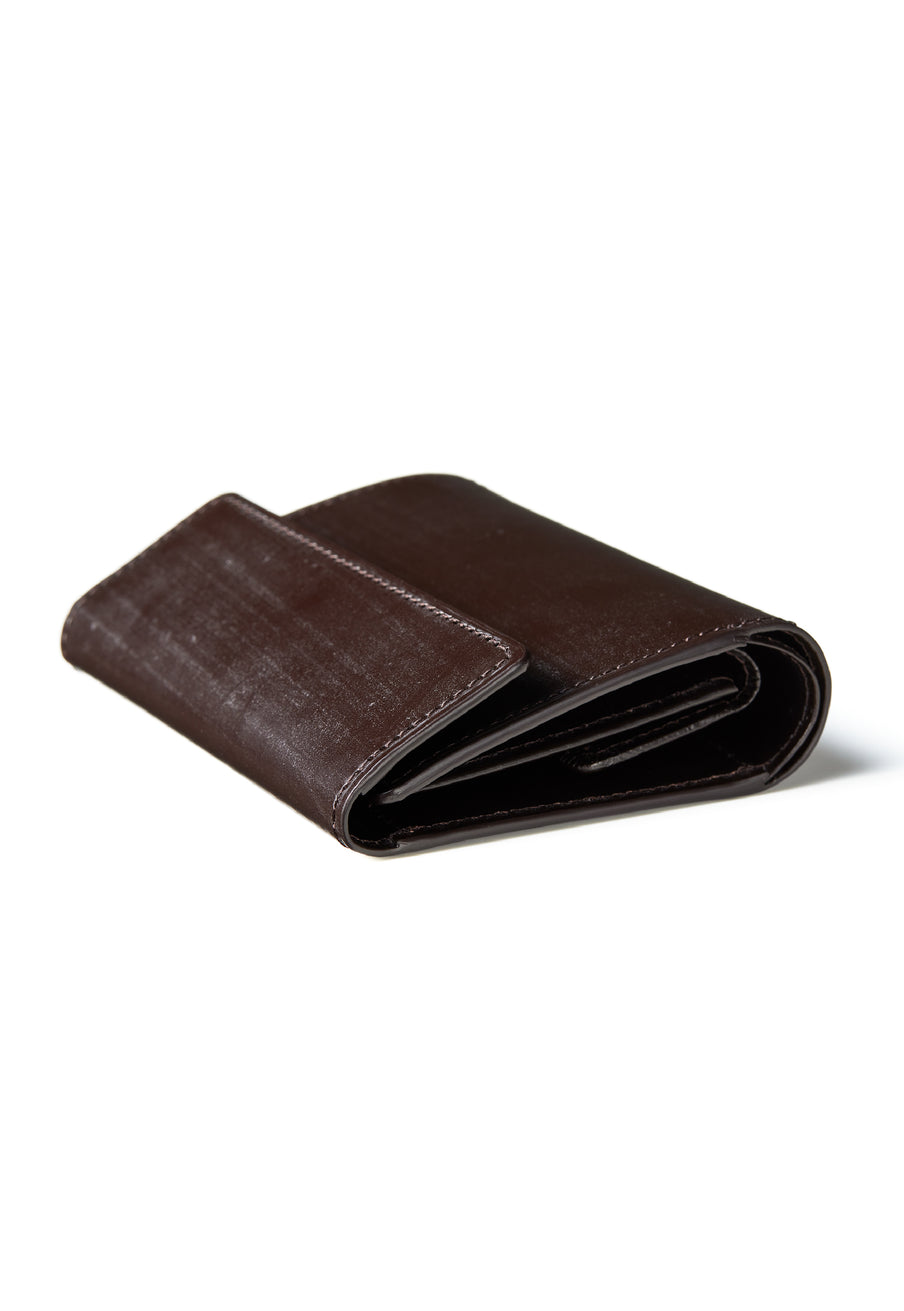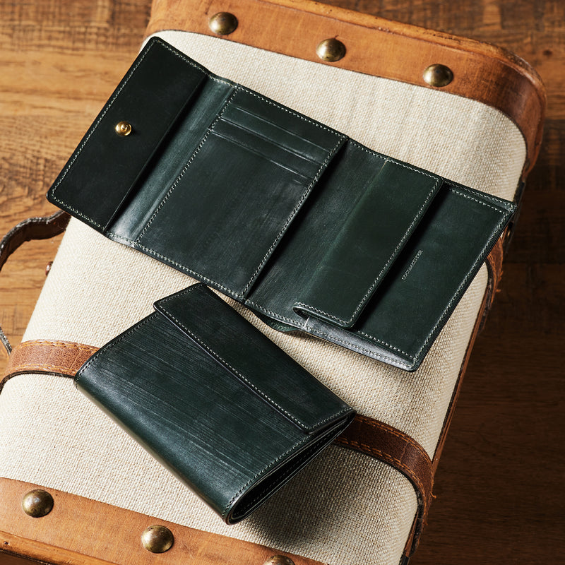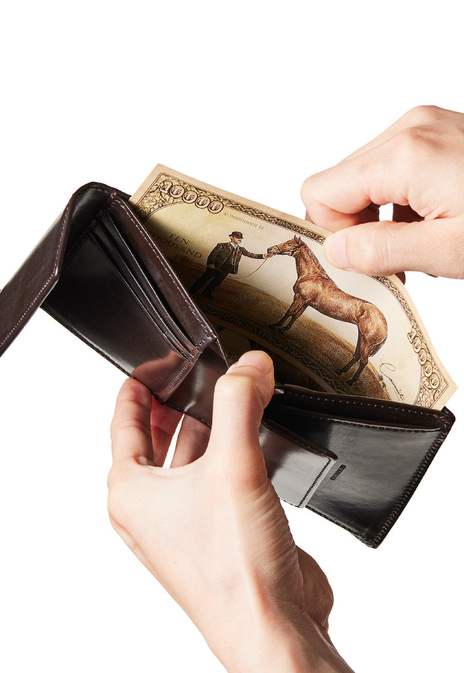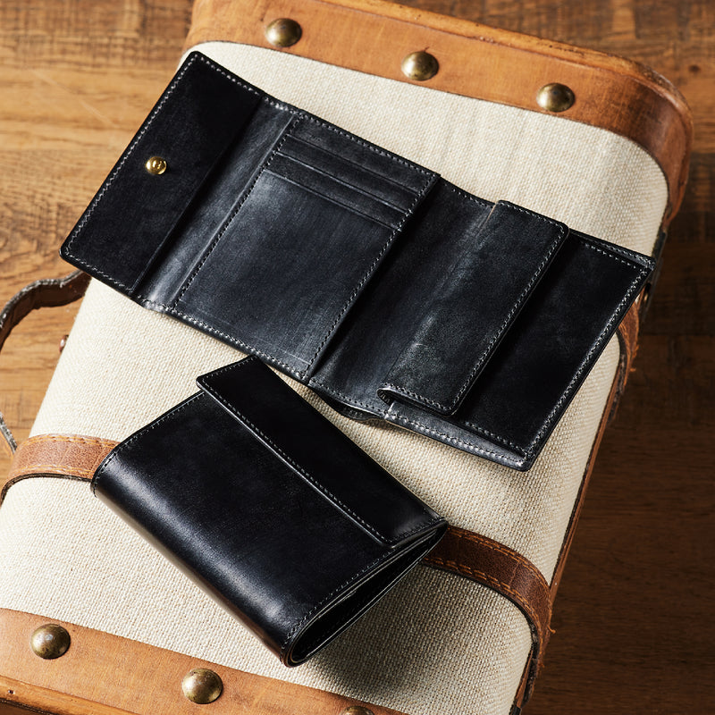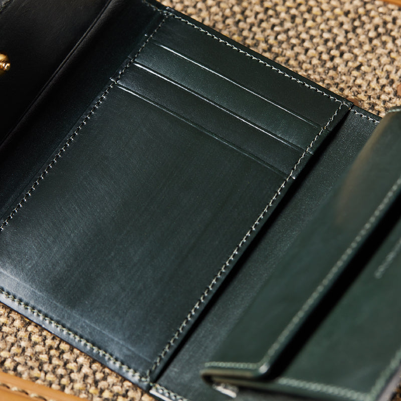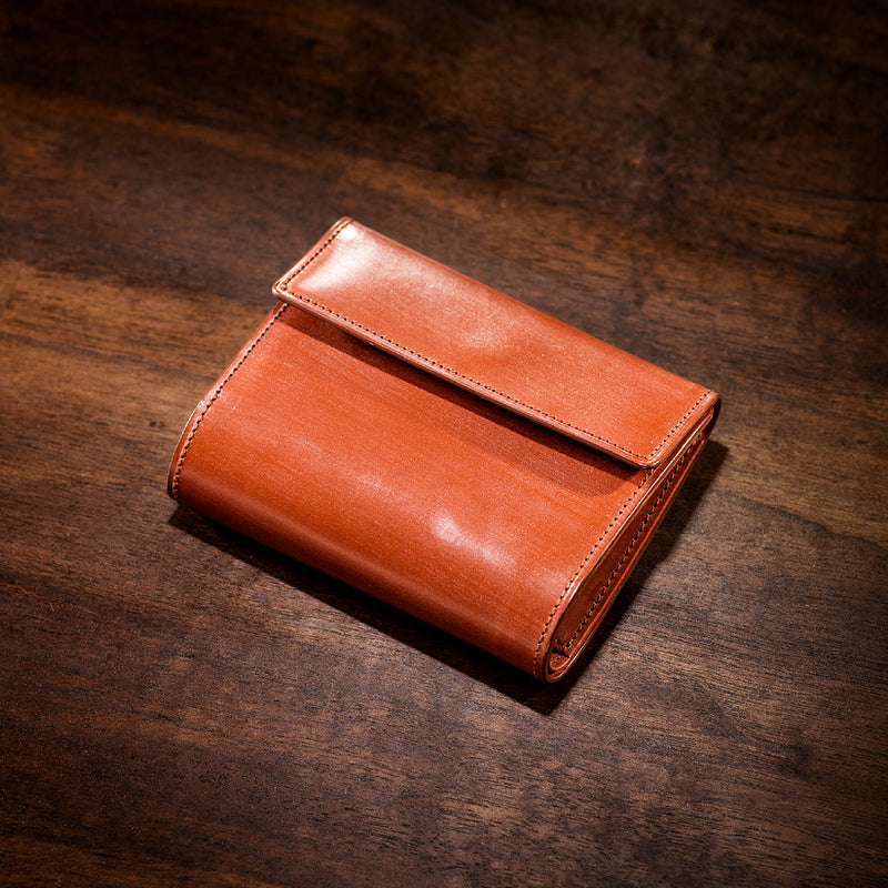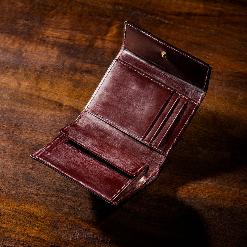 英国文化の真髄を追求したシリーズ、ジョージブライドル。イギリス産の最高級馬具革を全面に使用、高い技術力を誇る日本の熟練職人の技により、トラディショナルで芸術的な作品を作り上げます。表裏ブライドルレザーが美しく洗練されています。折りたたみタイプの3つ折り財布、手帳の様なお洒落なフォルムが魅力。手に収まるデザインで、置いても絵になる格好良さがあります。| 外寸 | 縦9.4×横11.4×厚さ3cm |