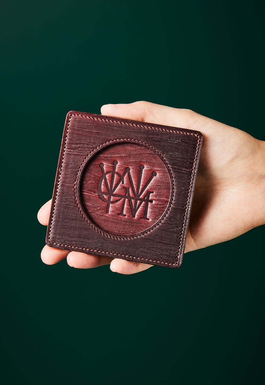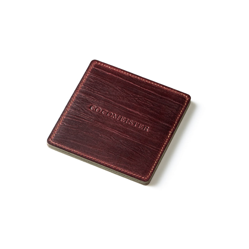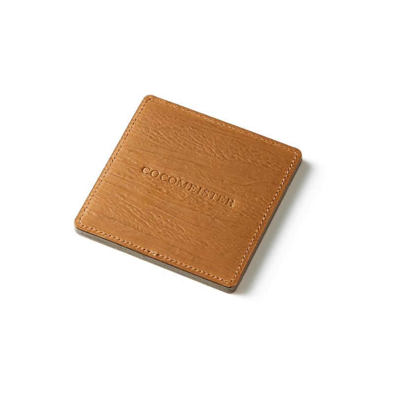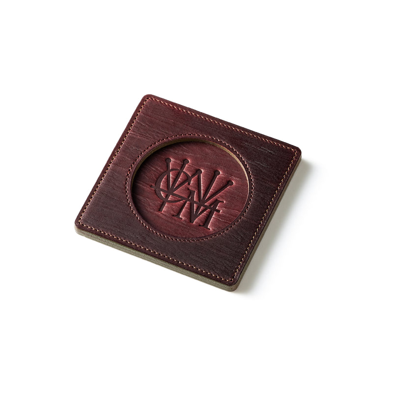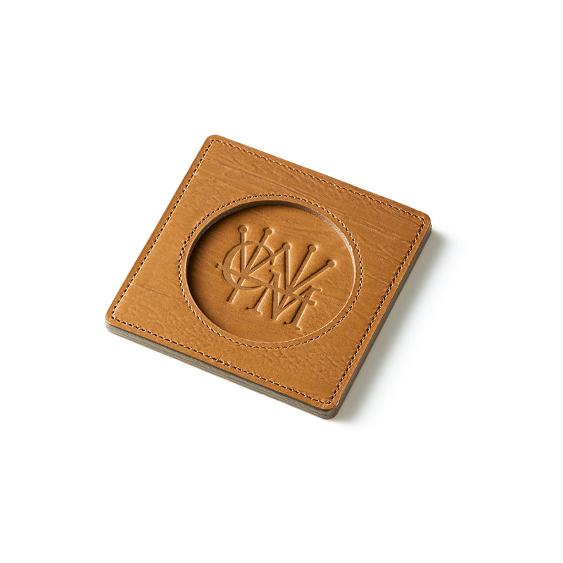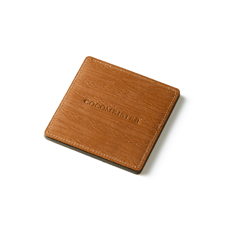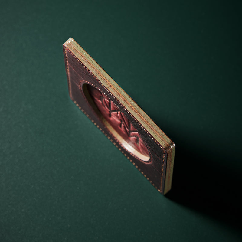 外装にはプレスオンされたオークバークレザーを使用。オークバークレザーの弾力性、高級家具の木目の様に美しい表情をお楽しみ頂けます。味わい深さと洒落感が見事に調和した。全てプレスオンされたオークバークで仕立てており、革を重ねることで、硬質な質感を実現しました。円の部分は直径6cmとなり、少し小ぶりでスマートなサイズです。| 外寸 | 縦9cm×横9cm×厚み0.6cm |