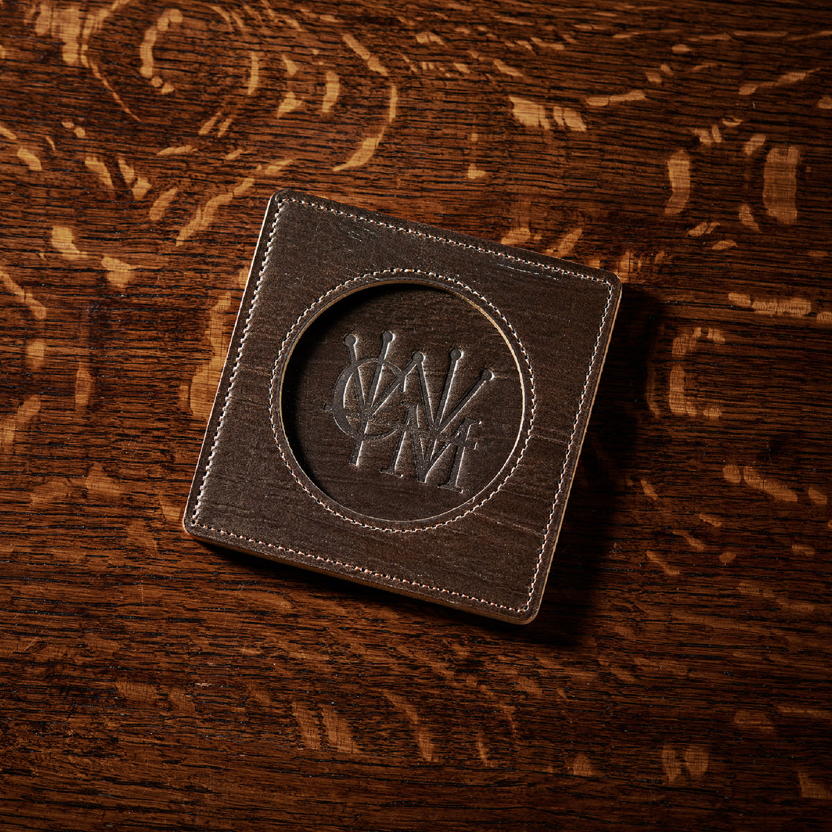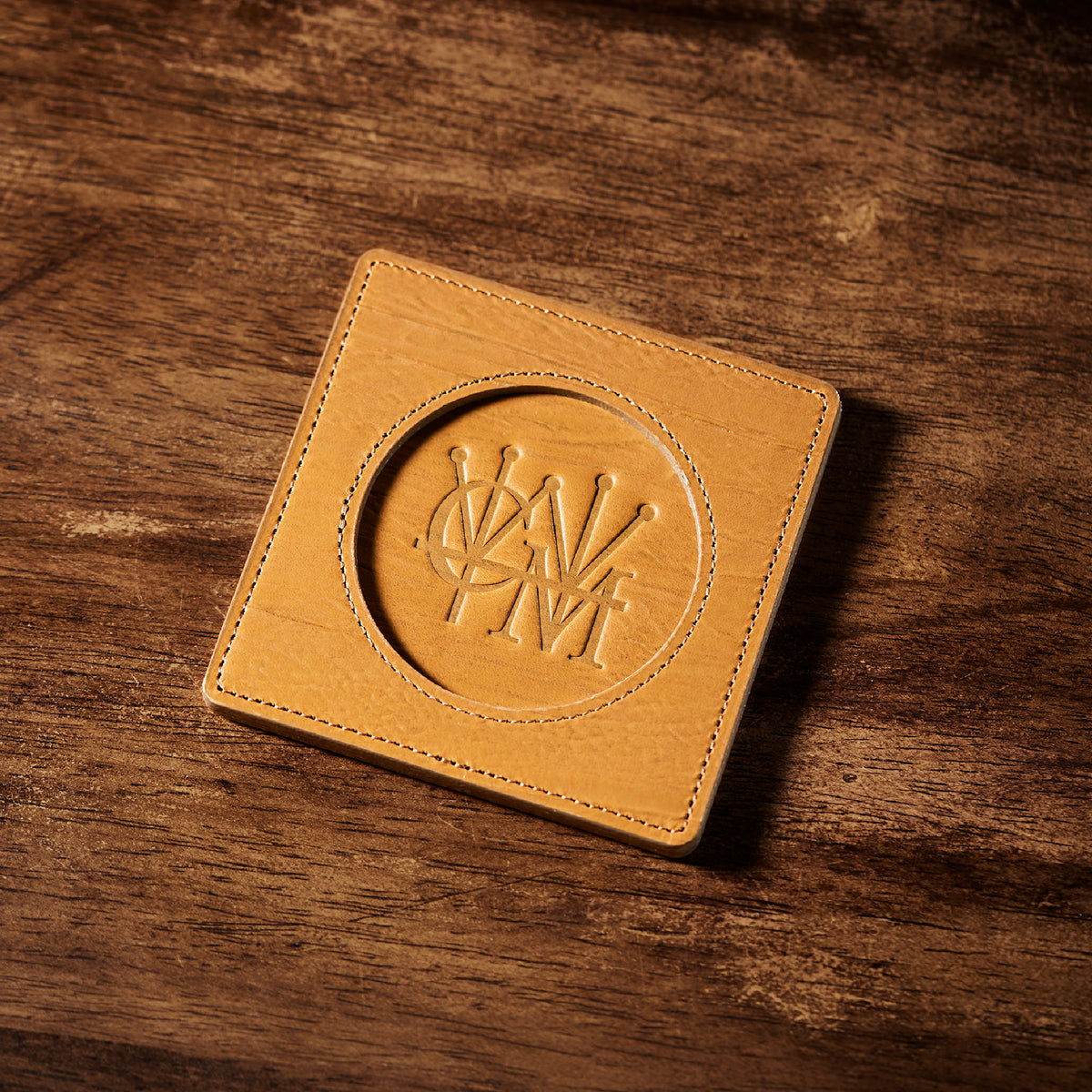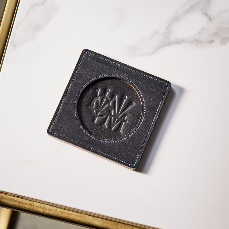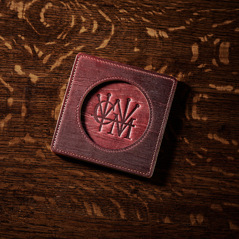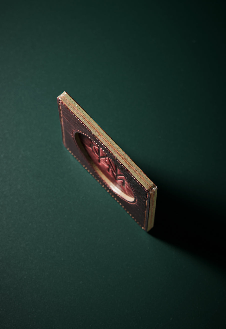 外装にはプレスオンされたオークバークレザーを使用。オークバークレザーの弾力性、高級家具の木目の様に美しい表情をお楽しみ頂けます。味わい深さと洒落感が見事に調和した。全てプレスオンされたオークバークで仕立てており、革を重ねることで、硬質な質感を実現しました。円の部分は直径6cmとなり、少し小ぶりでスマートなサイズです。| 外寸 | 縦9cm×横9cm×厚み0.6cm |