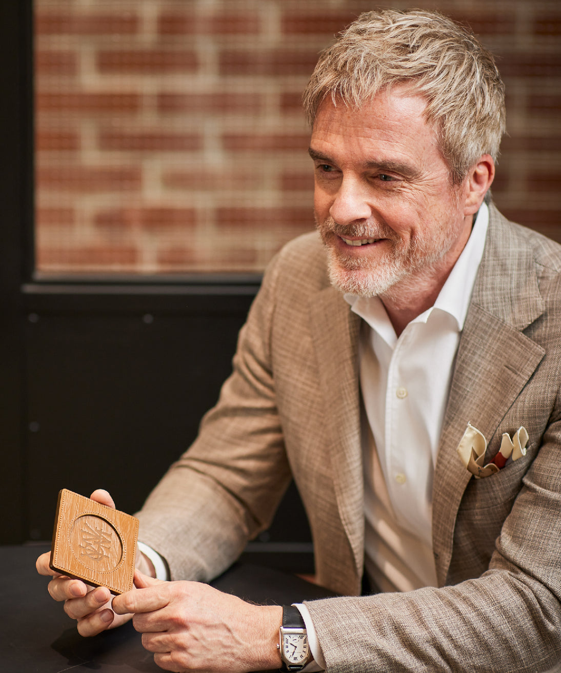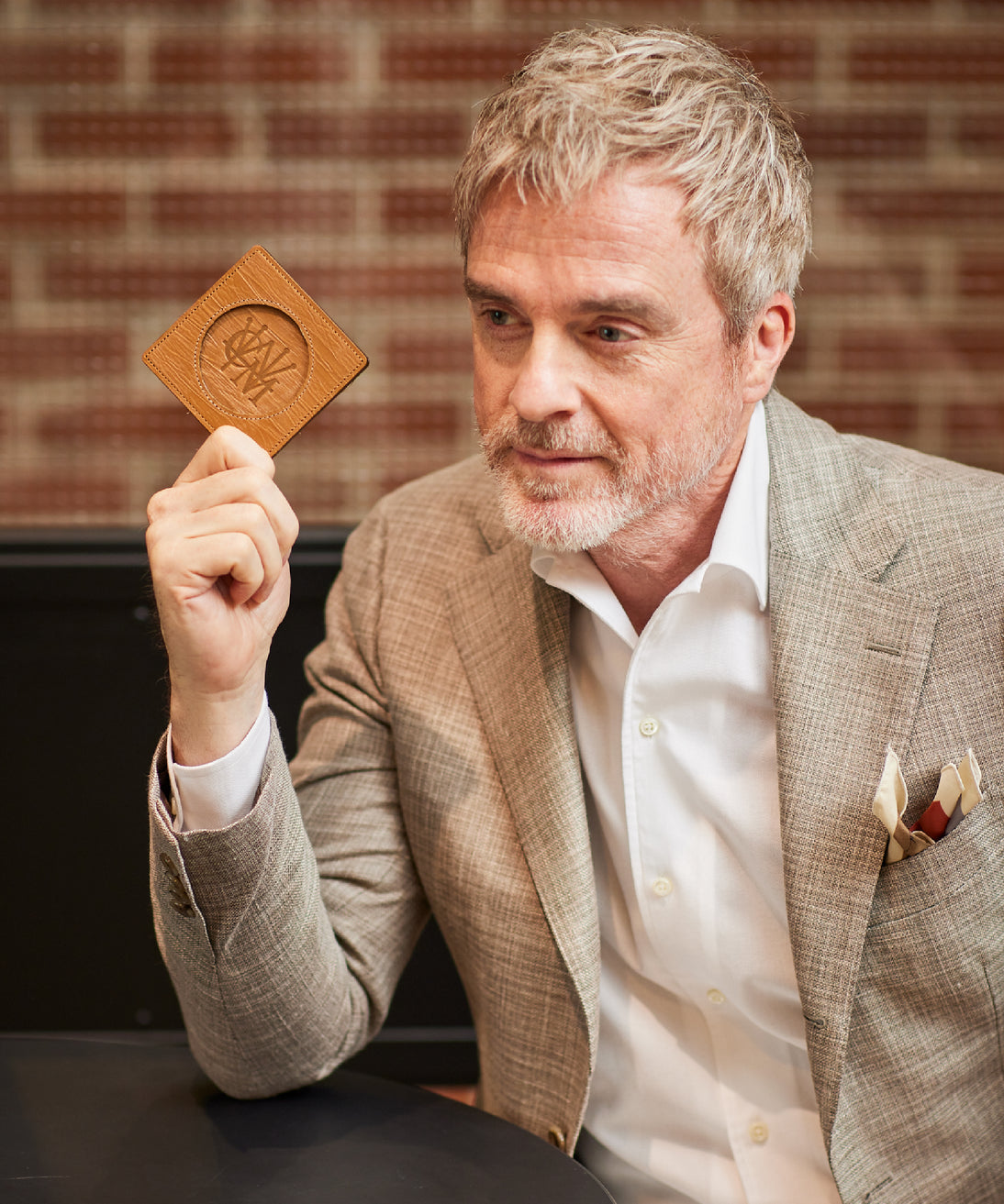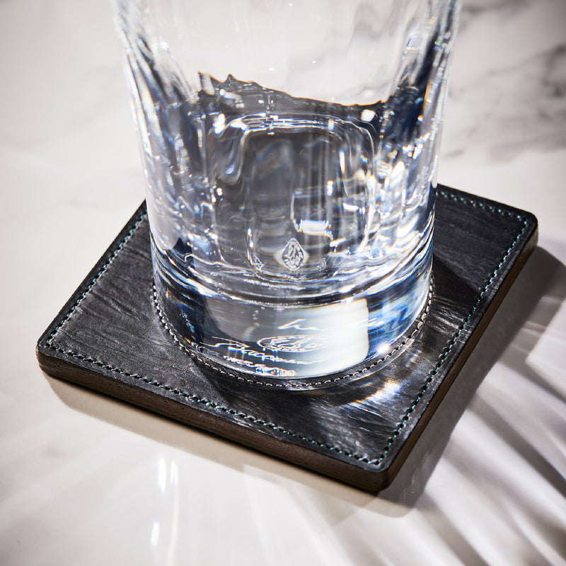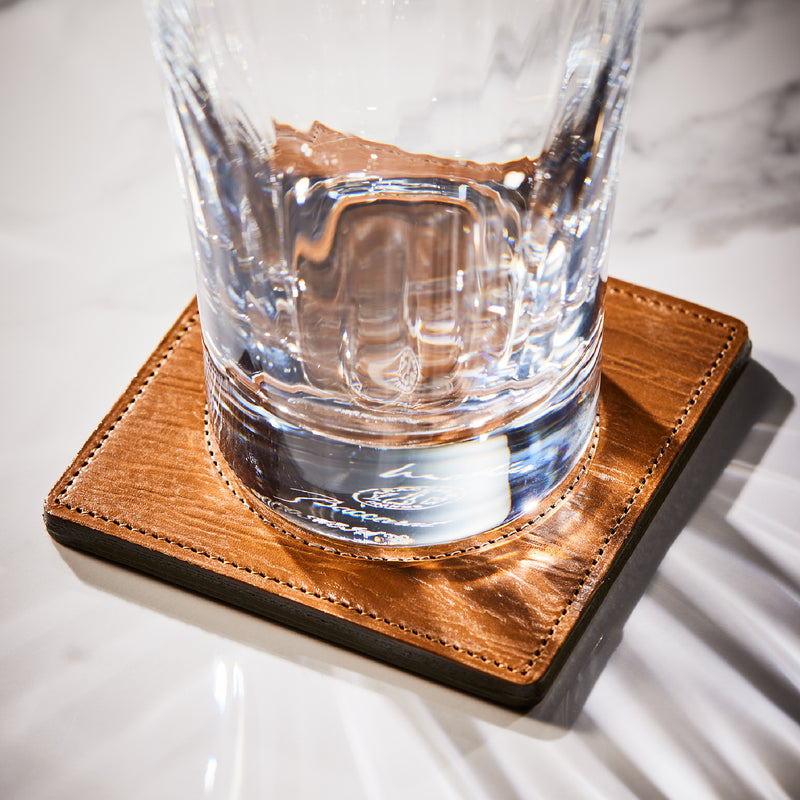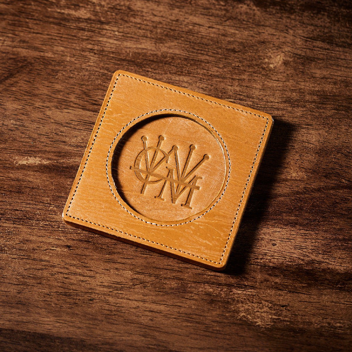 外装にはプレスオンされたオークバークレザーを使用。オークバークレザーの弾力性、高級家具の木目の様に美しい表情をお楽しみ頂けます。味わい深さと洒落感が見事に調和した。全てプレスオンされたオークバークで仕立てており、革を重ねることで、硬質な質感を実現しました。円の部分は直径6cmとなり、少し小ぶりでスマートなサイズです。| 外寸 | 縦9cm×横9cm×厚み0.6cm |