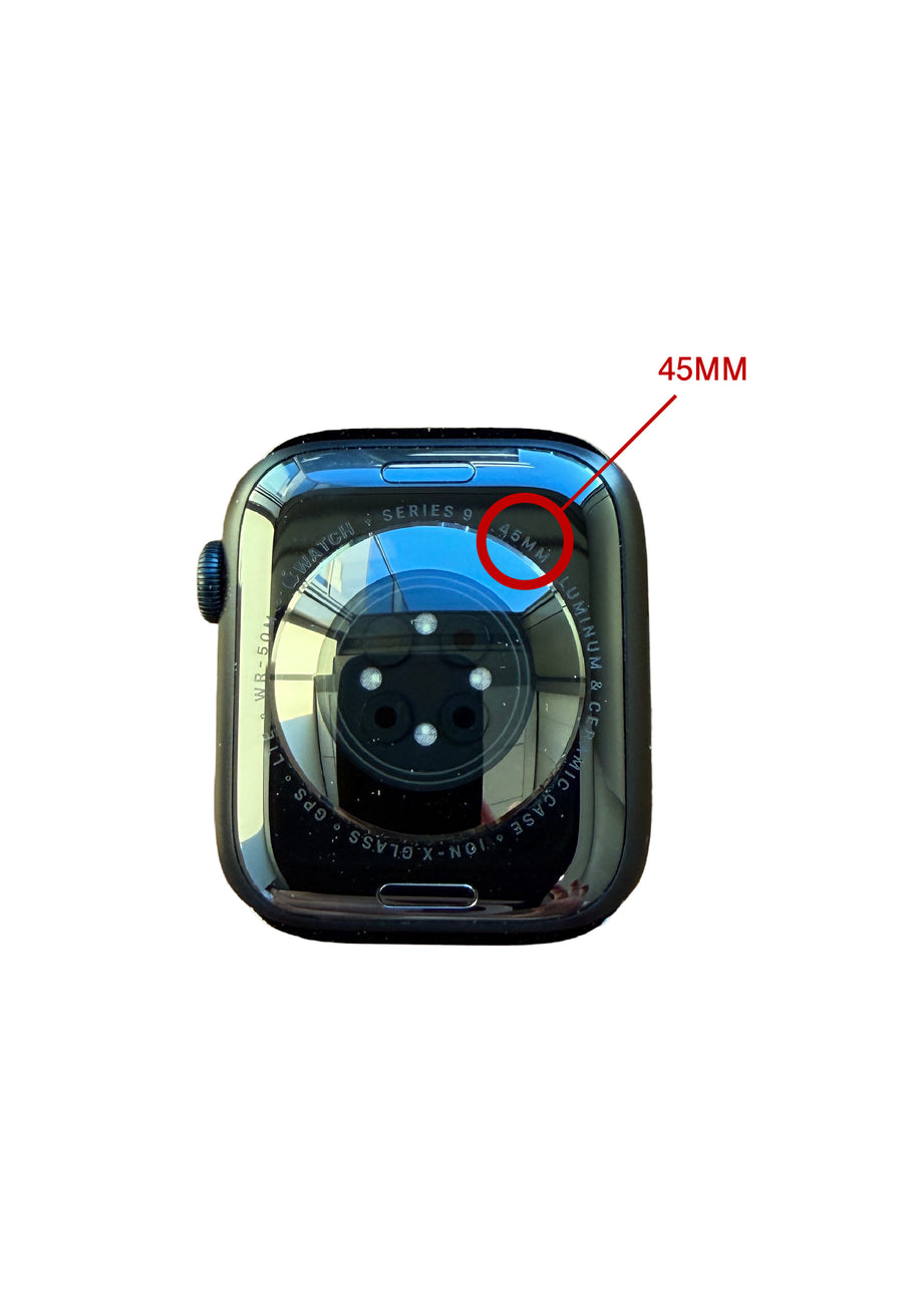 Apple Watch本体の裏面には、「40mm」「44mm」「45mm」などのサイズ表記が刻印されています。ご使用のApple Watchのサイズをご確認のうえ、対応するレザーバンドをお選びください。