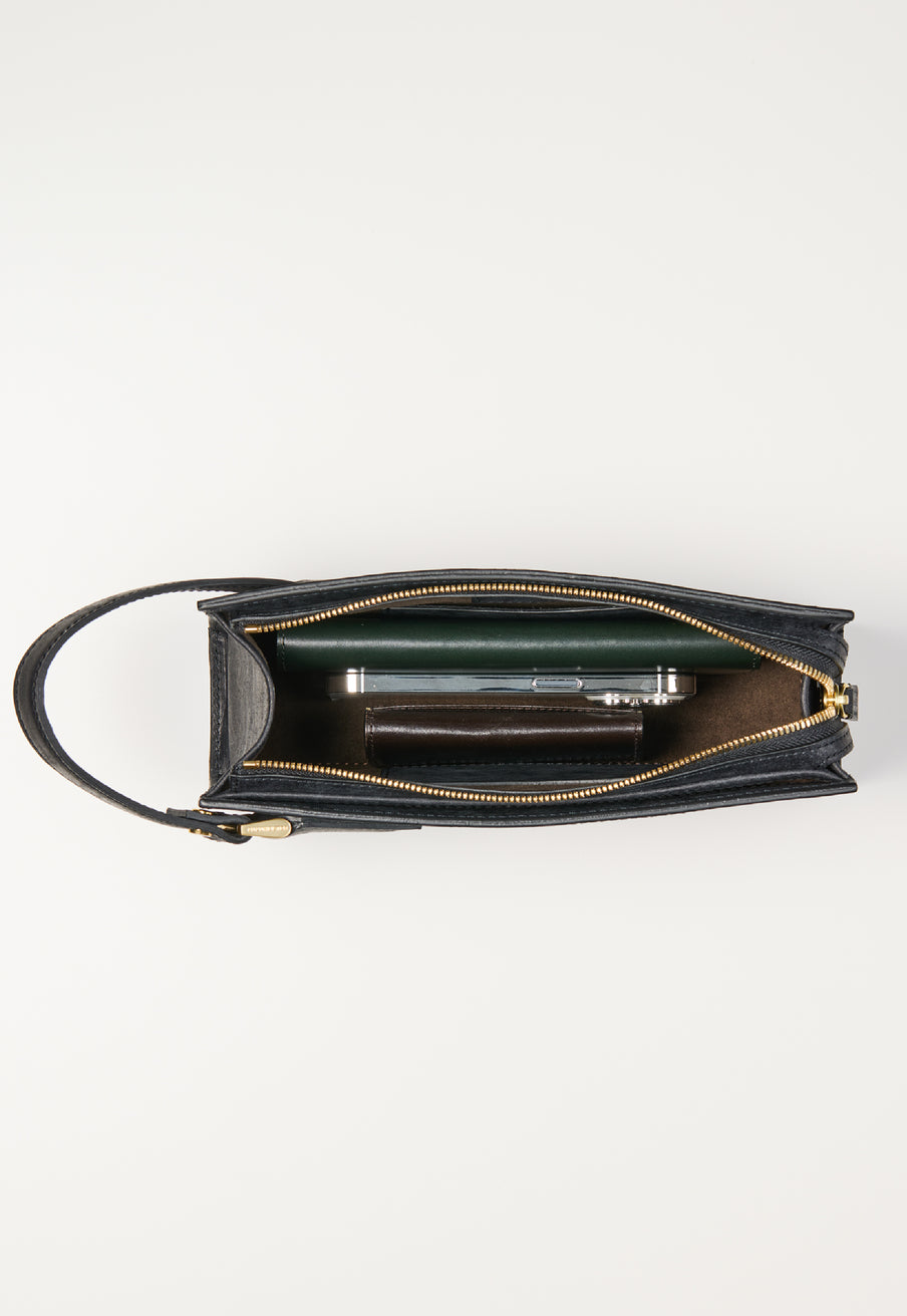内装はシンプルに整えられ、空間を無駄なく使える構成。 長財布やスマートフォンなどを収めても、形を崩さず収まります。