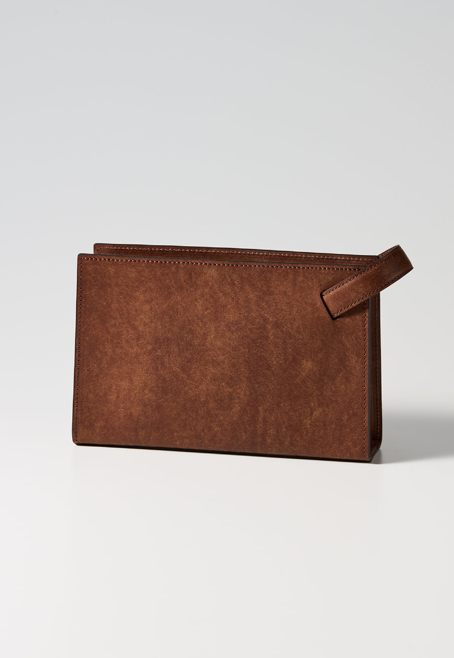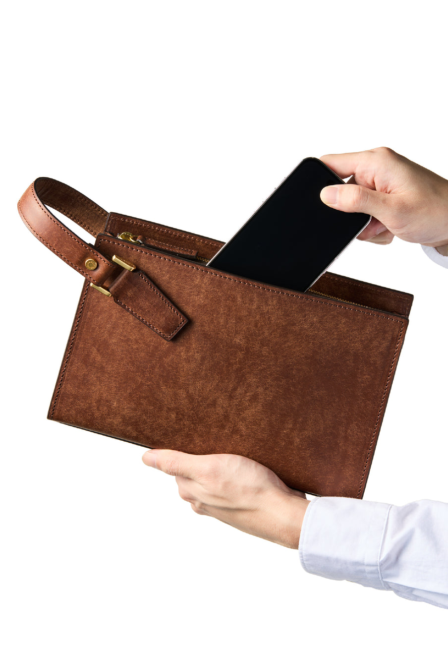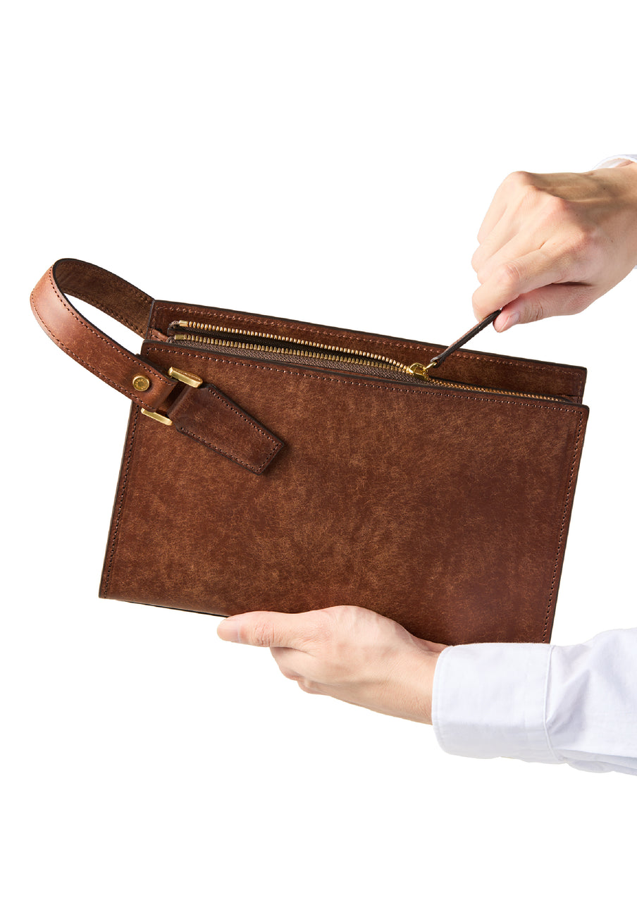 クラシカルな佇まいのセカンドバッグ。 表面にはプエブロレザー特有の起毛が広がり、使い込むほどに艶へと変化していきます。