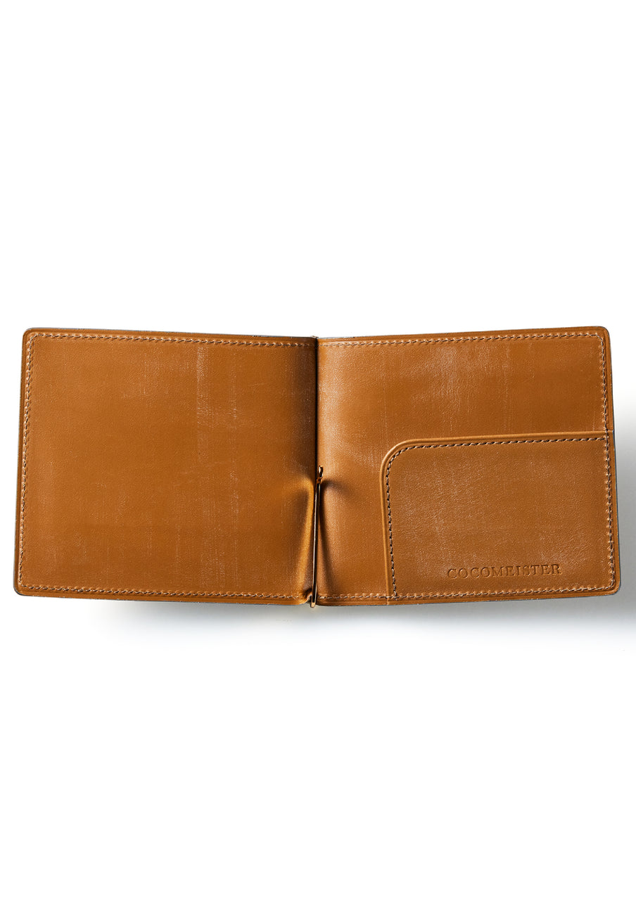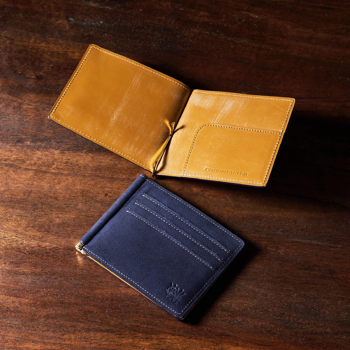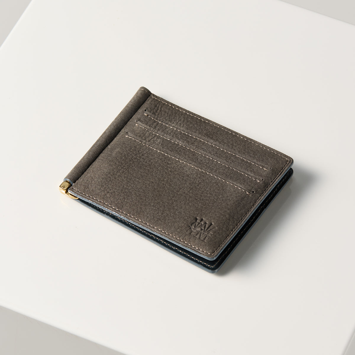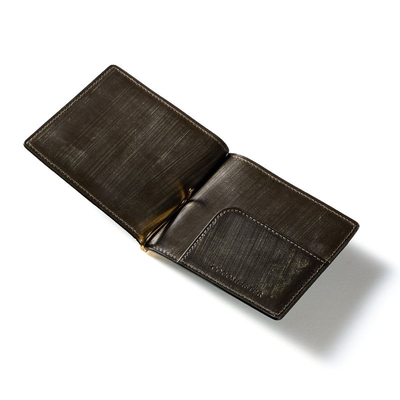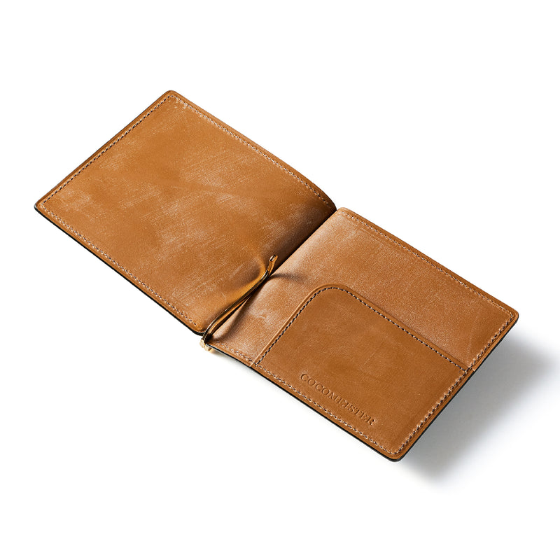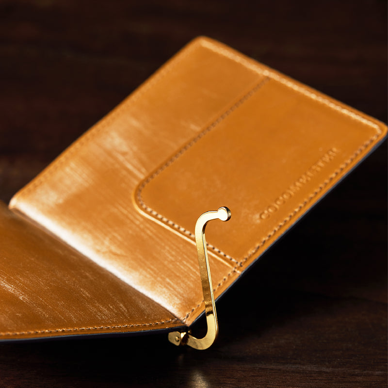 ゴールド色のクリップ金具を手前に起こすことで、お札を取り出すことが出来ます。クリップ金具はバネ式で、高性能です。右下に見えるカブセはお札を挟んだり、カード類を挟んだりするのにも使えます。