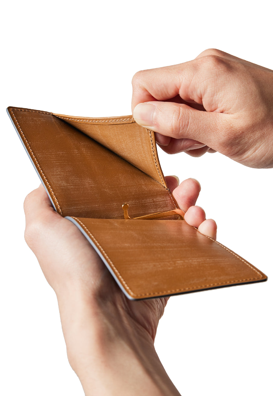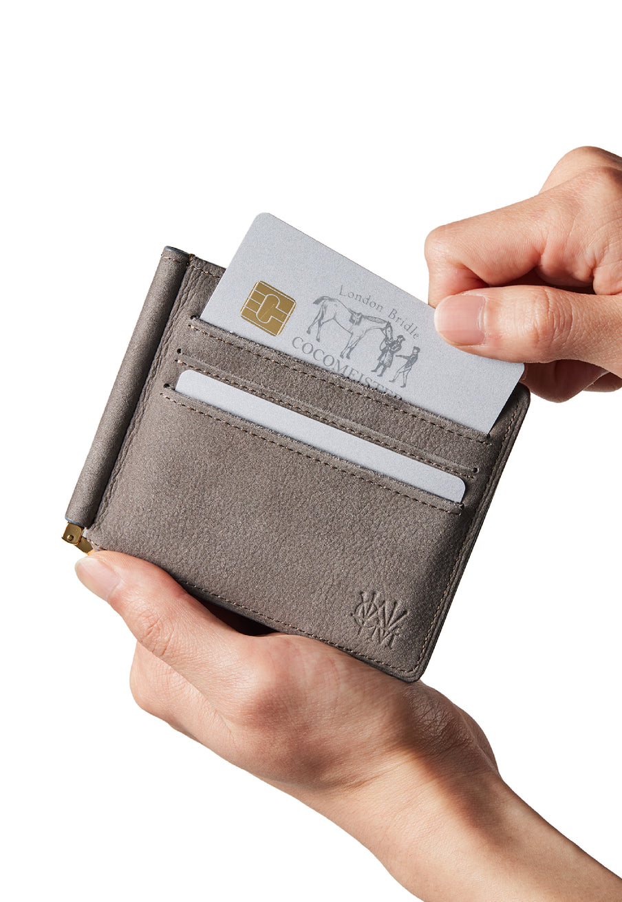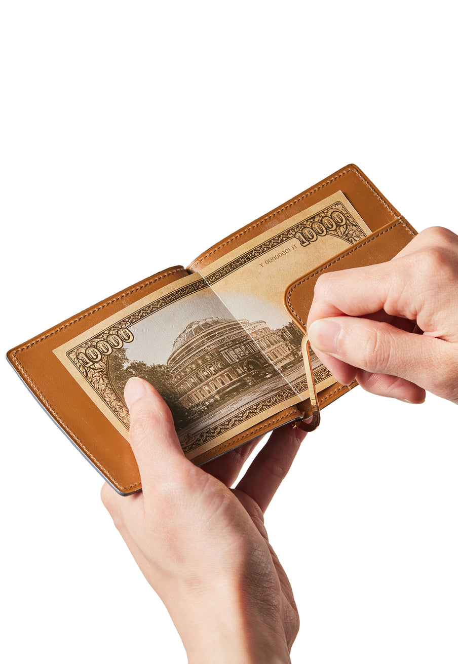 バネを寝かすことでお札を固定することが出来ます。枚数が少なければ、金具がこの状態であっても上からスッと取り出すことも出来ます。金具を寝かすときはバネの力でバチんと心地よく閉じます。
