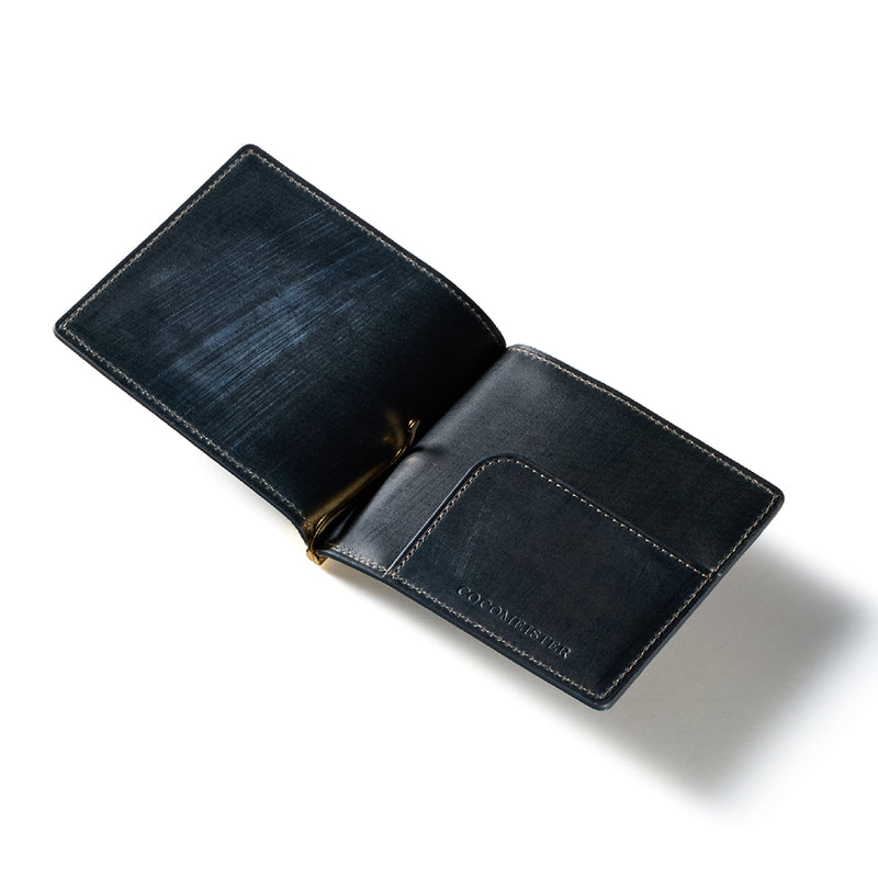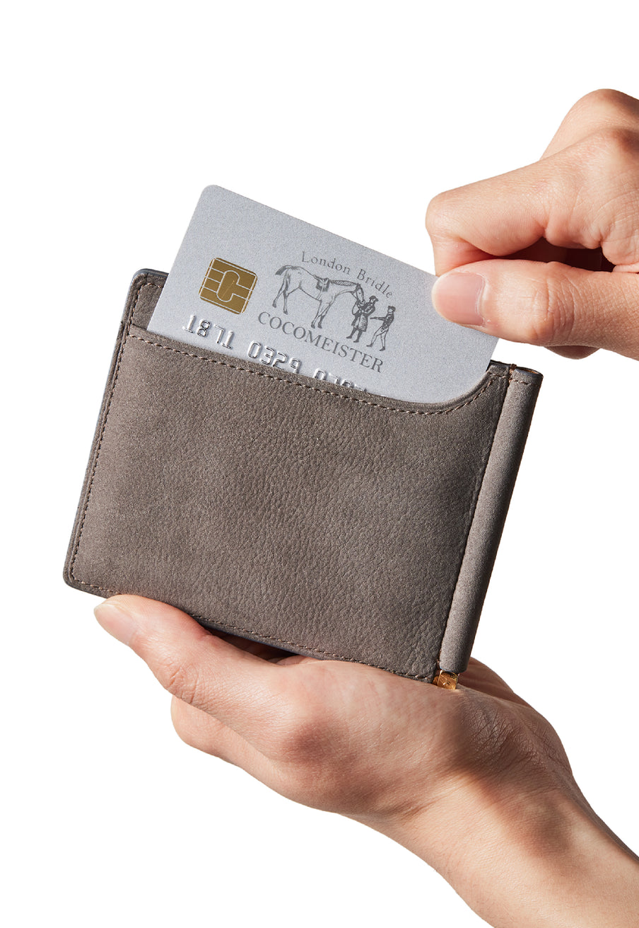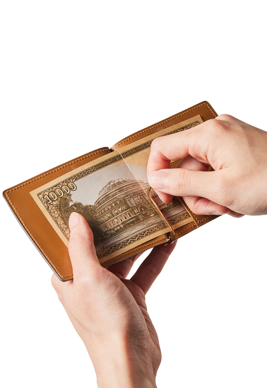 バネを寝かすことでお札を固定することが出来ます。枚数が少なければ、金具がこの状態であっても上からスッと取り出すことも出来ます。金具を寝かすときはバネの力でバチんと心地よく閉じます。