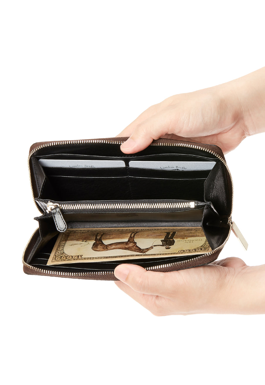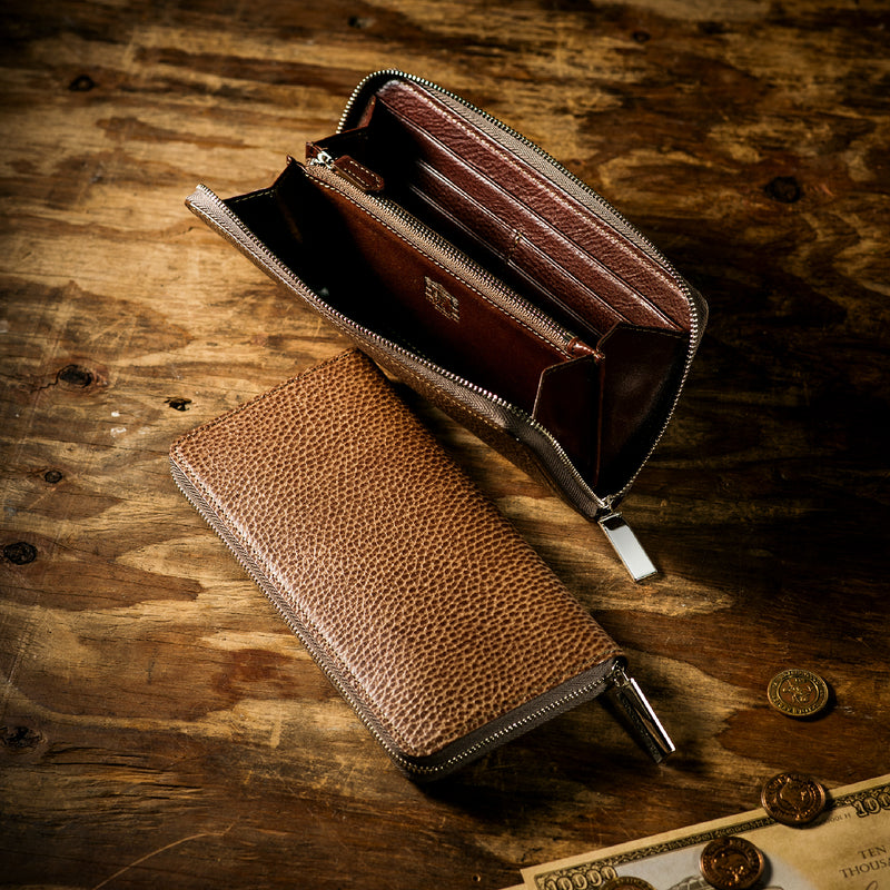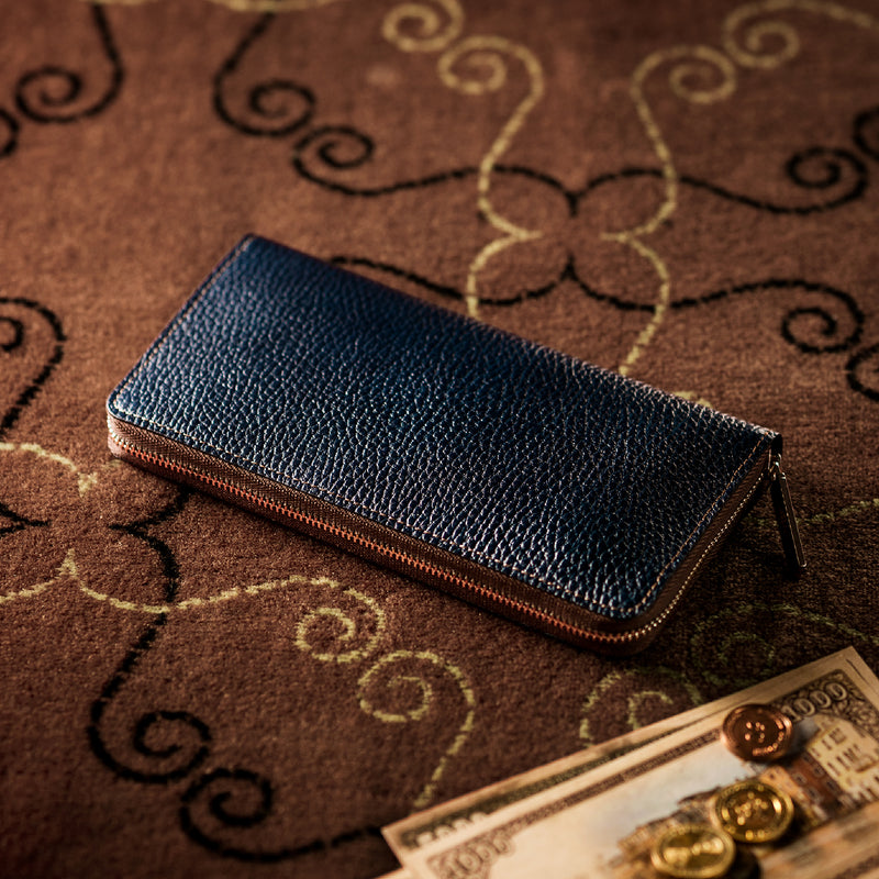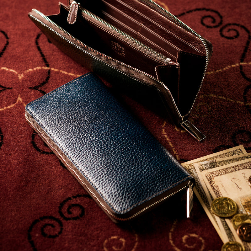 手に持っても様になる重厚なフォルムがこのラウンドジップ長財布の人気の秘訣です。手に持って歩いてもお洒落、鞄に入れても格好よく手に馴染む革の質感もお洒落です。