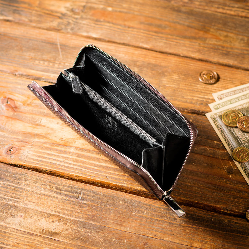 イタリアの情熱的な石畳をイメージしたロッソピエトラコレクションです。外装を石畳に、内装はレンガをイメージしたイタリアらしい風合いが魅力的なレザーアイテム。ラウンドジップ型の財布は、中身を落とすことなく使えます、また天然皮革の重厚感を楽しめるデザインですので硬派な紳士の方にもオススメの長財布です。| 外寸 | 縦9.5cm×横19cm×厚さ2.5cm |