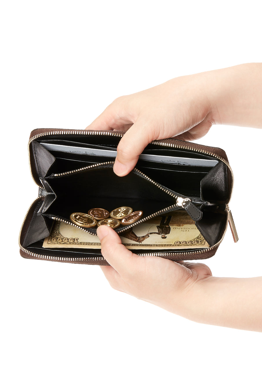 両サイドにはカードポケットがあり、センターには小銭入れが付いています。両サイドの空きスペースにはお札を収納できます。