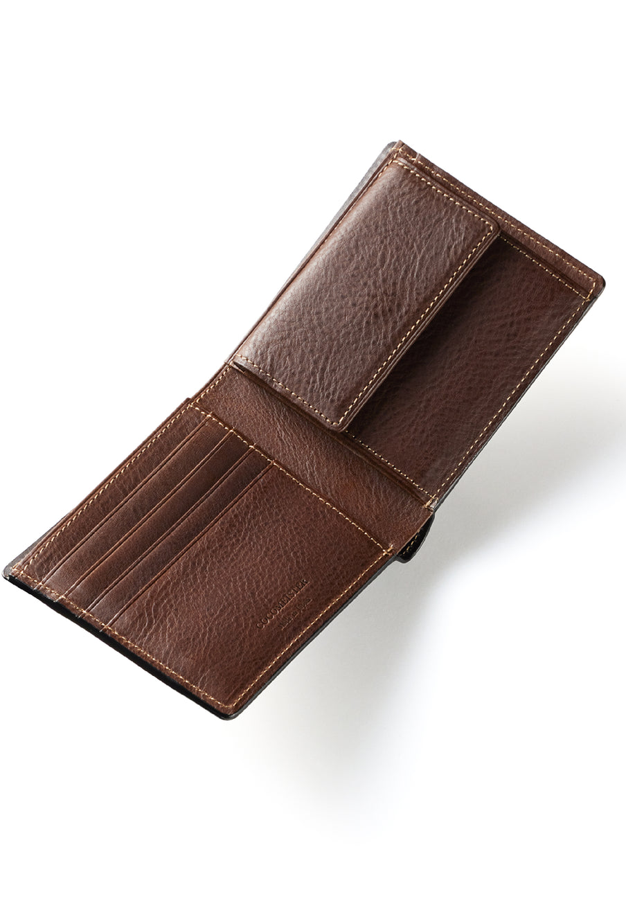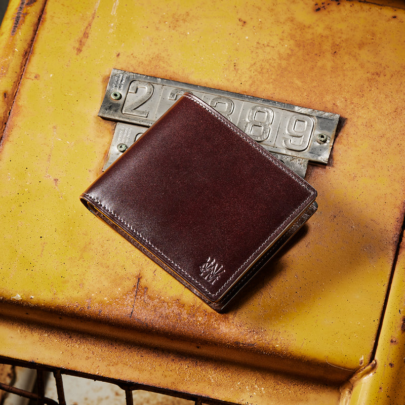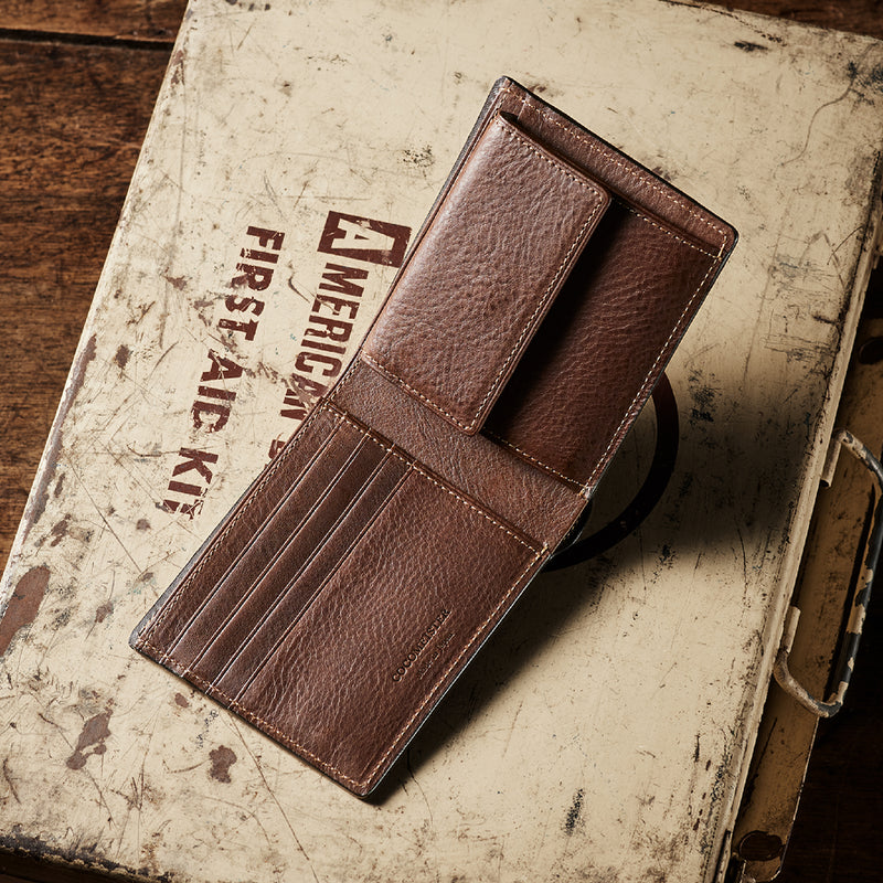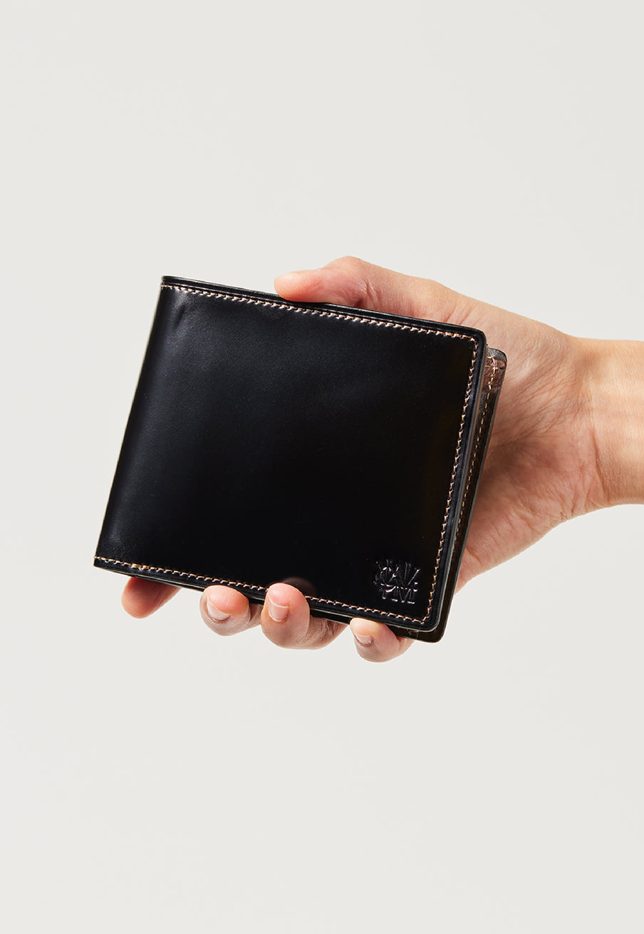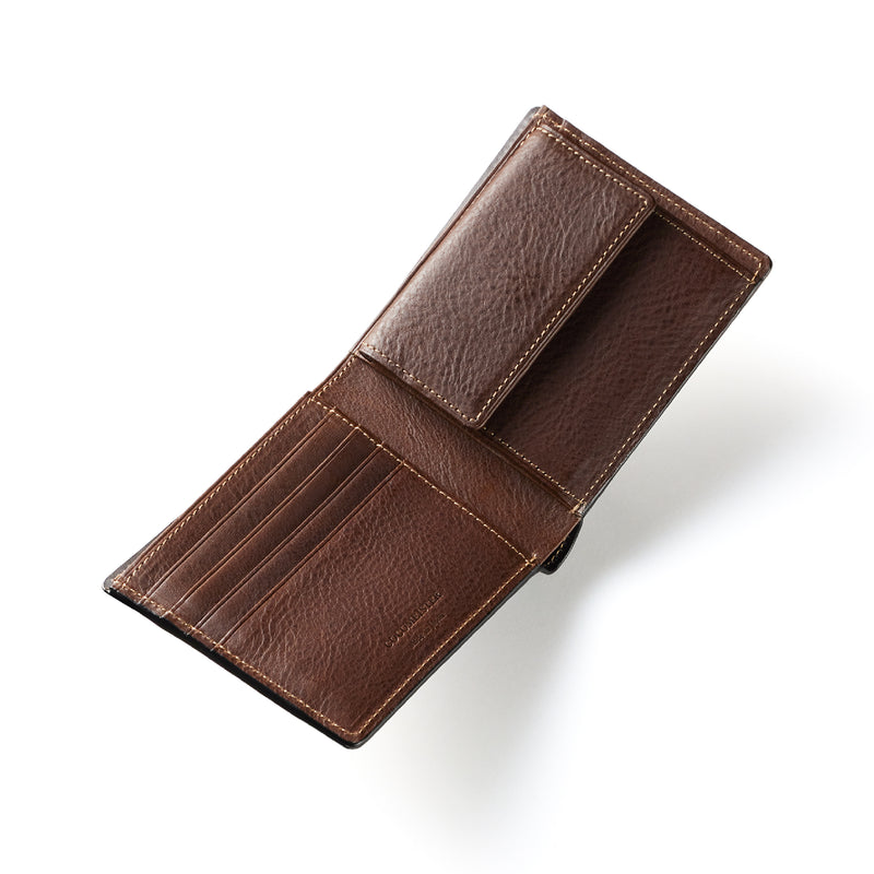 柔らかい革素材で、カードの出し入れがし易いのが魅力です。オールレザーで作られており、コードバンも外装には使用していますが、使い易いのもこの2つ折り財布の特徴です。