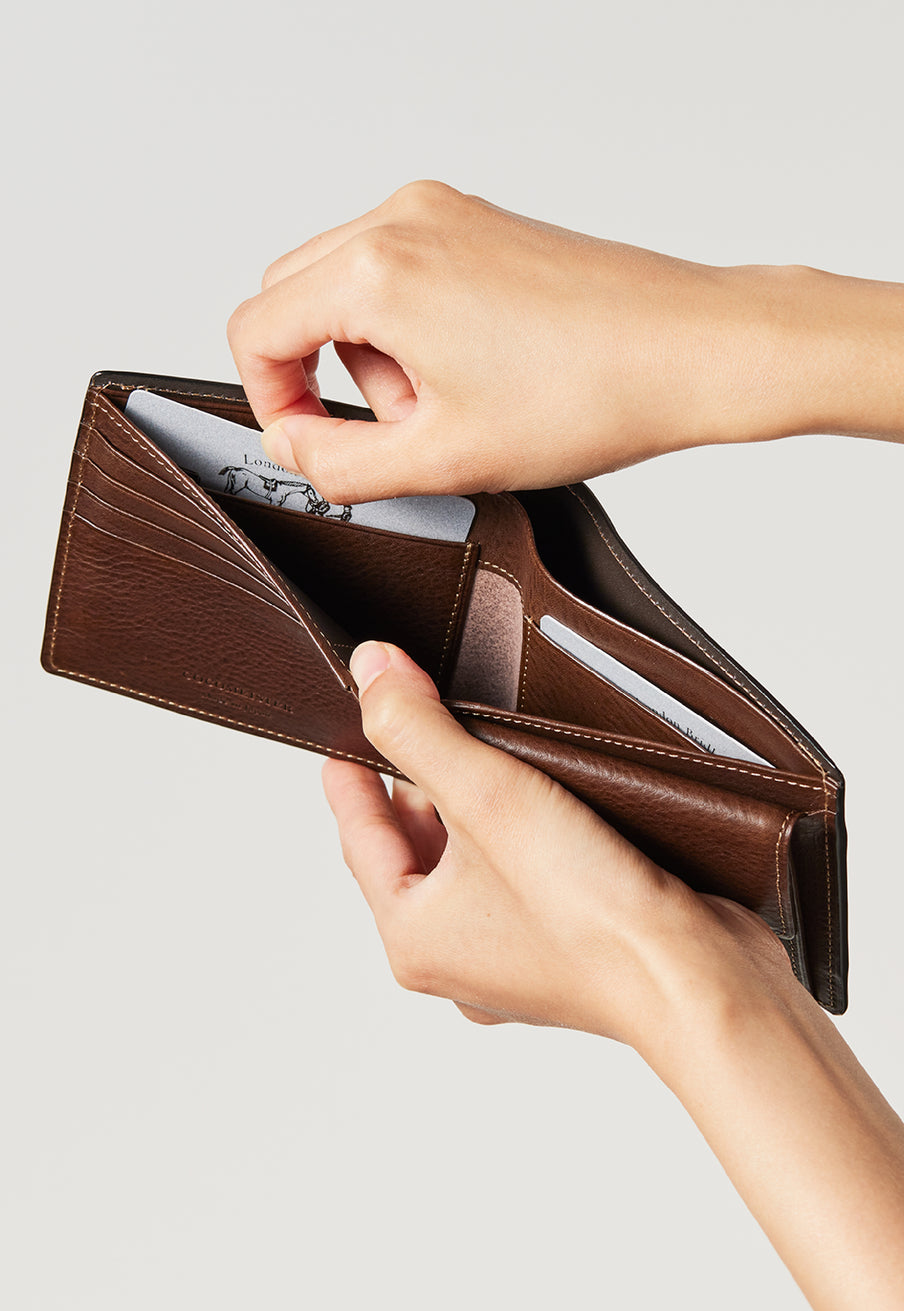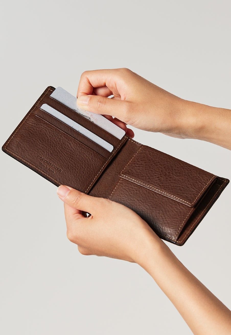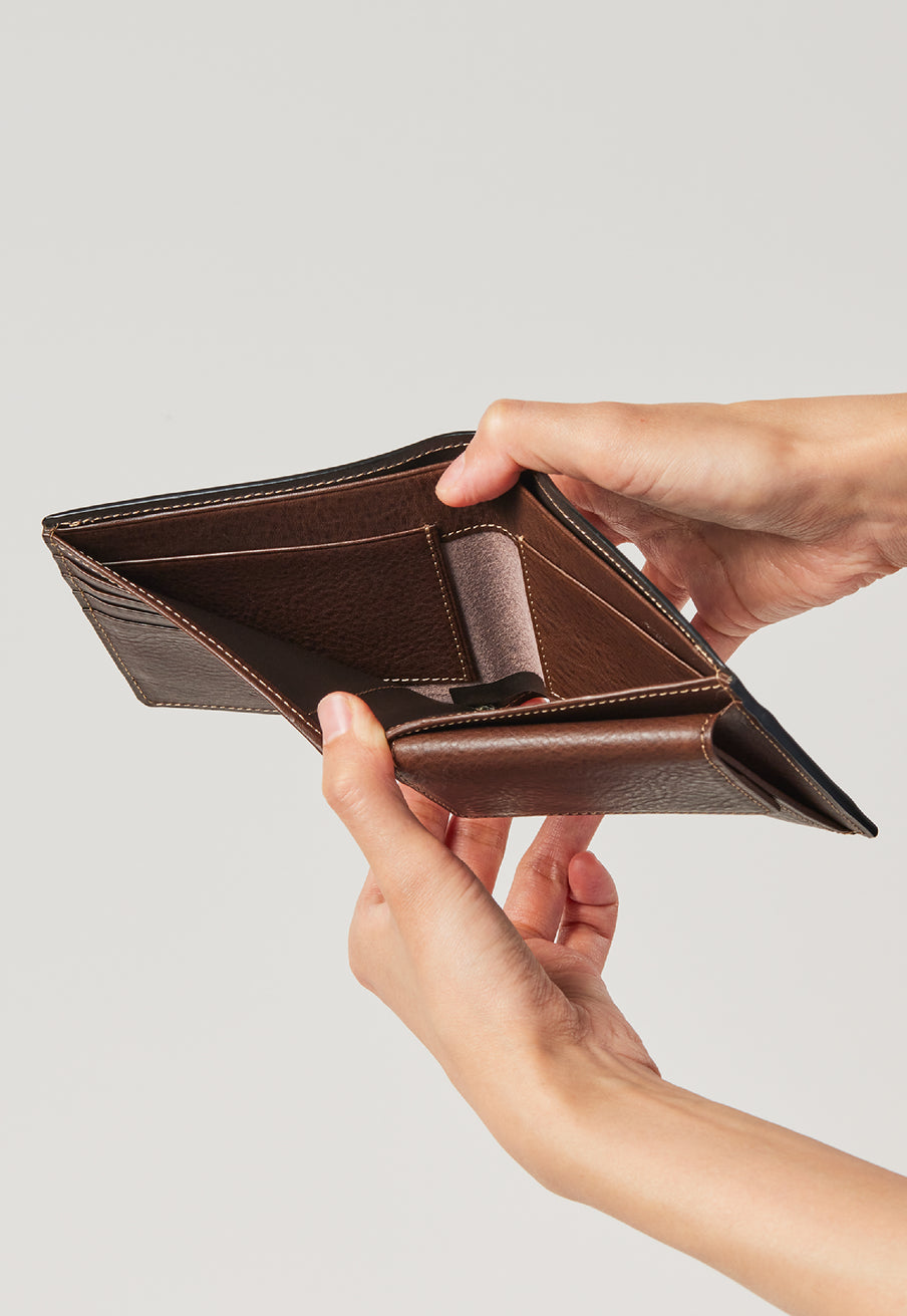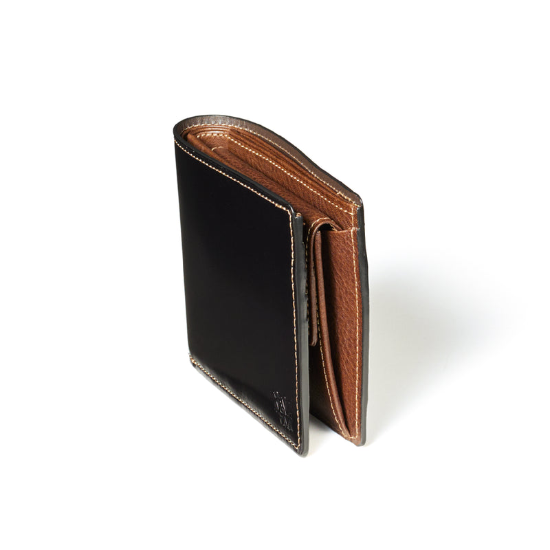 柔らかい革素材で、カードの出し入れがし易いのが魅力です。オールレザーで作られており、コードバンも外装には使用していますが、使い易いのもこの2つ折り財布の特徴です。