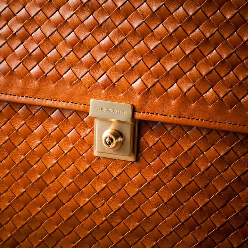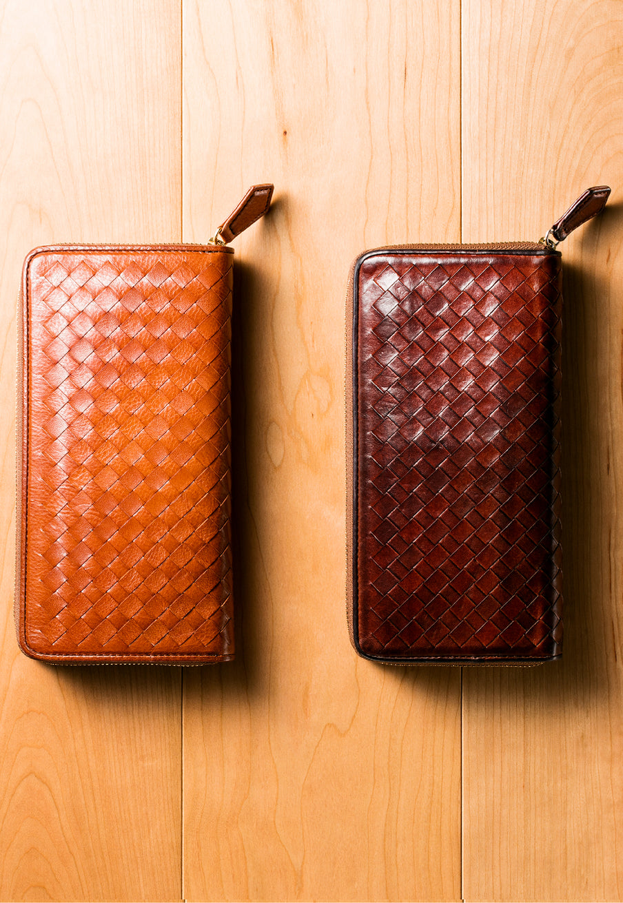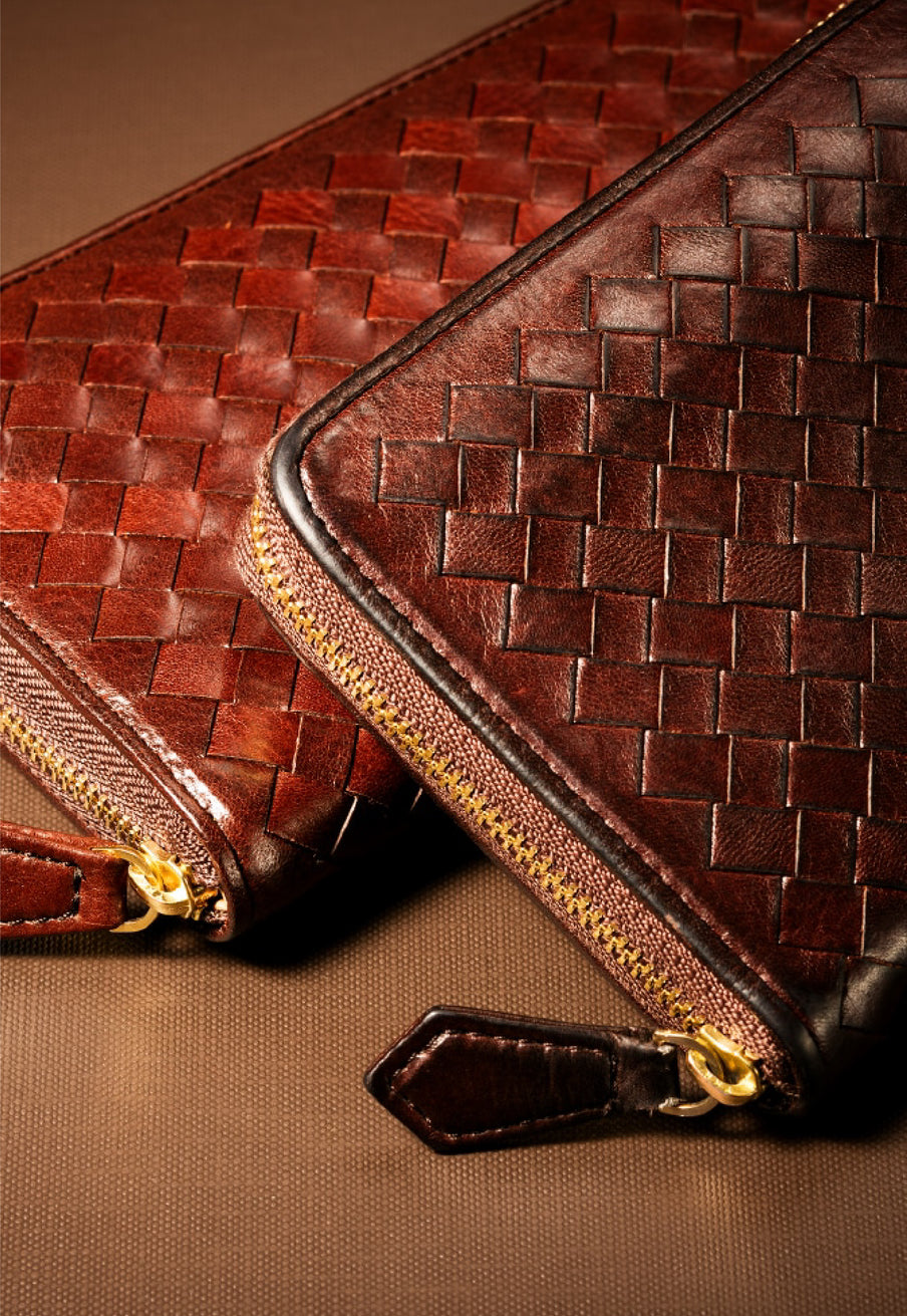 ボディ部分はイタリアンレザーを編み込んだデザイン、日本の熟練職人により丁寧に編み込まれている。