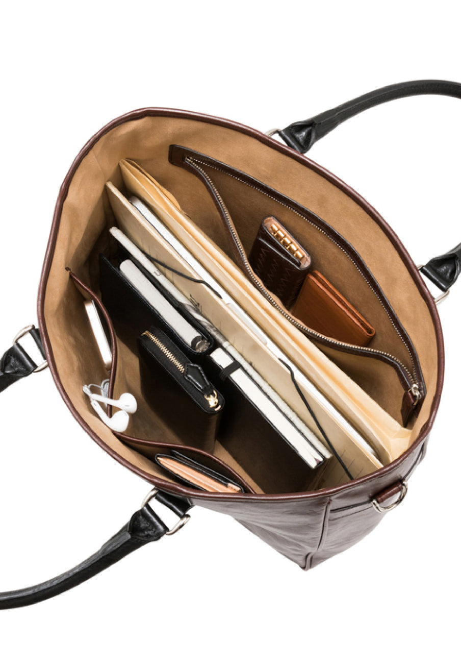 中身は見た目以上に大容量。パソコンから書類などを十分に収納できるスペースが良い。ザックリ使えてスピーディ。