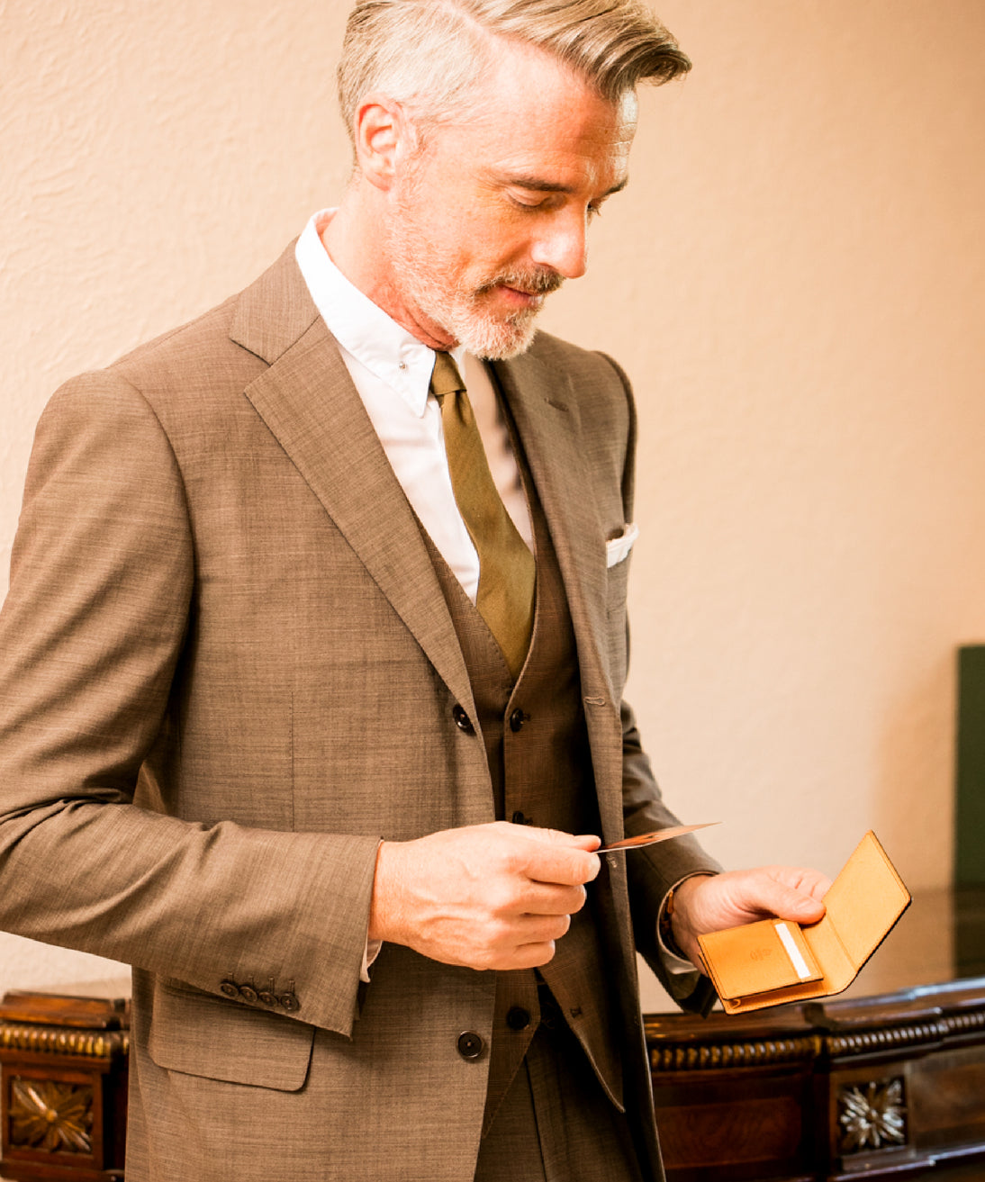 名刺を取り出す際も上質な革製品とのコントラストがとても上品に魅せてくれます。手に馴染む天然皮革が特別な時間を演出してくれます。